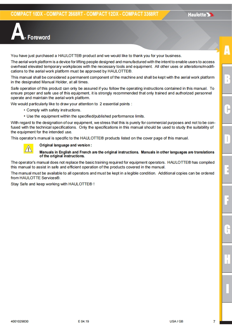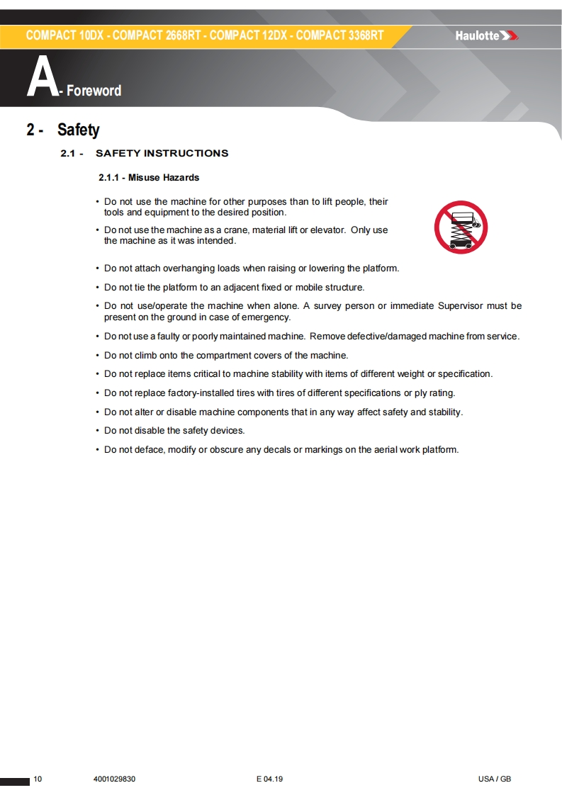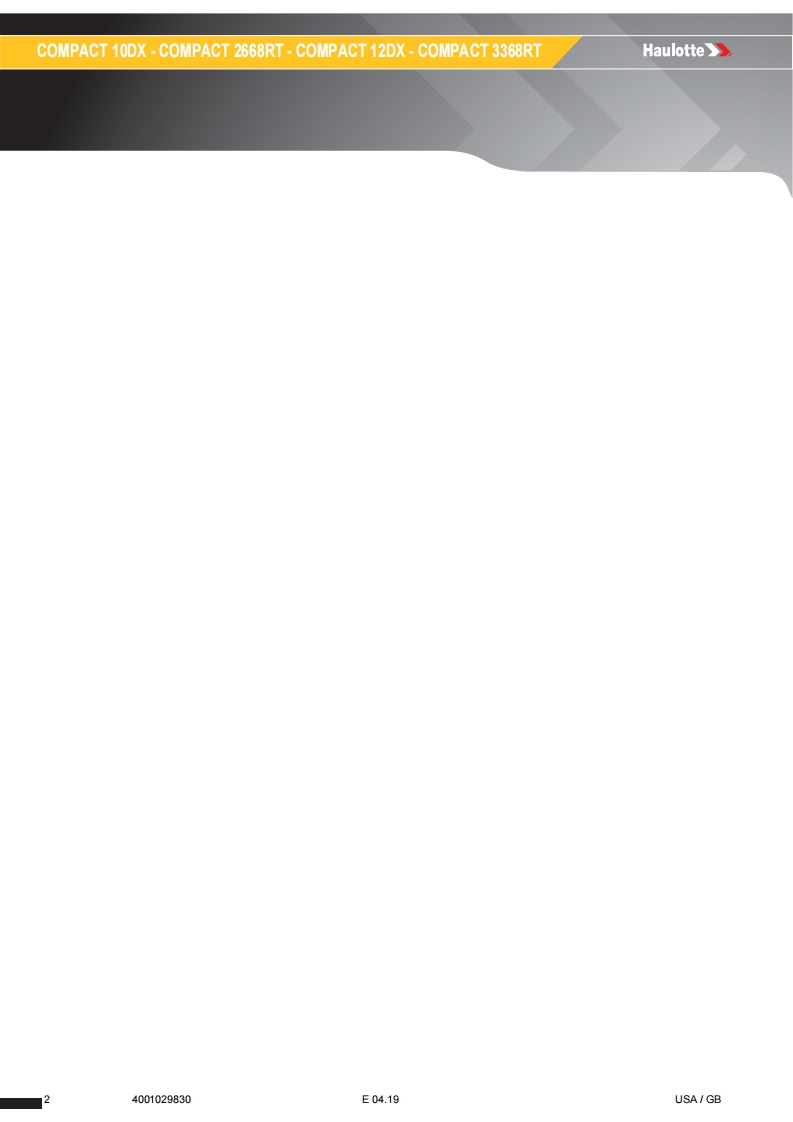 Haulotte-Compact-12-DX-Operations-Manual操作与维护保养说明书手册找手册网6小时前发布关注私信16.27MB100页043Haulotte-Compact-12-DX-Operations-Manual操作与维护保养说明书手册此内容为付费资源,请付费后查看¥19¥21黄金会员免费钻石会员免费立即购买您当前未登录!建议登陆后购买,可保存购买订单付费资源 第1页 / 共100页 第2页 / 共100页 第3页 / 共100页 第4页 / 共100页 第5页 / 共100页 第6页 / 共100页 第7页 / 共100页 第8页 / 共100页 第9页 / 共100页 第10页 / 共100页 试读已结束,还剩90页,您可下载完整版后进行离线阅读 THE ENDSNORKEL/HAULOTTE 文本预览 Operator's manualHaulotte》Operator's manual957COMPACT 10DX-COMPACT 2668RT-COMPACT 12DX-COMPACT 3368RT4001029830E04.19USA/GB 查看更多 收起部分 喜欢就支持一下吧收藏