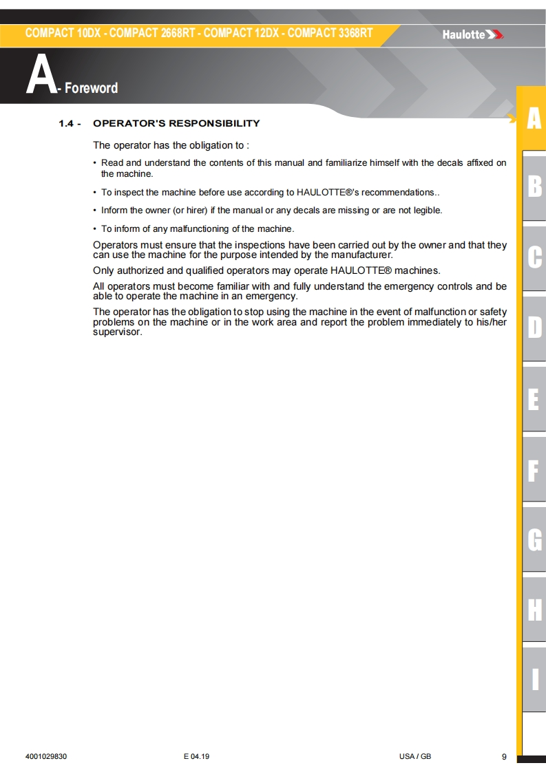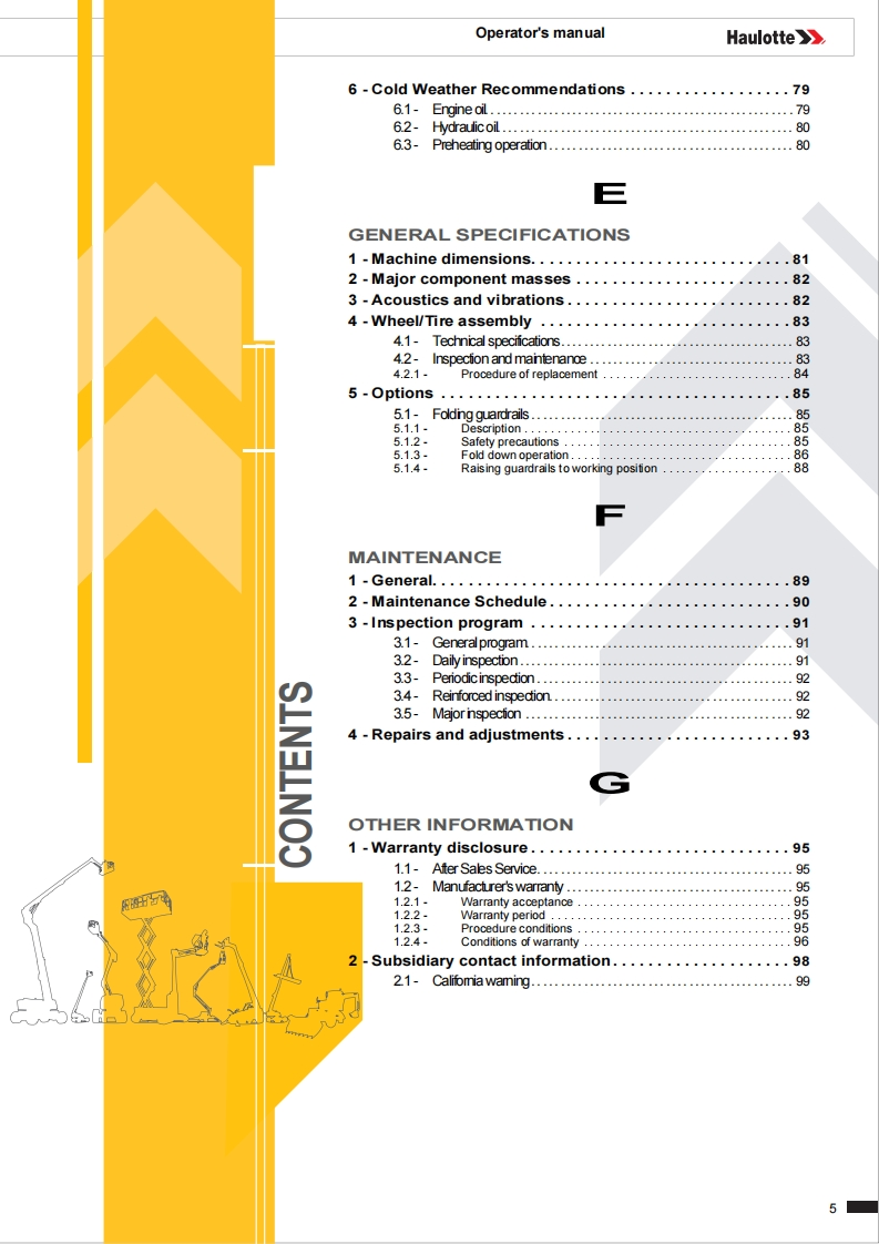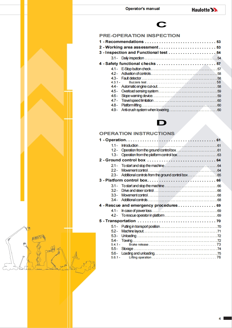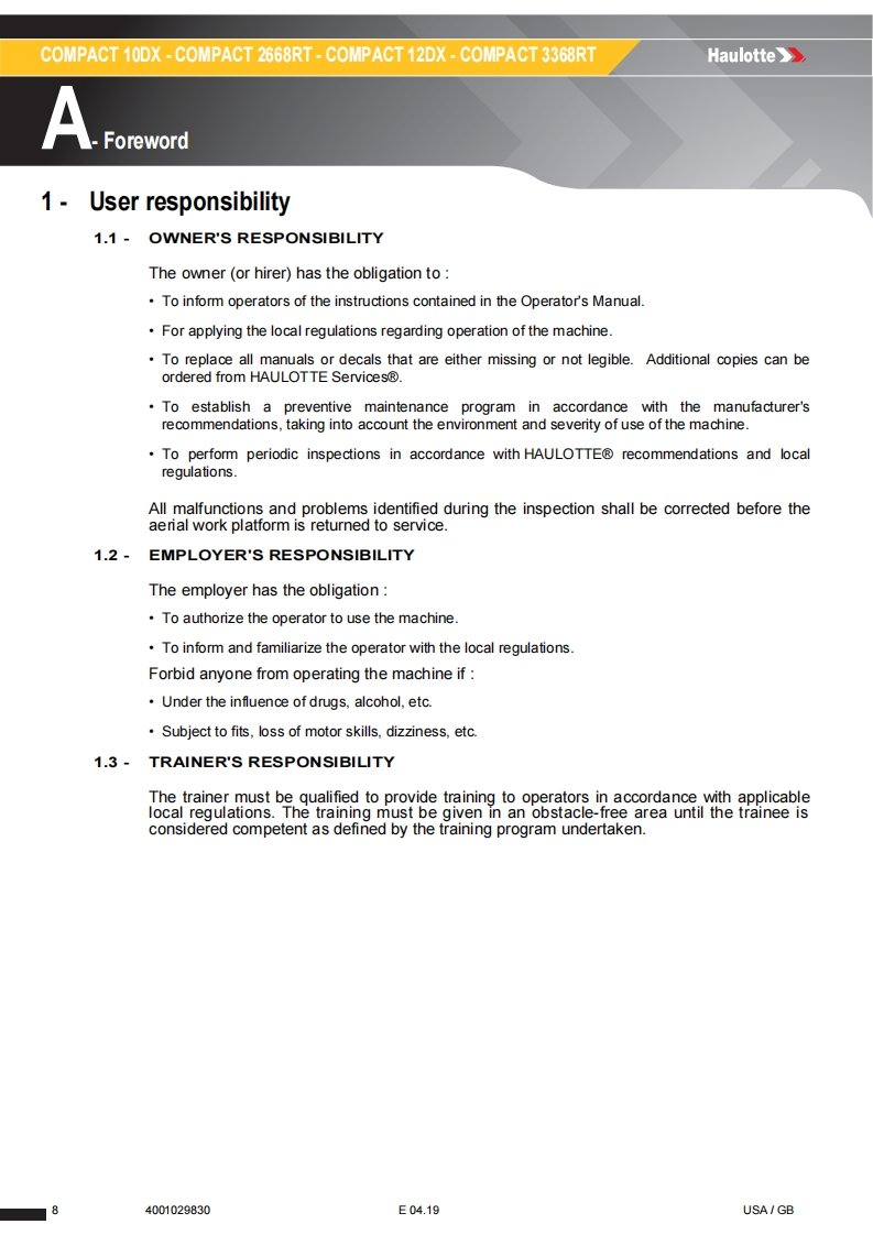 Haulotte-Compact-12-DX-Operations-Manual操作与维护保养说明书手册找手册网6小时前发布关注私信16.27MB100页043Haulotte-Compact-12-DX-Operations-Manual操作与维护保养说明书手册此内容为付费资源,请付费后查看¥19¥21黄金会员免费钻石会员免费立即购买您当前未登录!建议登陆后购买,可保存购买订单付费资源 第1页 / 共100页 第2页 / 共100页 第3页 / 共100页 第4页 / 共100页 第5页 / 共100页 第6页 / 共100页 第7页 / 共100页 第8页 / 共100页 第9页 / 共100页 第10页 / 共100页 试读已结束,还剩90页,您可下载完整版后进行离线阅读 THE ENDSNORKEL/HAULOTTE 文本预览 Operator's manualHaulotte》Operator's manual957COMPACT 10DX-COMPACT 2668RT-COMPACT 12DX-COMPACT 3368RT4001029830E04.19USA/GB 查看更多 收起部分 喜欢就支持一下吧收藏
