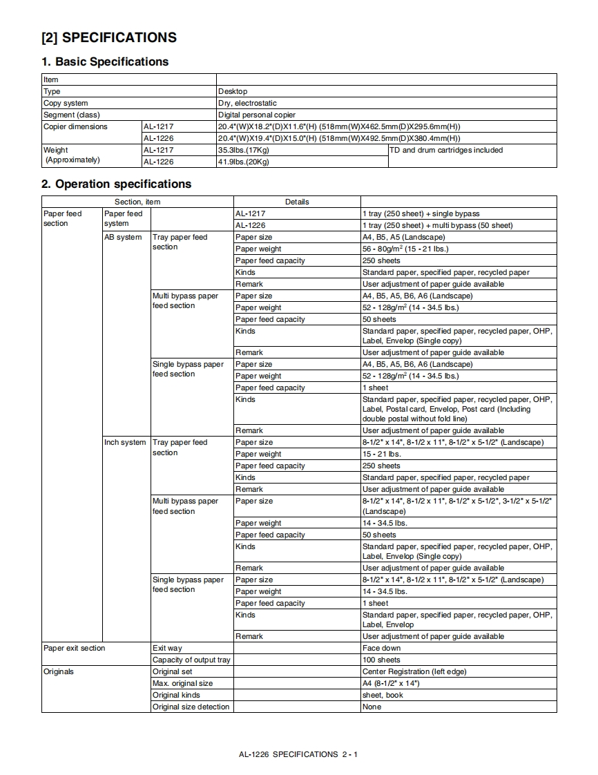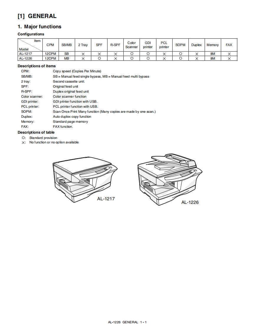 SHARPSERVICE MANUALCODE:00ZAL1226/A1EDIGITAL LASER COPIER/DIGITAL MULTIFUNCTIONALSYSTEMAL-1217(AL-1226)MODEL AL-1226CONTENTS[1 GENERAL........1-1[2]SPECIFICATIONS.......2-1[3]CONSUMABLE PARTS..........……….3-1[4 EXTERNAL VIEWS AND INTERNAL STRUCTURES .........4-1[5 UNPACKING AND INSTALLATION ........a...aa....5-1[6 COPY PROCESS..........6-1[7 OPERATIONAL DESCRIPTIONS.........................7-1[8 DISASSEMBLY AND ASSEMBLY........................8-1[9 ADJUSTMENTS................[10]SIMULATION,TROUBLE CODES....................10-1[11]USER PROGRAMS.....11-1[12]ELECTRICAL SECTION..........12-1[13]CIRCUIT DIAGRAM..........13-1Parts marked with"A"are important for maintaining the safety of the machine.Be sure to replace these partswith the replacement parts specified to maintain the safety and performance of the machine.This document has been published to be usedSHARP CORPORATIONfor after sales service only.The contents are subject to change without notice.