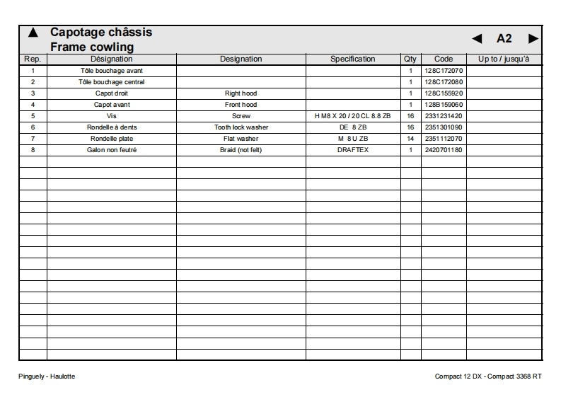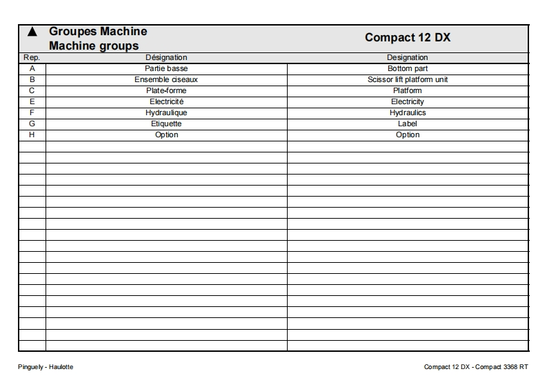 Pinguely-HaulotteCompact 12 DX-Compact 3368 RT2420320570-E06.03FPieces de rechangePezzi di ricambioGBSpare partsPecas sobressalentesDErsatzteileSReservdelNLOnderdelenSFVaraosa的DKReservedeleUSASpare partsEPiezas de repuestoCANSpare partsRPiese de schimbHaulotte°/PINGUELY HAULOTTE.LA PERONNIERE BP 9 42152 LHORME Tel.+33 (0)4 77 29 24 24.Fax SAV +33 (0)4 77 31 28 11 email haulotte@haulotte.com Web www.haulotte.com