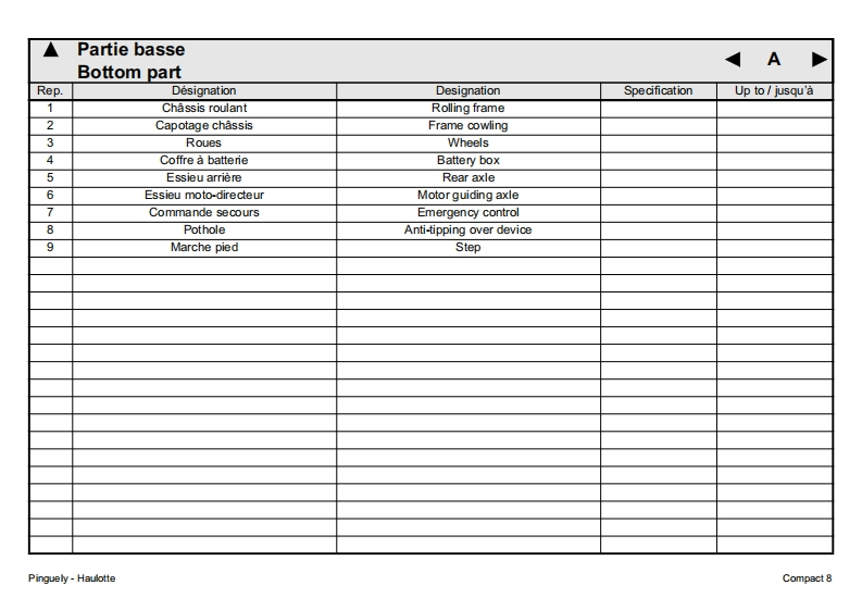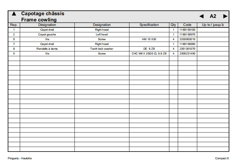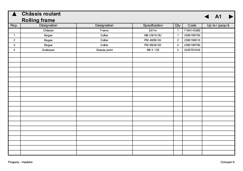 Pinguely HaulotteCompact 8FPieces de rechange2420315530GBSpare partsDErsatzteileNLOnderdelenDKReservedeleEPiezas de repuestoE11.00Pezzi di ricambioPPecas sobressalentesReservdelLa PeronniereTelephone:(33)0477292424BP9SFFax SAV:(33)0477312811Varaosa42152 L'HORMEIntemnet:http:/www.haulotte.comFRANCEE-Mail haulotte@haulotte.com(∈