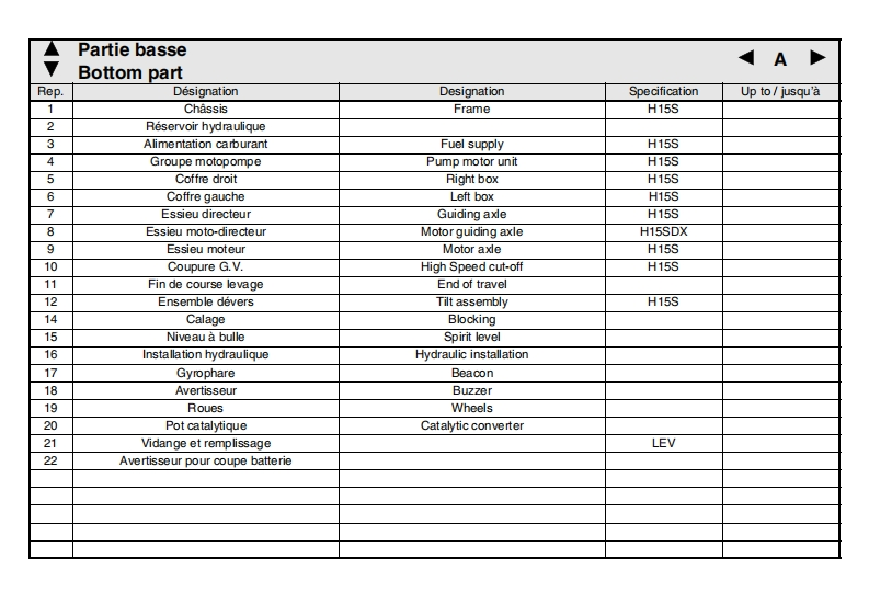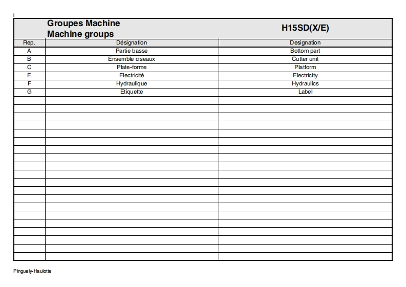 Pinguely HaulotteH15 SD (X/E)FPieces de rechange2420315850GBSpare partsDErsatzteileNLOnderdelenDKReservedeleE.01.01EPiezas de repuestoPezzi di ricambioPecas sobressalentesSReservdelLa PeronniereTelephone:(330477292424BP9SFFax SAV:(33)0477312811Varaosa42152 L'HORMEIntemnet:http:/www.haulotte.comFRANCEE-Mail haulotte@haulotte.com(∈