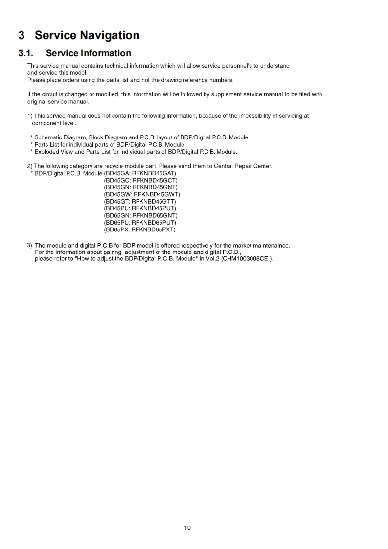 ORDER NO.CHM1003007CEService ManuaBlu-ray Disc PlayerModel No.DMP-BD45GADMP-BD45GCDMP-BD45GNDMP-BD45GWNotes:These model's BDP/Digital P.C.B.DMP-BD45GTModule are-RFKNBD45GATRFKNBD45GCTRFKNBD45GNTDMP-BD45PURFKNBD45GWTRFKNBD45GTTDMP-BD65GNRFKNBD45PUTRFKNBD65GNTDMP-BD65PURFKNBD65PUTRFKNBD65PXTDMP-BD65PXCaution:Vol.1Pairing of BD Drive and Digital P.C.B.as "BDP/Digital P.C.B.Module"have to be replaced together.ColourIf the either BD drive or Digital P.C.B.is changed,(K).Black TypeBD Drive unit has to be re-aligned.Because thealignment data for BD Drive Unit is stored in Digital P.C.B.Panasonic Corporation 2010.PanasonicUnauthorized copying and distribution is a violationof law.
