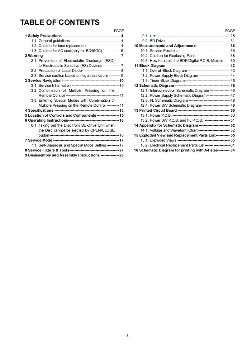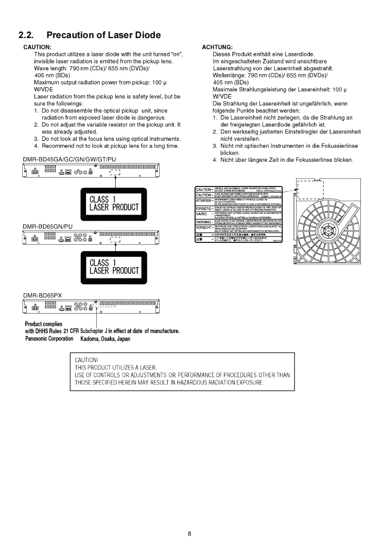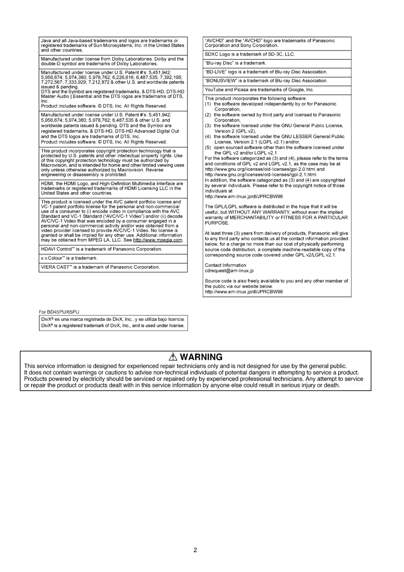 ORDER NO.CHM1003007CEService ManuaBlu-ray Disc PlayerModel No.DMP-BD45GADMP-BD45GCDMP-BD45GNDMP-BD45GWNotes:These model's BDP/Digital P.C.B.DMP-BD45GTModule are-RFKNBD45GATRFKNBD45GCTRFKNBD45GNTDMP-BD45PURFKNBD45GWTRFKNBD45GTTDMP-BD65GNRFKNBD45PUTRFKNBD65GNTDMP-BD65PURFKNBD65PUTRFKNBD65PXTDMP-BD65PXCaution:Vol.1Pairing of BD Drive and Digital P.C.B.as "BDP/Digital P.C.B.Module"have to be replaced together.ColourIf the either BD drive or Digital P.C.B.is changed,(K).Black TypeBD Drive unit has to be re-aligned.Because thealignment data for BD Drive Unit is stored in Digital P.C.B.Panasonic Corporation 2010.PanasonicUnauthorized copying and distribution is a violationof law.