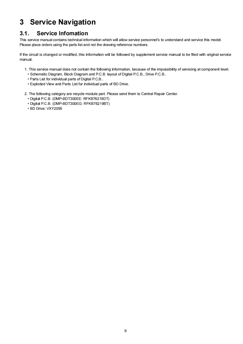 ORDER NO.DSD1003020CEService ManualBlu-ray Disc PlayerModel No.DMP-BDT300EEDMP-BDT300EGVol.1Colour(K)..Black TypeAWARNINGThis service information is designed for experienced repair technicians only and is not designed for use by the general publicIt does not contain warnings or cautions to advise non-technical individuals of potential dangers in attempting to service a product.Products powered by electricity should be serviced or repaired only by experienced professional technicians.Any attempt to serviceor repair the product or products dealt with in this service information by anyone else could result in serious injury or death.IMPORTANT SAFETY NOTICEThere are special components used in this equipment which are important for safety.These parts are marked by A in the SchematicDiagrams,Circuit Board Diagrams,Exploded Views and Replacement Parts List.It is essential that these critical parts should be replacedwith manufacturer's specified parts to prevent shock,fire or other hazards.Do not modify the original design without permission ofmanufacturer.Panasonic Corporation 2010 Unauthorized copy-Panasonicing and distribution is a violation of law.