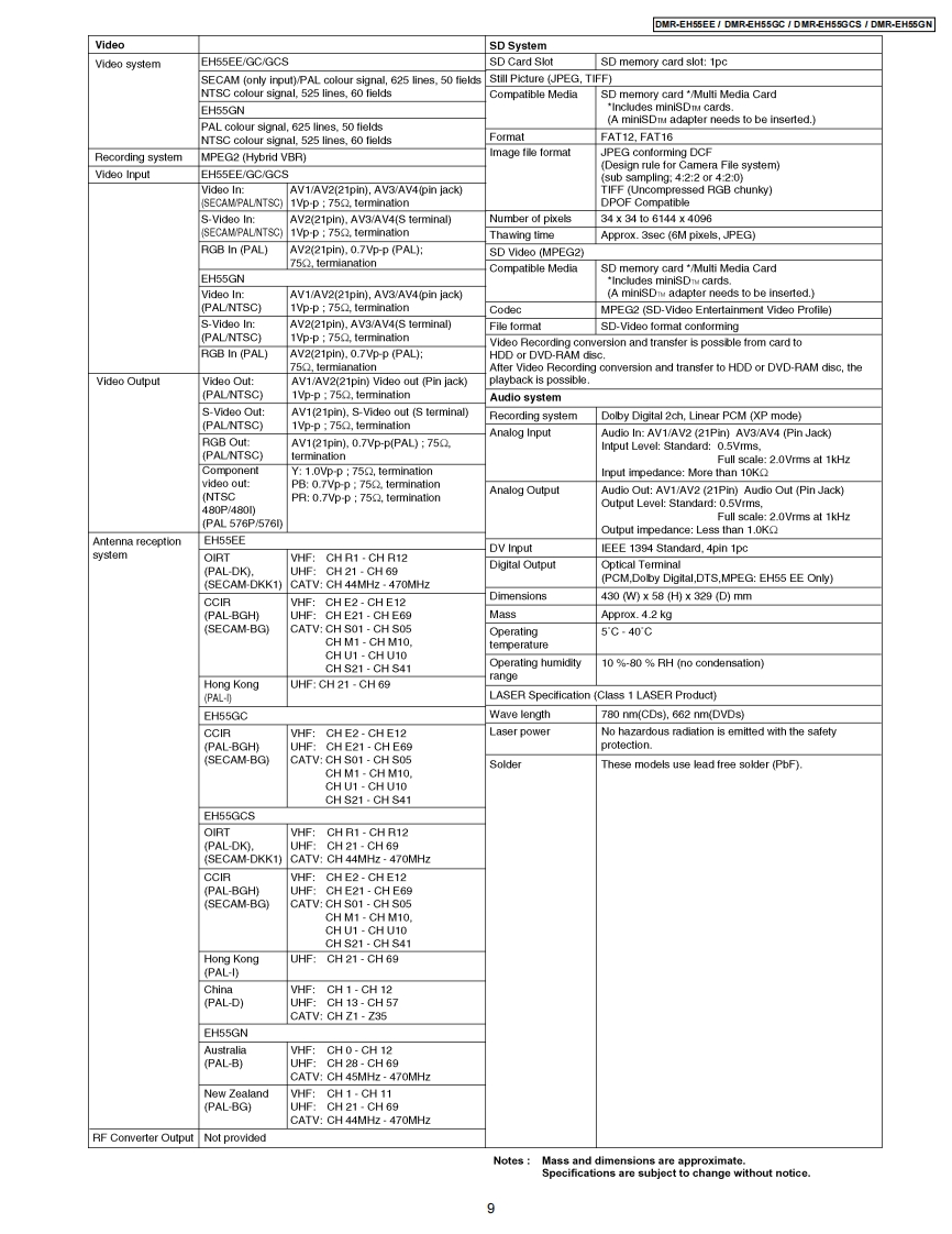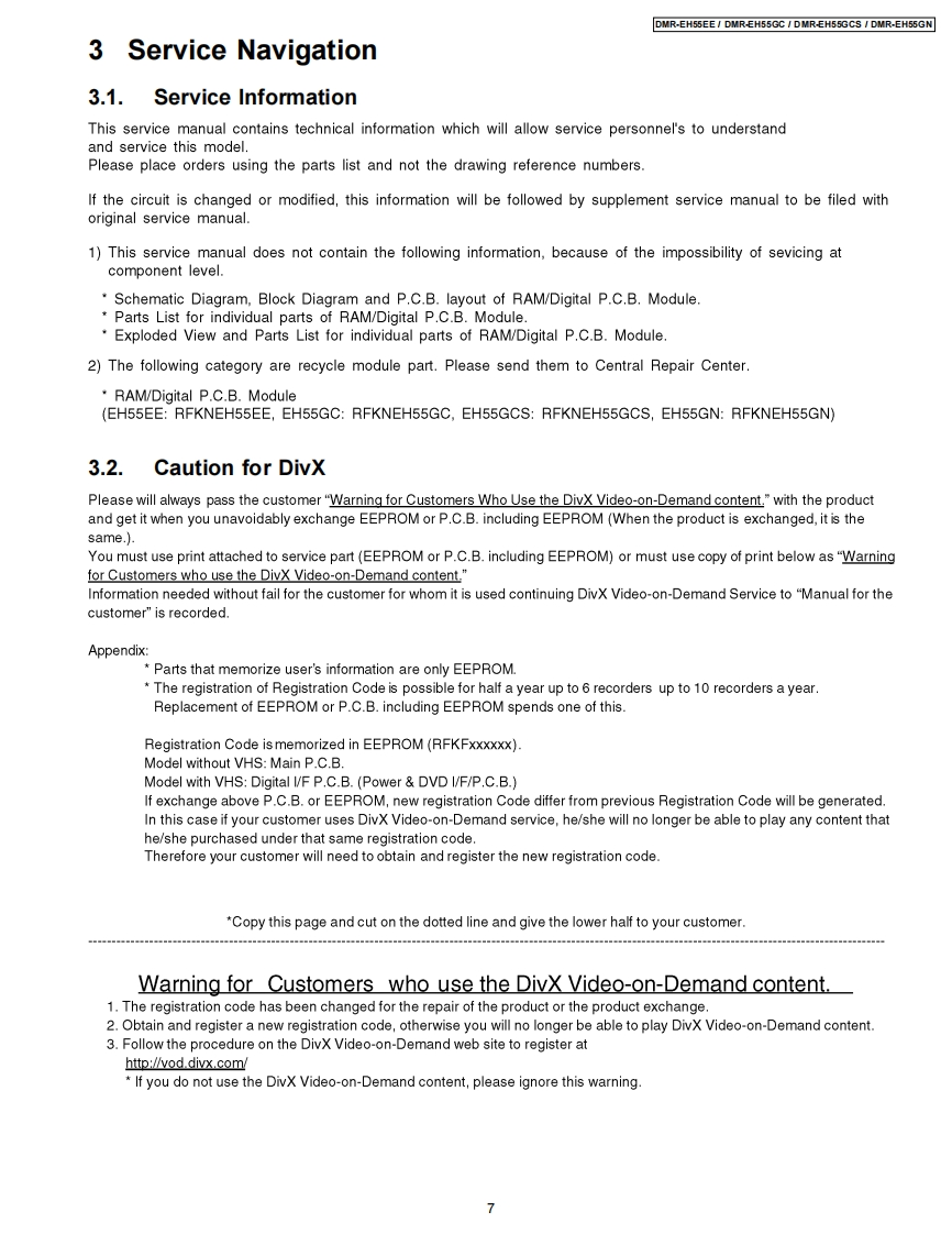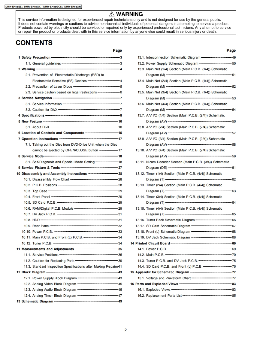 ORDER NO.CHM0604016CEService ManualDVD RecorderDMR-EH55EE○oo9oDMR-EH55GCNotes:This model's RAM/Digital P.C.B.DMR-EH55GCSModule are-RFKNEH55EE(EE)RFKNEH55GC(GC)DMR-EH55GN-RFKNEH55GCS(GCS)-RFKNEH55GN(GN).Vol.1When replacing Main P.C.B.or EEPROM,Colour"UNFORMAT"indication is displayed and HDD must be(S).Sjlver Typeformatted.When replacing HDD,it is necessary to updatethe firmware.Please prepare the update disc.(After that,FORMAT is necessary)After that,programme in the HDD will be lost.In detail,please refer to each content in this servicemanual.Caution:Pairing of RAM Drive and Digital P.C.B.as "RAM/Digital P.C.B.Module"have to be replaced together.If the pairing is changed,RAM Drive unit has to bere-aligned.Because the alignment data for RAM DriveUnit is stored in Digital P.C.B..Manufactured under license from Dolby Laboratories."Dolby"andThis product incorporates copyright protection technology that isthe double-D symbol are trademarks of Dolby Laboratories.protected by method claims of certain U.S.patents and otherintellectual property rights owned by Macrovision Corporation and"DTS"and"DTS 2.0+Digital Out"are trademarks of Digitalother rights owners.Use of this copyright protection technologyTheater Systems,Inc.must be authorized by Macrovision Corporation,and is intendedfor home and other limited viewing uses only unless otherwiseauthorized by Macrovision Corporation.Reverse engineering orminiSDTM is a trademark of SD Card Association.disassembly is prohibited.Official DivX CertifiedTM product.·SD logo is a trademark.Plays DivX5,DivX4,DivX3,and DivX VOD video content (inPortions of this product are protected under copyright law andcompliance with DivX CertifiedTM technical requirements).are provided under license by ARIS/SOLANA/4C.DivX,DivX Certified,and associated logos are trademarks ofDivXNetworks,Inc.and are used under license.G-CoDE is a registered trademark of Gemstar DevelopmentCorporation.The G-CoDE system is manufactured under licensefrom Gemstar Development Corporation.Panasonic2006 Matsushita Electric Industrial Co.,Ltd.Allrights reserved.Unauthorized copying anddistribution is a violation of law.