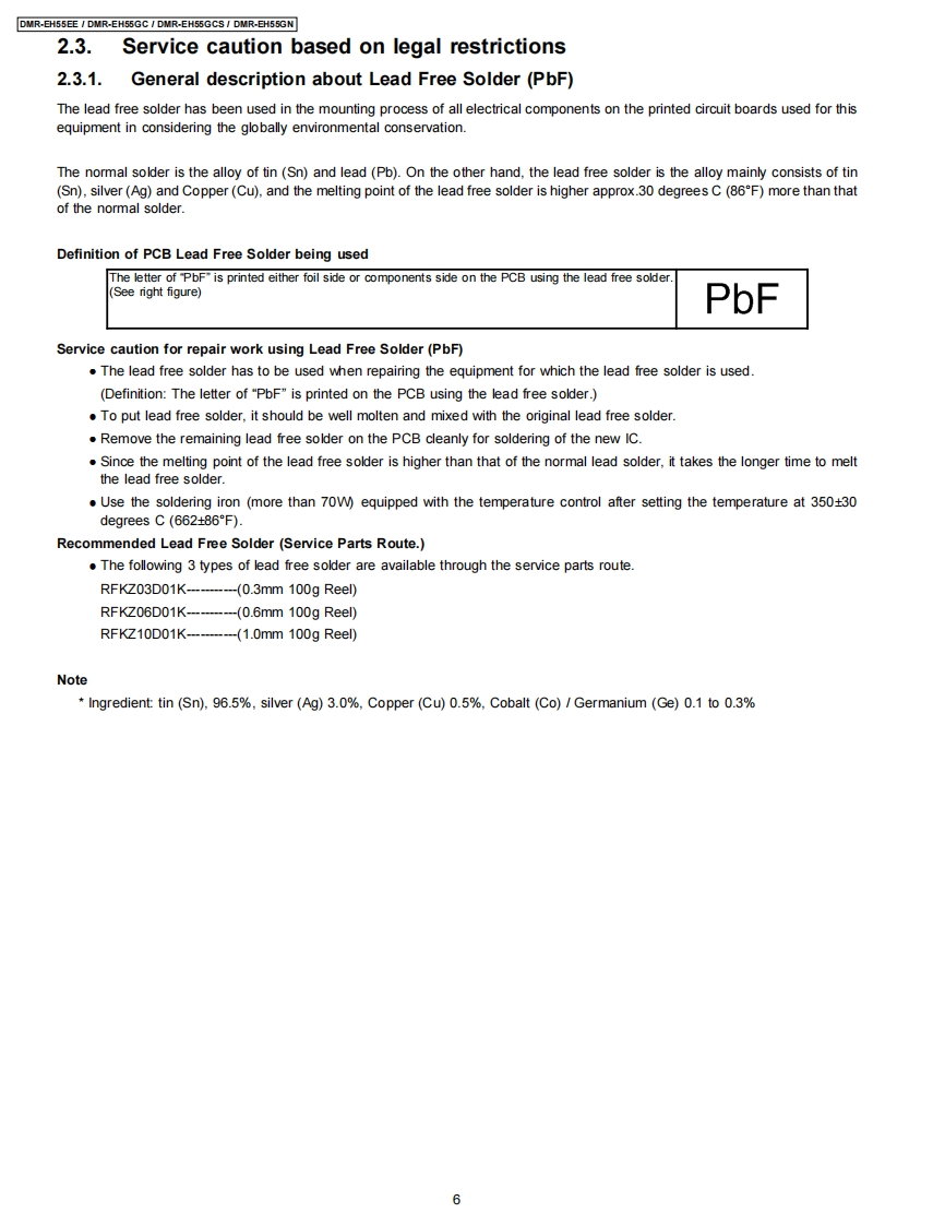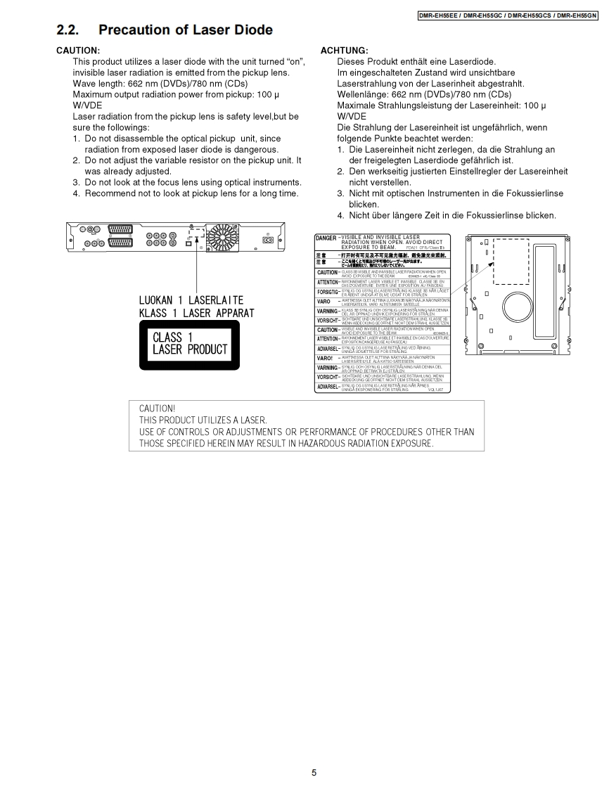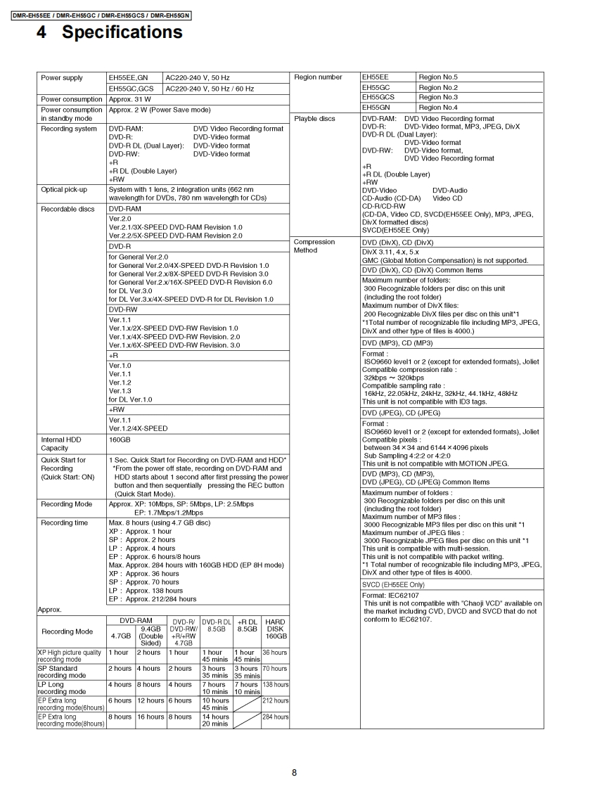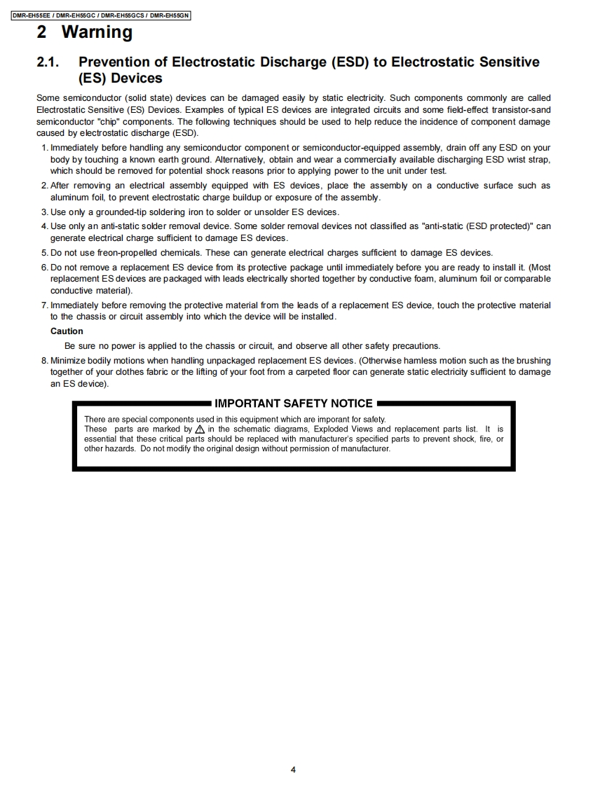 ORDER NO.CHM0604016CEService ManualDVD RecorderDMR-EH55EE○oo9oDMR-EH55GCNotes:This model's RAM/Digital P.C.B.DMR-EH55GCSModule are-RFKNEH55EE(EE)RFKNEH55GC(GC)DMR-EH55GN-RFKNEH55GCS(GCS)-RFKNEH55GN(GN).Vol.1When replacing Main P.C.B.or EEPROM,Colour"UNFORMAT"indication is displayed and HDD must be(S).Sjlver Typeformatted.When replacing HDD,it is necessary to updatethe firmware.Please prepare the update disc.(After that,FORMAT is necessary)After that,programme in the HDD will be lost.In detail,please refer to each content in this servicemanual.Caution:Pairing of RAM Drive and Digital P.C.B.as "RAM/Digital P.C.B.Module"have to be replaced together.If the pairing is changed,RAM Drive unit has to bere-aligned.Because the alignment data for RAM DriveUnit is stored in Digital P.C.B..Manufactured under license from Dolby Laboratories."Dolby"andThis product incorporates copyright protection technology that isthe double-D symbol are trademarks of Dolby Laboratories.protected by method claims of certain U.S.patents and otherintellectual property rights owned by Macrovision Corporation and"DTS"and"DTS 2.0+Digital Out"are trademarks of Digitalother rights owners.Use of this copyright protection technologyTheater Systems,Inc.must be authorized by Macrovision Corporation,and is intendedfor home and other limited viewing uses only unless otherwiseauthorized by Macrovision Corporation.Reverse engineering orminiSDTM is a trademark of SD Card Association.disassembly is prohibited.Official DivX CertifiedTM product.·SD logo is a trademark.Plays DivX5,DivX4,DivX3,and DivX VOD video content (inPortions of this product are protected under copyright law andcompliance with DivX CertifiedTM technical requirements).are provided under license by ARIS/SOLANA/4C.DivX,DivX Certified,and associated logos are trademarks ofDivXNetworks,Inc.and are used under license.G-CoDE is a registered trademark of Gemstar DevelopmentCorporation.The G-CoDE system is manufactured under licensefrom Gemstar Development Corporation.Panasonic2006 Matsushita Electric Industrial Co.,Ltd.Allrights reserved.Unauthorized copying anddistribution is a violation of law.