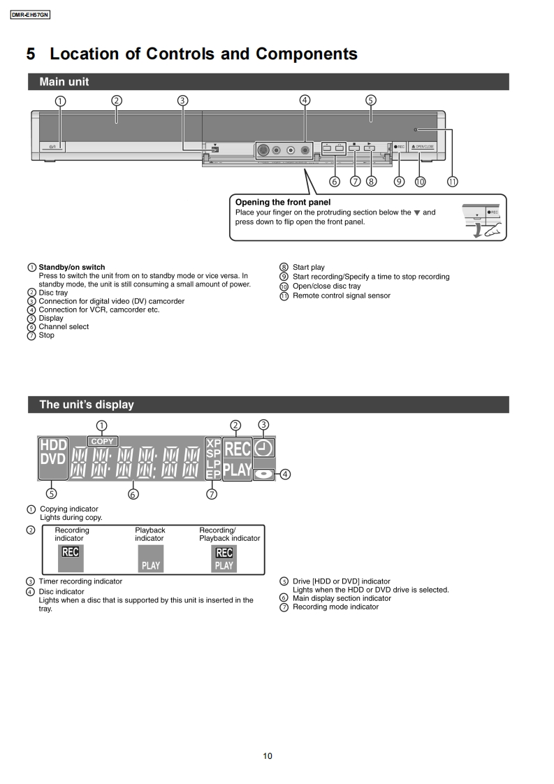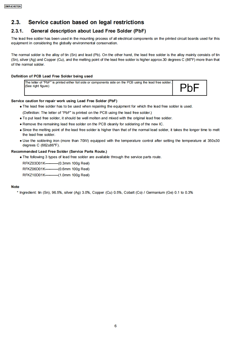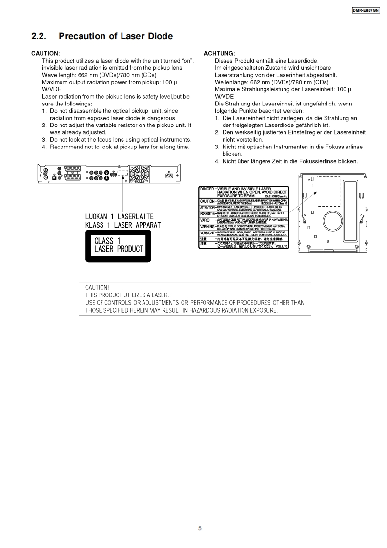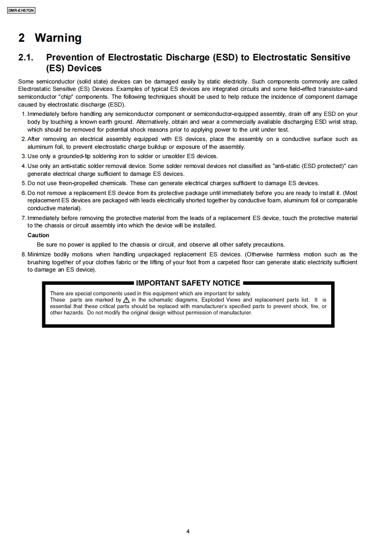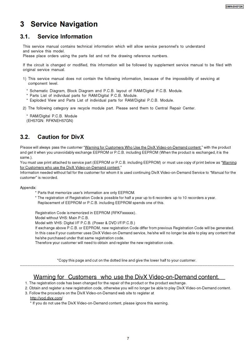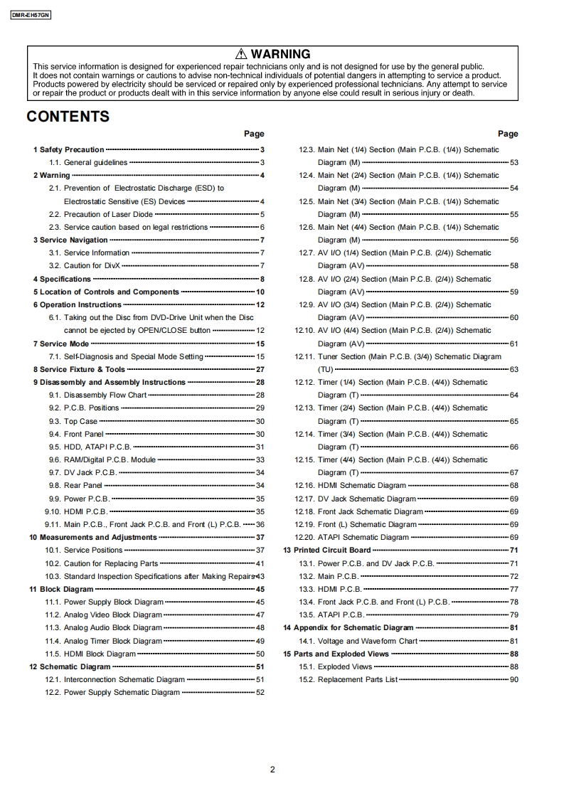 ORDER NO.CHM0705024CEService ManualDVD RecorderModel No.DMR-EH57GNVol.1ColourNotes:This model's RAM/Digital P.C.B.Module is-RFKNEH57GN(GN).(S).Silver Type(K).Black TypeWhen replacing Main P.C.B.or EEPROM,'UNFORMAT"indication is displayed and HDD must beformatted.When replacing HDD,it is necessary to updatethe firmware.Please prepare the update disc.(After that,FORMAT is necessary)After that,programme in the HDD will be lost.In detail,please refer to each content in this servicemanual.Caution:Pairing of RAM Drive and Digital PC.B.as "RAM/Digital P.C.B.Module"have to be replaced together.If the either RAM drive or Digital P.C.B.are changed,RAM Drive unit has to be re-aligned.Because thealignment data for RAM Drive Unit is stored in Digital PC.B.Manufactured under license from Dolby Laboratories.Official DivX Certified product.Dolby and the double-D symbol are trademarks of DolbyPlays all versions of DivXe video (including DivXe6)with standardLaboratories.playback of DivX media files.DivX,DivX Certified,and associated logos are trademarks of'DTS"is a registered trademark of DTS.Inc.and "DTSDivX,Inc.and are used under license.2.0+Digital Out"is a trademark of DTS,Inc.HDMI,the HDMI logo and High-Definition Multimedia InterfaceThis product incorporates copyright protection technology that isare trademarks or registered trademarks of HDMI Licensing LLCprotected by U.S.patents and other intellectual property rights.Use of this copyright protection technology must be authorizedHDAVI ControlTM is a trademark of Matsushita Electric Industrialby Macrovision,and is intended for home and other limitedconsumer uses only unless otherwise authorized byCo.,Ltd.Macrovision.Reverse engineering or disassembly is prohibited..SDHC Logo is a trademark..Portions of this product are protected under copyright law andare provided under license by ARIS/SOLANA/4C.Panasonic2007 Matsushita Electric Industrial Co.,Ltd.Allrights reserved.Unauthorized copyinganddistribution is a violation of law.