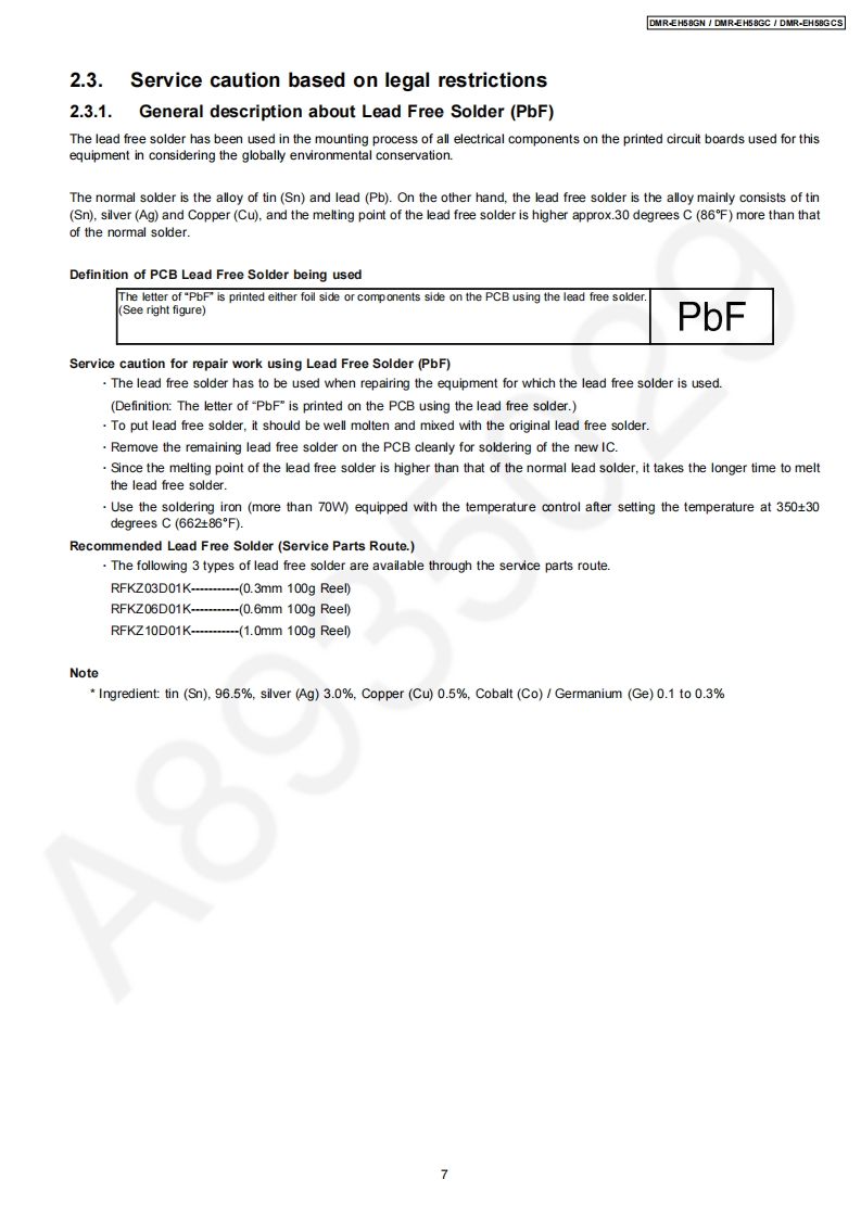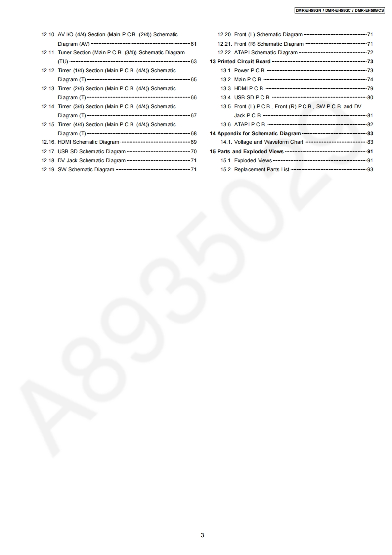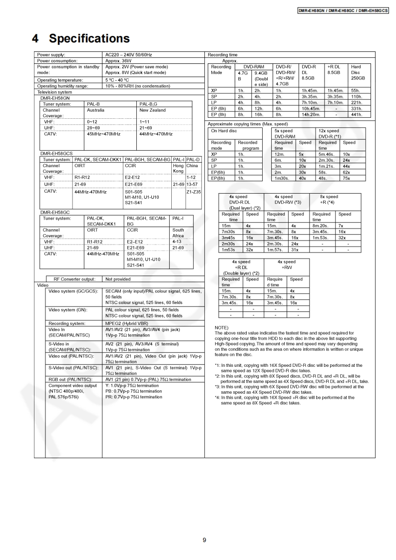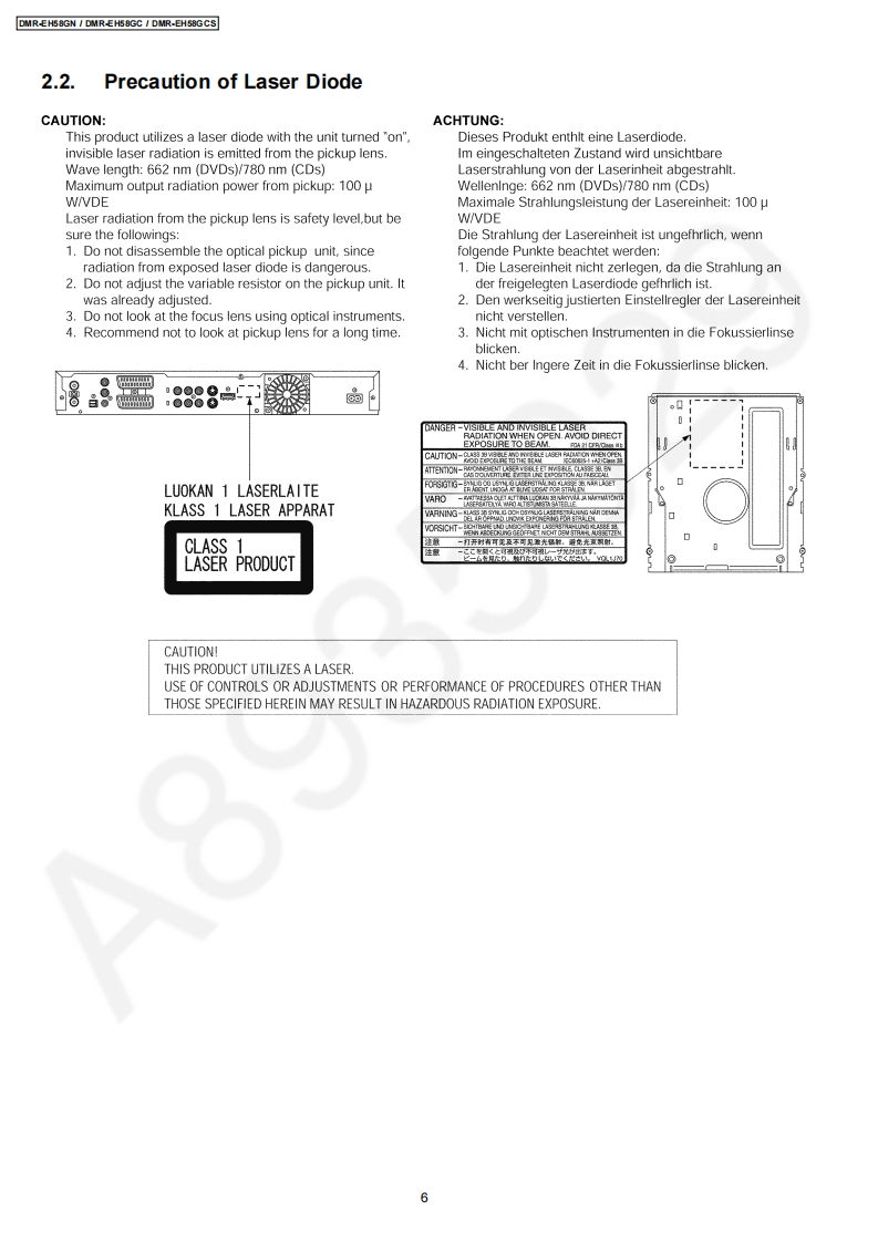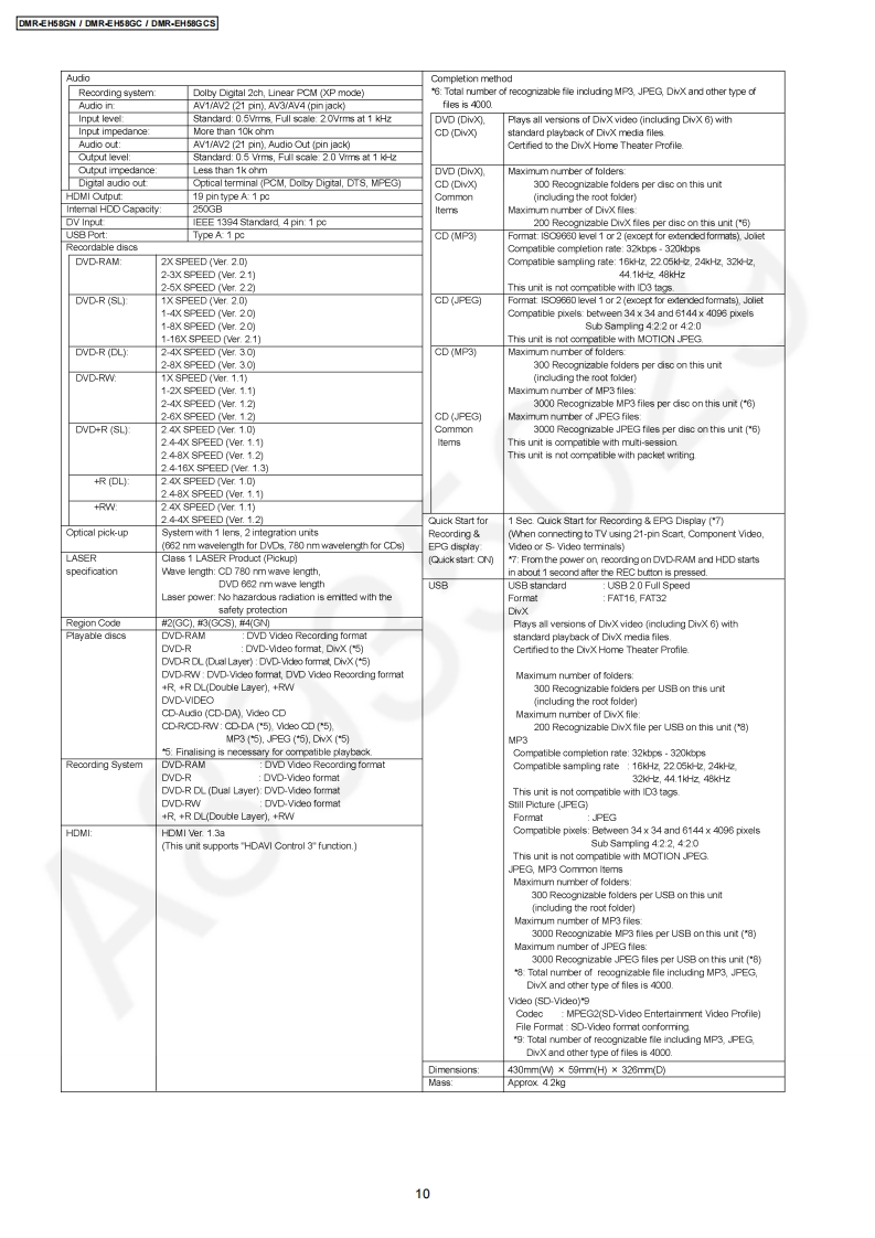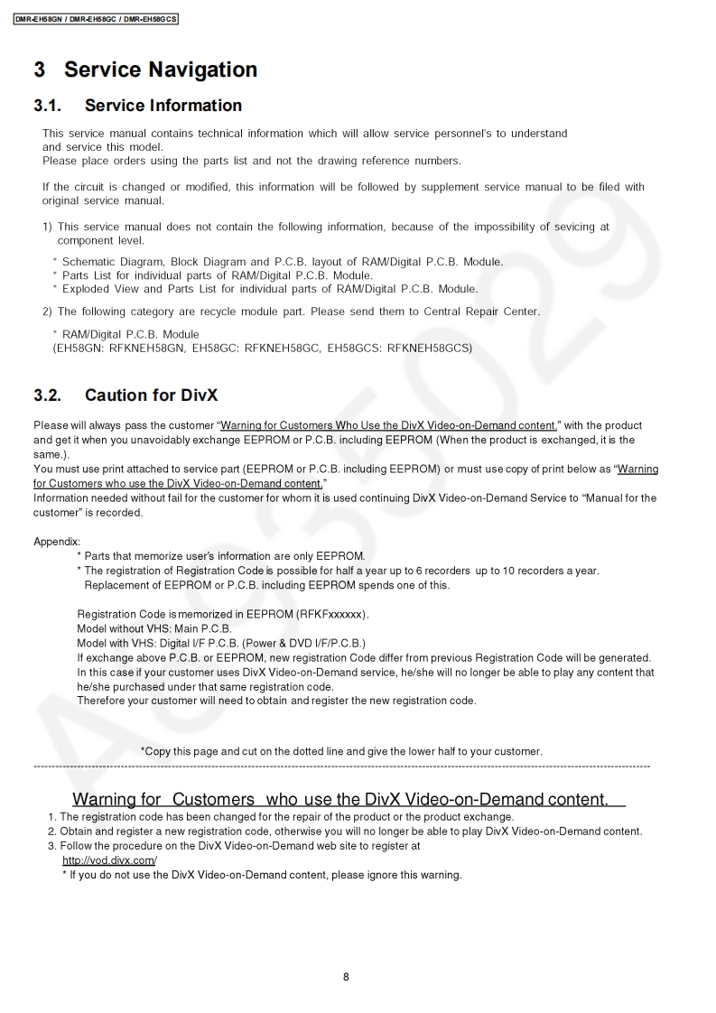 ORDER NO.CHM0805029CEService ManualDVD RecorderModo1 No.DMR-EH58GNDMR-EH58GCNotes:This model's RAM/Digital P.C.B.DMR-EH58GCSModule are -RFKNEH58GN(GN)Vol.1RFKNEH58GC(GC)-RFKNEH58GCS(GCS)ColourWhen replacing Main P.C.B.or EEPROM,(S).Silver Type (GN only)'UNFORMAT"indication is displayed and HDD must be(KW).Black Typeformatted.When replacing HDD,it is necessary to updatethe firmware.Please prepare the update disc.(After that,FORMAT is necessary)After that,programmed in the HDD will be lost.In detail,please refer to each content in this servicemanual.Caution:Pairing of RAM Drive and Digital P.C.B.as "RAM/Digital P.C.B.Module"have to be replaced together.If the either RAM drive or Digital P.C.B.are changed,RAM Drive unit has to be re-aligned.Because thealignment data for RAM Drive Unit is stored in Digital P.C.B.2008 Matsushita Electric Industrial Co.,Ltd.AllPanasonicrights reserved.Unauthorized copyinganddistribution is a violation of law.