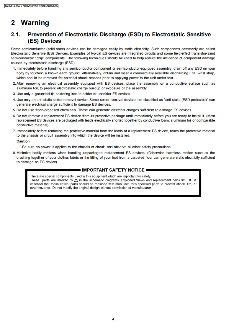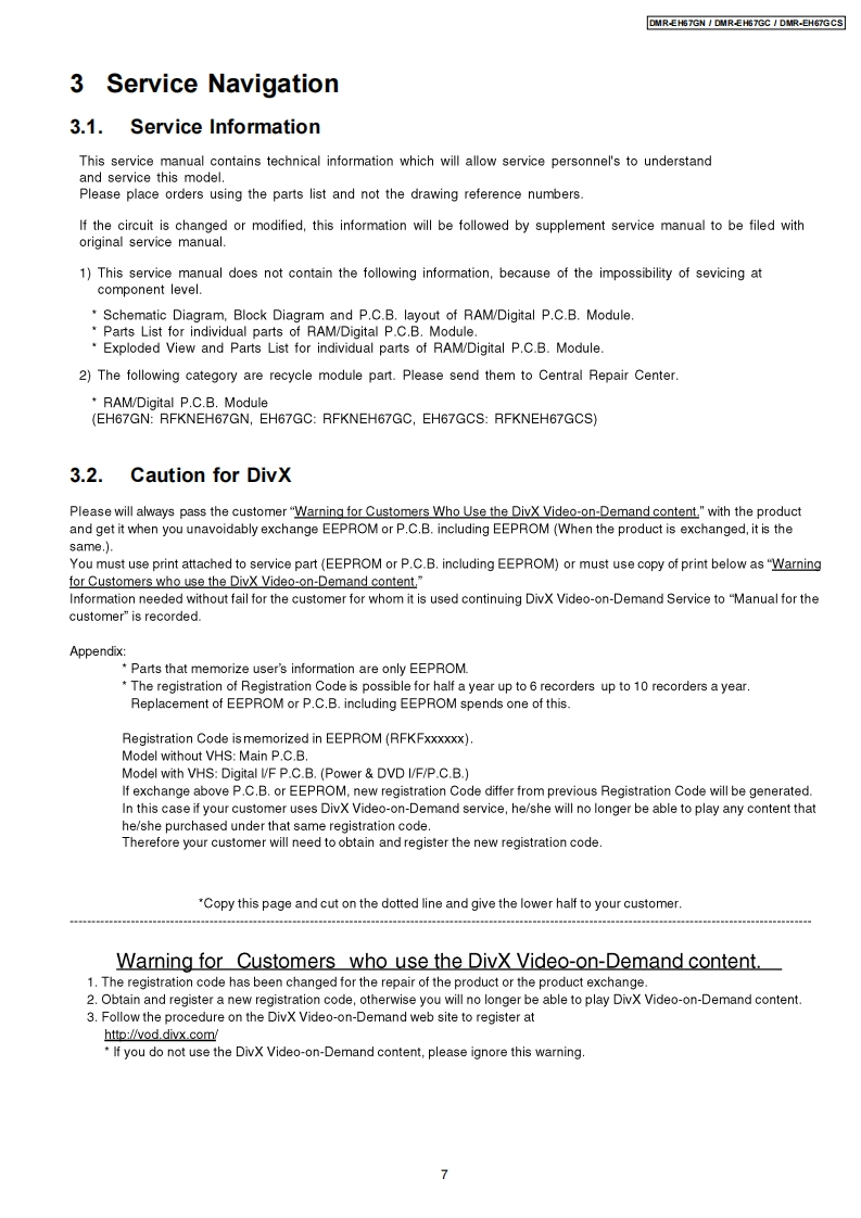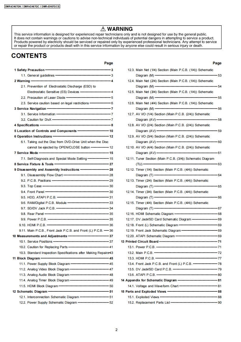ORDER NO.CHM0707031CEService ManualDVD RecorderModel No.DMR-EH67GNDMR-EH67GCNotes:These model's RAM/Digital P.C.B.DMR-EH67GCSModule are-RFKNEH67GN(GN)-RFKNEH67GC(GC)Vol.1-RFKNEH67GCS(GCS).ColourWhen replacing Main P.C.B.or EEPROM,(K0.....Black Type"UNFORMAT"indication is displayed and HDD must beformatted.When replacing HDD,it is necessary to updatethe firmware.Please prepare the update disc.(After that,FORMAT is necessary)After that,programme in the HDD will be lost.In detail,please refer to each content in this servicemanual.Caution:Pairing of RAM Drive and Digital P.C.B.as "RAM/Digital P.C.B.Module"have to be replaced together.If the either RAM drive or Digital P.C.B.is changed,RAM Drive unit has to be re-aligned.Because thealignment data for RAM Drive Unit is stored in Digital P.C.B.Manufactured under license from Dolby Laboratories.Official DivX Certified product.Dolby and the double-D symbol are trademarks of DolbyPlays all versions of DivX video (including DivX 6)with standardLaboratories.playback of DivX media files.DivX,DivX Certified,and associated logos are trademarks of'DTS"is a registered trademark of DTS,Inc.and'DTSDivX,Inc.and are used under license.2.0+Digital Out"is a trademark of DTS,Inc.HDMI,the HDMI logo and High-Definition Multimedia InterfaceThis product incorporates copyright protection technology that isare trademarks or registered trademarks of HDMI Licensing LLC.protected by U.S.patents and other intellectual property rights.Use of this copyright protection technology must be authorizedHDAVI ControlTM is a trademark of Matsushita Electric Industrialby Macrovision,and is intended for home and other limitedconsumer uses only unless otherwise authorized byCo.,Ltd.Macrovision.Reverse engineering or disassembly is prohibited..SDHC Logo is a trademark..Portions of this product are protected under copyright law andare provided under license by ARIS/SOLANA/4C.2007 Matsushita Electric Industrial Co.,Ltd.AllPanasonicrights reserved.Unauthorized copyinganddistribution is a violation of law.