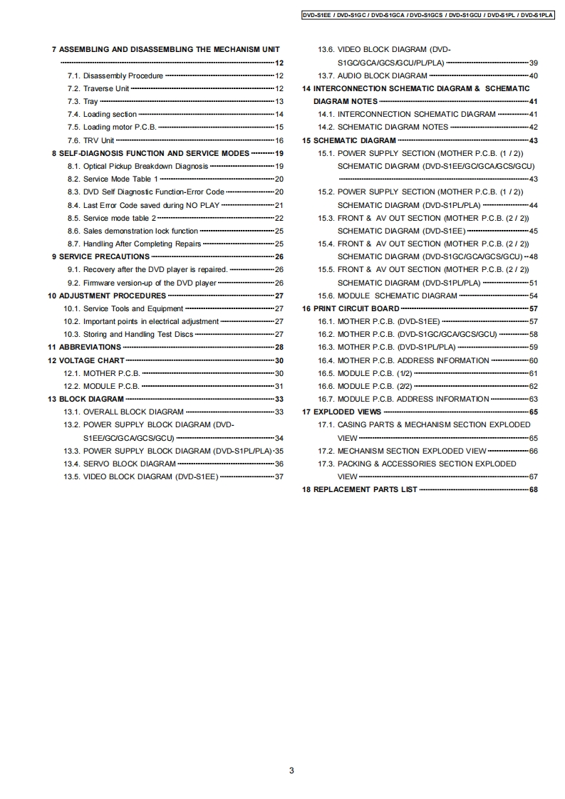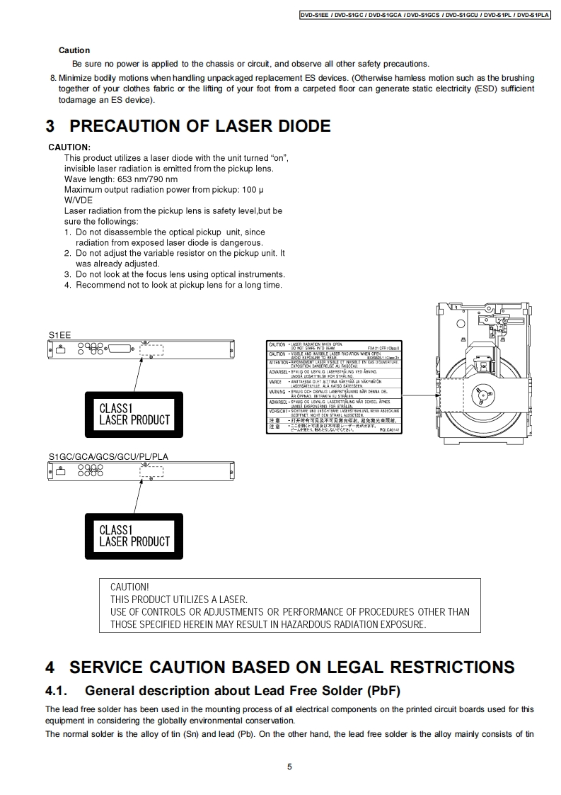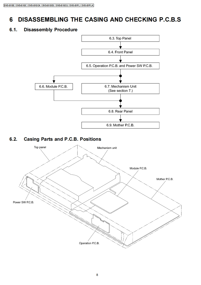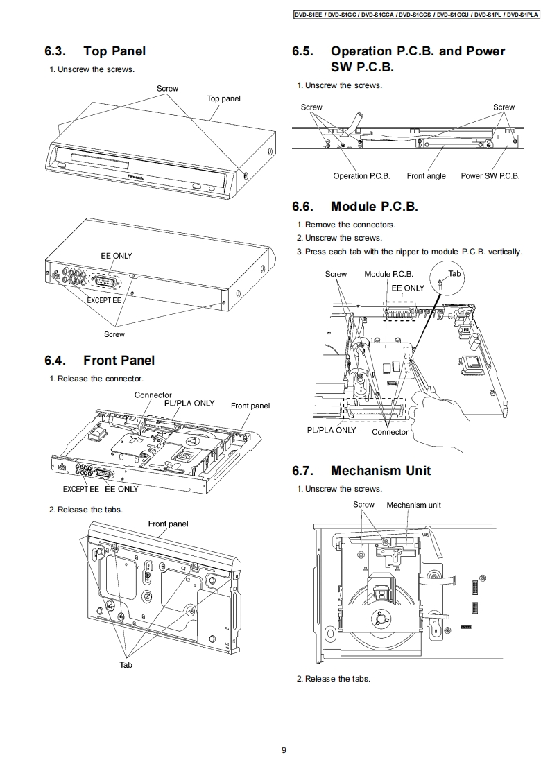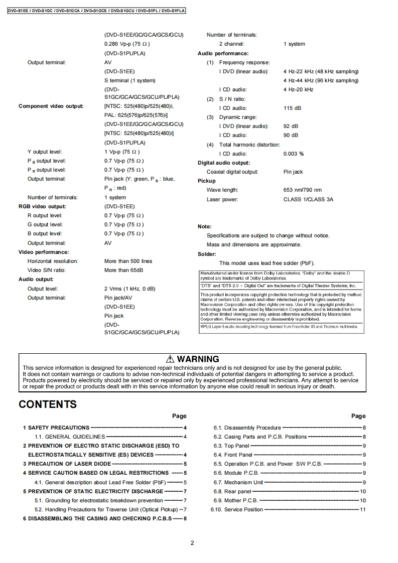 ORDER NO.CHM0605026CEService ManualDVD PlayerDVD-S1EEDVD-S1GCDVD-S1GCADVD-S1GCSDVD-S1GCUDVD-S1PLDVD-S1PLADL4.5 Mechanism SeriesColor(S)Silver TypeSpecificationsPower supply:AC230V,50 Hz(5)CD,CD-R CD-RW(CD-DA,Video CD,SVCD"1,MP324,(DVD-S1EE)JPEG3)AC110-240V,50/60Hz(6)DVD-R DL (DVD-Video)(DVD-S1GC/GCA/GCS/GCU/PL)(7)+R DL (Video)AC120 V,60 Hz*1Conforming to IEC62107(DVD-S1PLA)*2MPEG-1 Layer 3,MPEG-2 Layer 3Power consumption:10W*3Exif Ver2.1 JPEG Baseline filesPower consumption in standby mode:Picture resolution:between 320 x 240 and 6144 x 4096pixels (Sub sampling is 4:2:2 or 4:2:0)approx.1WThe total combined maximum number of recognizable audioDimensions:360(0×251(D)×43Hmmand picture contents and groups:1000 audio and pictureMass:1.8 kg (approx.)contents and 256 groups.Signal system:PAL 625/50,PAL 525/60,NTSC(DVD-S1GC/GCA/GCS/GCU/EE)Video output:NTSCOutput level:1Vp-p(752)(DVD-S1PL/PLA)Output terminal:Pin jack(1 system)/AVOperating temperature range:+5to+35℃(DVD-S1EE)Operating humidity range:5 to 90%RH (no condensation)Pin jack(1 system)Discs played [8 cm (3")or 12 cm (5")]:(DVD-(1)DVD (DVD-Video)S1GC/GCA/GCS/GCU/PL/PLA)(2)DVD-R (DVD-Video,MP324,JPEG34)S video output:(3)DVD-RW(DVD-Video,MP324,JPEG3)Y output level:1Vp-p(752)(4)+R/+RW (Video)C output level:NTSC.0.286Vp-p(752)PAL:0.300Vp-p(752)2006 Matsushita Electric Industrial CO.,Ltd.AllPanasonic'rights reserved.Unauthorizedcopying anddistribution is a violation of law.