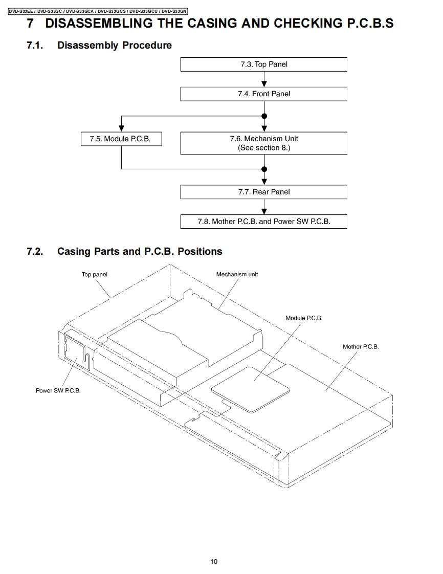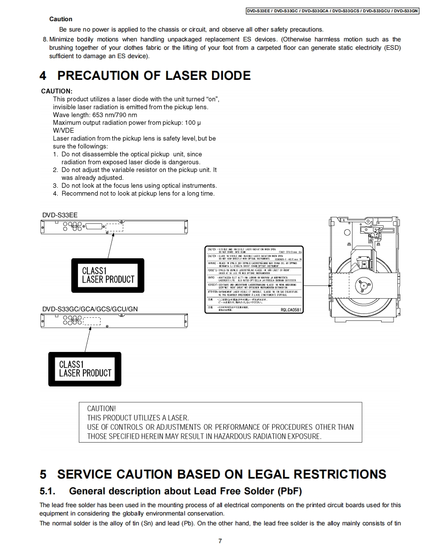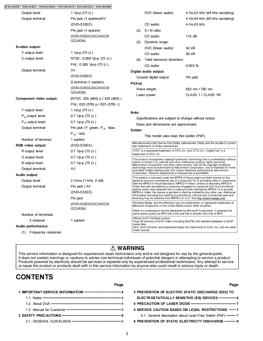 ORDER NO.CHM0704012CEService ManualDVD PlayerDVD-S33EEDVD-S33GCDVD-S33GCADVD-S33GCSDVD-S33GCUDVD-S33GNDL4.5 Mechanism SeriesColor(S)..Silver TypeSpecificationsPower supply:AC230 V,50 Hz(4)DVD-RW(DVD-Video,MPEG4"57,DivX'6.7,MP32.7.(DVD-S33EE)JPEG*.)AC110-240V,5060Hz(⑤+R/+RW(Mdeo)(DVD-S33GC/GCA/GCS/GCU)(6)+R DL (Video)AC230-240V.50Hz(7)CD,CD-R RW (CD-DA,Video CD,SVCD"1,MP32.7WMA 3.7.JPEG4.7,MPEG4'5.7,DivX'6.7)(DVD-S33GN)Power consumption:9WConforming to IEC62107*2MPEG-1 Layer 3,MPEG-2 Layer 3Power consumption in standby mode:*3approx.1 WWindows Media Audio Ver.9.0 L3Not compatible with Multiple Bit Rate (MBR)Dimensions:430(W×231(D)×43(Hmm(excluding protrusions)*4Exif Ver 2.1 JPEG Baseline files430(M×263(D)×43(HmmPicture resolution:between 160 x 120 and 6144 x 4096(including protrusions)pixels (Sub sampling is 4:2:2 or 4:2:0)Mass:2.0 kg (approx.)*5MPEG4 data recorded with the Panasonic SD multi camerasSignal system:PAL 625/50,PAL 525/60,NTSCor DVD video recorders Confoming to SD VIDEOspecifications (ASF standard)/MPEG4 (Simple Profile)(DVD-S33EE/GC/GCA/GN)video system/G.726 audio systemNTSC.PAL 625/50.PAL 525/60*6Plays all versions of DivXvideo (including DivX6)with(DVD-S33GCS/GCU)standard playback of DivX media files.Certified to the DivXOperating temperature range:+5 to +35CHome Theater Profile.Operating humidity range:5 to 90%RH (no condensation)GMC (Global Motion Compensation)is not supported.Discs played [8 cm (3")or 12 cm (5")]:The total combined maximum number of recognizable audio(1)DVD (DVD-Video,DivX'6.7)picture and video contents and groups:4000 audio,pictureand video contents and 256 groups.2)DVD-R(DVD-Video,DivX"67,MP32.7,JPEG.7,MPEG4'5.7)3)DVD-R DL (DVD-Video)Video output:2007 Matsushita Electric Industrial CO.,Ltd.AllPanasonicrights reserved.Unauthorized copying anddistribution is a violation of law.