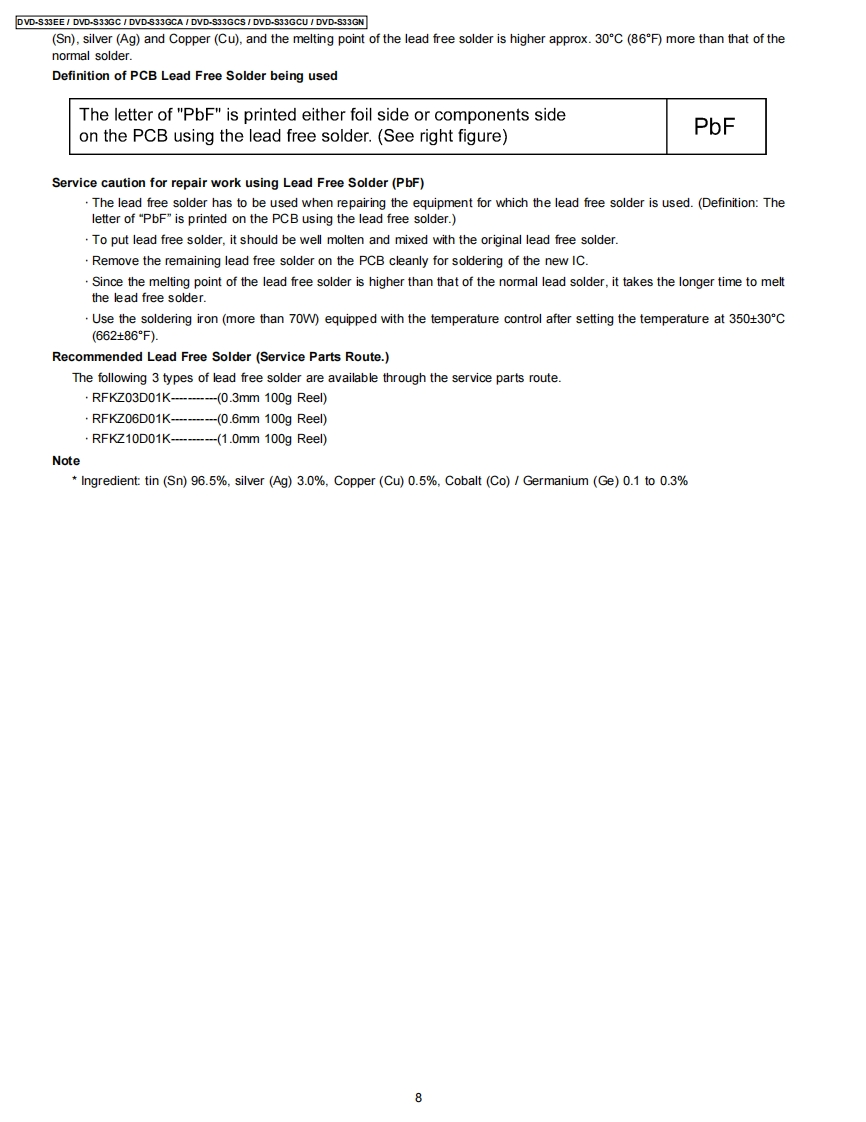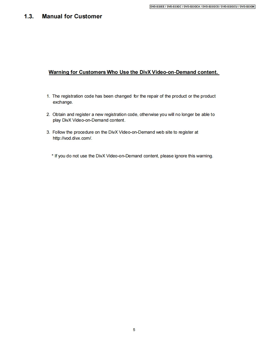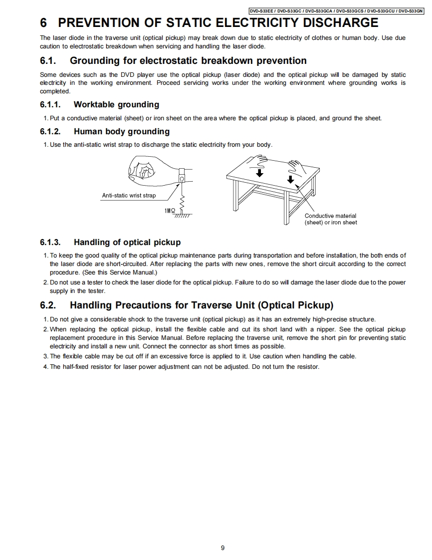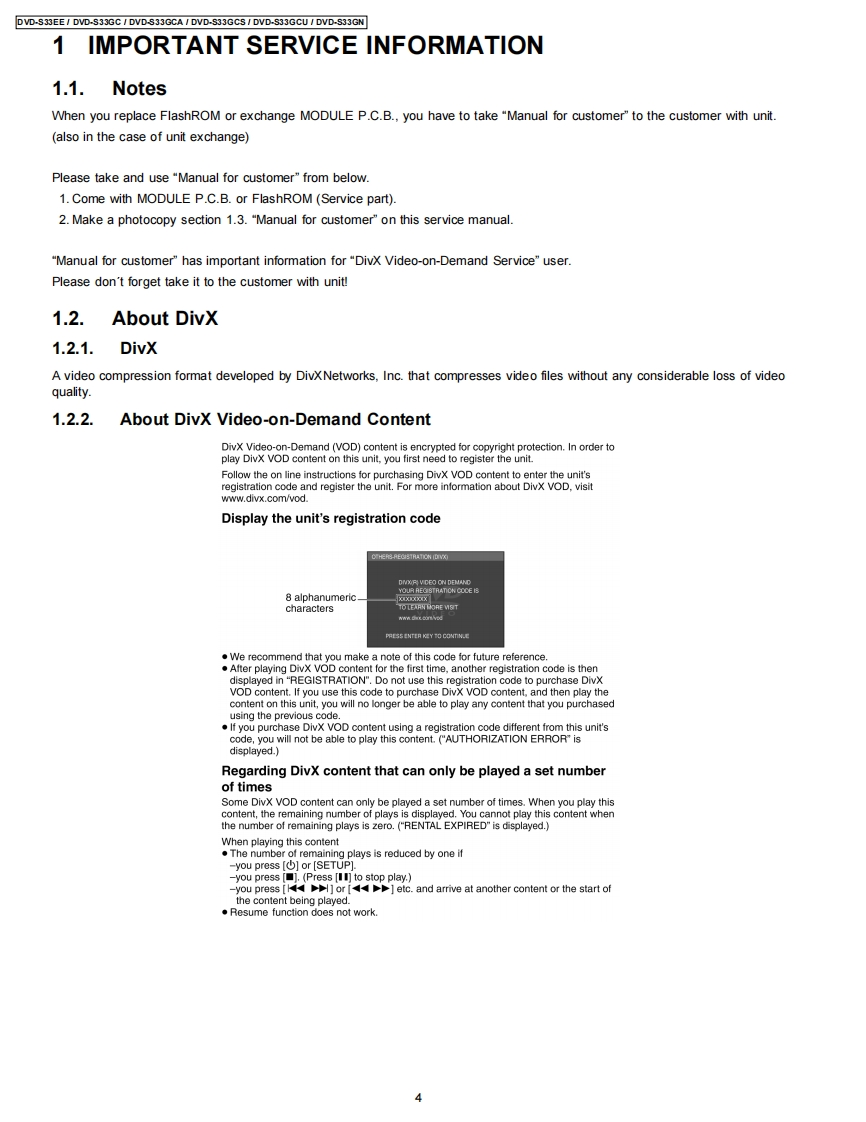 ORDER NO.CHM0704012CEService ManualDVD PlayerDVD-S33EEDVD-S33GCDVD-S33GCADVD-S33GCSDVD-S33GCUDVD-S33GNDL4.5 Mechanism SeriesColor(S)..Silver TypeSpecificationsPower supply:AC230 V,50 Hz(4)DVD-RW(DVD-Video,MPEG4"57,DivX'6.7,MP32.7.(DVD-S33EE)JPEG*.)AC110-240V,5060Hz(⑤+R/+RW(Mdeo)(DVD-S33GC/GCA/GCS/GCU)(6)+R DL (Video)AC230-240V.50Hz(7)CD,CD-R RW (CD-DA,Video CD,SVCD"1,MP32.7WMA 3.7.JPEG4.7,MPEG4'5.7,DivX'6.7)(DVD-S33GN)Power consumption:9WConforming to IEC62107*2MPEG-1 Layer 3,MPEG-2 Layer 3Power consumption in standby mode:*3approx.1 WWindows Media Audio Ver.9.0 L3Not compatible with Multiple Bit Rate (MBR)Dimensions:430(W×231(D)×43(Hmm(excluding protrusions)*4Exif Ver 2.1 JPEG Baseline files430(M×263(D)×43(HmmPicture resolution:between 160 x 120 and 6144 x 4096(including protrusions)pixels (Sub sampling is 4:2:2 or 4:2:0)Mass:2.0 kg (approx.)*5MPEG4 data recorded with the Panasonic SD multi camerasSignal system:PAL 625/50,PAL 525/60,NTSCor DVD video recorders Confoming to SD VIDEOspecifications (ASF standard)/MPEG4 (Simple Profile)(DVD-S33EE/GC/GCA/GN)video system/G.726 audio systemNTSC.PAL 625/50.PAL 525/60*6Plays all versions of DivXvideo (including DivX6)with(DVD-S33GCS/GCU)standard playback of DivX media files.Certified to the DivXOperating temperature range:+5 to +35CHome Theater Profile.Operating humidity range:5 to 90%RH (no condensation)GMC (Global Motion Compensation)is not supported.Discs played [8 cm (3")or 12 cm (5")]:The total combined maximum number of recognizable audio(1)DVD (DVD-Video,DivX'6.7)picture and video contents and groups:4000 audio,pictureand video contents and 256 groups.2)DVD-R(DVD-Video,DivX"67,MP32.7,JPEG.7,MPEG4'5.7)3)DVD-R DL (DVD-Video)Video output:2007 Matsushita Electric Industrial CO.,Ltd.AllPanasonicrights reserved.Unauthorized copying anddistribution is a violation of law.