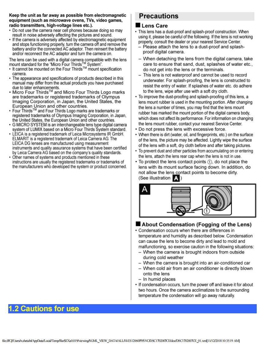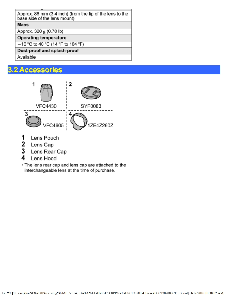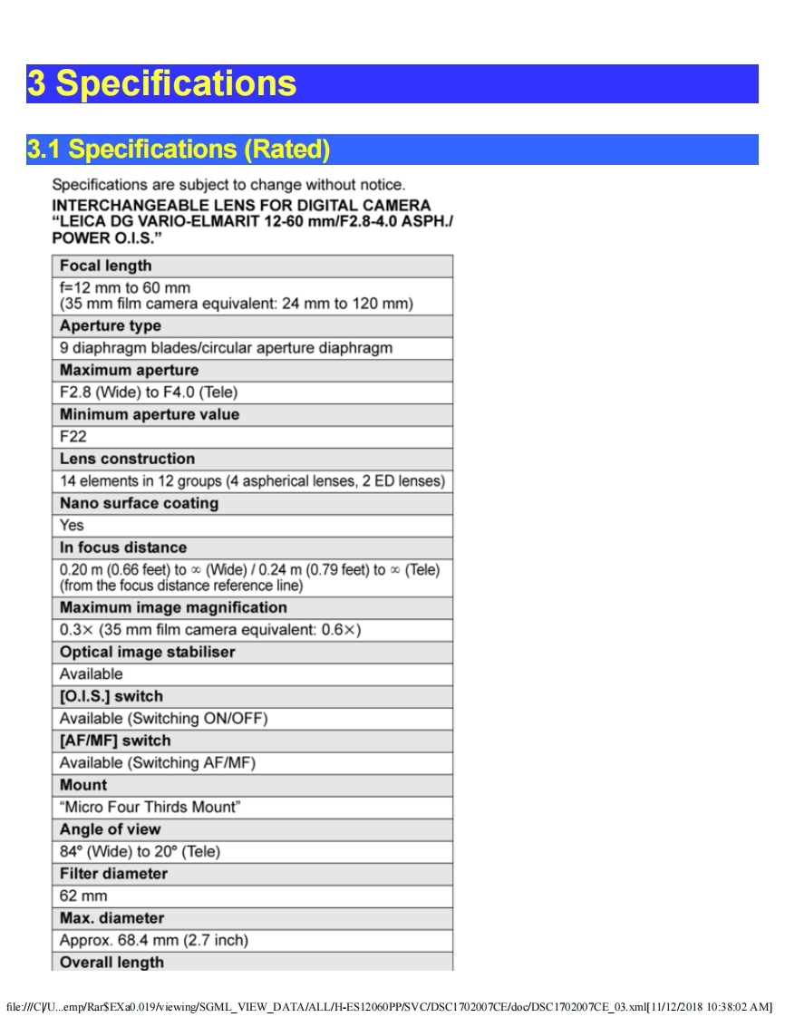 PanasonicORDER NO.DSC1702007CEB26Service ManuaInterchangeable Lens for Digital CameraModel No.H-ES12060PPH-ES12060EH-ES12060GKHDLEICADB VARIO-ELMARITPOWER0l.s.丝△WARNINGThis service information is designed for experienced repair technicians only and is not designed for use by the general public.It does not contain wamings or cautions to advise non-technical individuals of potential dangers in attempting to service a product.Products powered by electricity should be serviced or repaired only by experienced professional technicians.Any attempt to serviceor repair the product or products dealt with in this service information by anyone else could result in serious injury or death.Panasonic Corporation 2017 Unauthorized copying and distribution is a violation of law.file:///CVU...emp/Rar$EXa0.019/viewing/SGML_VIEW_DATA/ALL/H-ES12060PP/SVC/DSC1702007CE/doc/DSC1702007CE_cvr.xml[11/12/2018 10:33:20 AM]