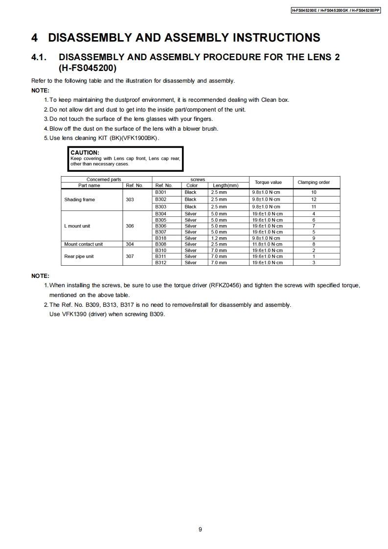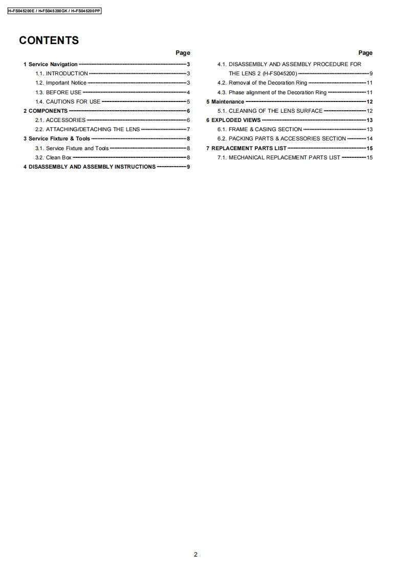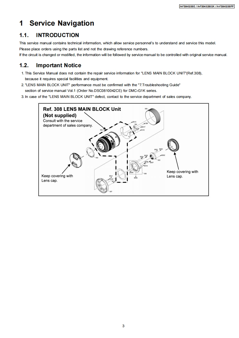 ORDER NO.DSC0810047CEB26Service ManualInterchangeable Lens for Digital CameraMEGAH-FS045200E0.l.8GWMICROH-FS045200GKH-FS045200PPVol.1SpecificationsINTERCHANGEABLE LENS FOR DIGITAL CAMERA"LUMIX G VARIO 45-200 mm/F4.0-5.6/MEGA O.I.S."Focal lengthf=45 mm to 200 mm(35 mm film camera equivalent:90 mm to 400 mm)Aperture type7 leaf shutters/iris diaphragm/circular diaphragmAperture rangeF4.0 (Wide)to F5.6 (Tele)Minimum aperture valueF22■Lens construction16 elements in 13 groups (no aspherical lenses)In focus distance1.0 m(3.28 feet)to(from the focus distance reference line)Maximum image magnification0.19x (35 mm film camera equivalent:0.38x)Optical image stabilizerAvailableMount"Micro Four Thirds Mount"Angle of view27°Nide)to6.2°(Tele)Filter diameter52 mm(2.05 inch)Max.diameter70mm(2.76inch】Overall lengthApprox.100 mm (3.94 inch)(from the tip of the lens to the base side of the lens mount)Mass(Weight)Approx.380 g(13.4 oz)AWARNINGThis service information is designed for experienced repair technicians only and is not designed for use by the general public.It does not contain warnings or cautions to advise non-technical individuals of potential dangers in attempting to service a product.Products powered by electricity should be serviced or repaired only by experienced professional technicians.Any attempt to serviceor repair the product or products dealt with in this service information by anyone else could result in serious injury or death.PanasonicPanasonic Corporation 2008.Unauthorizedcopying and distribution is a violation of law.