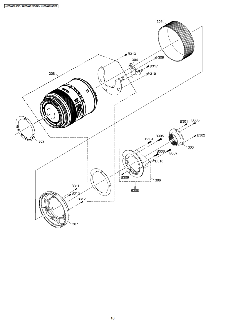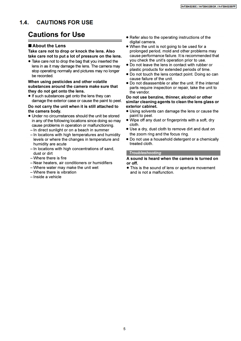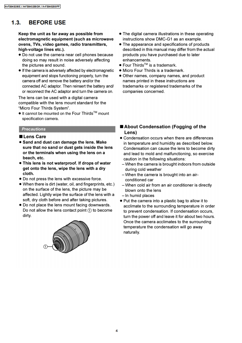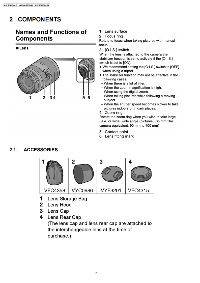 ORDER NO.DSC0810047CEB26Service ManualInterchangeable Lens for Digital CameraMEGAH-FS045200E0.l.8GWMICROH-FS045200GKH-FS045200PPVol.1SpecificationsINTERCHANGEABLE LENS FOR DIGITAL CAMERA"LUMIX G VARIO 45-200 mm/F4.0-5.6/MEGA O.I.S."Focal lengthf=45 mm to 200 mm(35 mm film camera equivalent:90 mm to 400 mm)Aperture type7 leaf shutters/iris diaphragm/circular diaphragmAperture rangeF4.0 (Wide)to F5.6 (Tele)Minimum aperture valueF22■Lens construction16 elements in 13 groups (no aspherical lenses)In focus distance1.0 m(3.28 feet)to(from the focus distance reference line)Maximum image magnification0.19x (35 mm film camera equivalent:0.38x)Optical image stabilizerAvailableMount"Micro Four Thirds Mount"Angle of view27°Nide)to6.2°(Tele)Filter diameter52 mm(2.05 inch)Max.diameter70mm(2.76inch】Overall lengthApprox.100 mm (3.94 inch)(from the tip of the lens to the base side of the lens mount)Mass(Weight)Approx.380 g(13.4 oz)AWARNINGThis service information is designed for experienced repair technicians only and is not designed for use by the general public.It does not contain warnings or cautions to advise non-technical individuals of potential dangers in attempting to service a product.Products powered by electricity should be serviced or repaired only by experienced professional technicians.Any attempt to serviceor repair the product or products dealt with in this service information by anyone else could result in serious injury or death.PanasonicPanasonic Corporation 2008.Unauthorizedcopying and distribution is a violation of law.