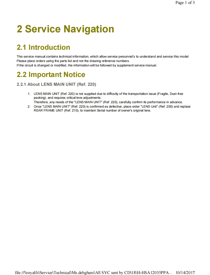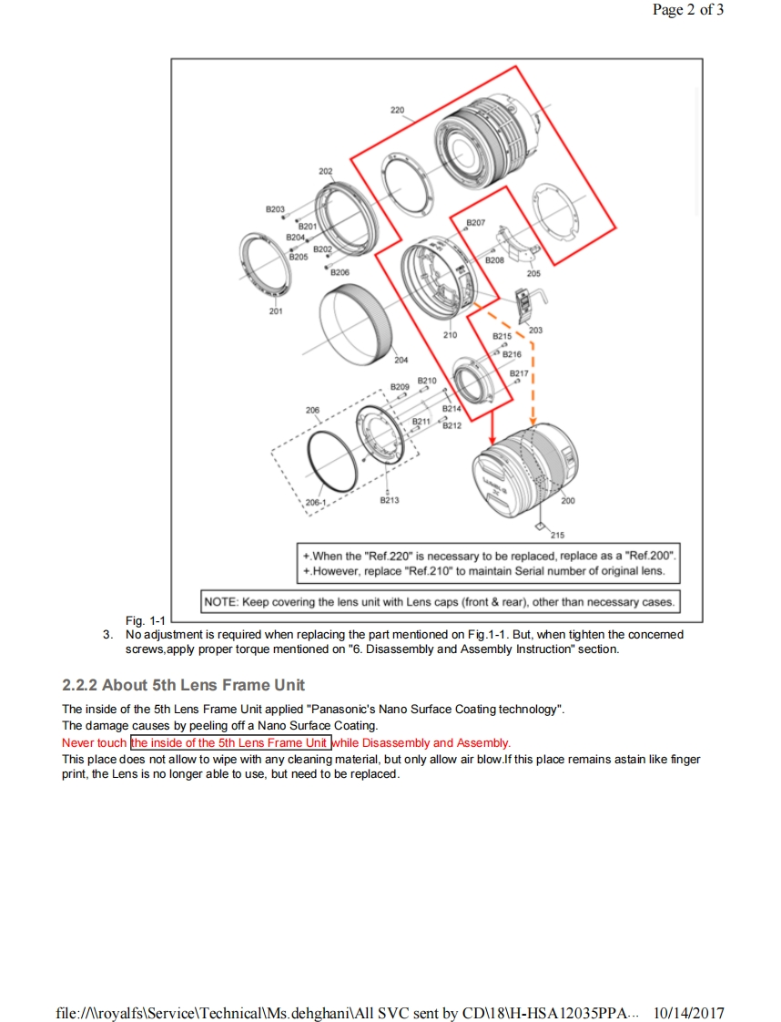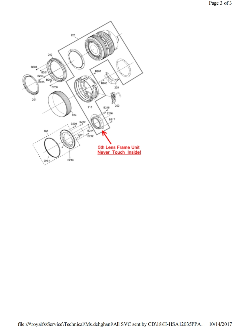 Page 1 of 1PanasonicORDER NO.DSC1703008CEB26Service ManualInterchangeable Lens for Digital CameraModel No.H-HSA12035PPH-HSA12035EH-HSA12035GK&回监HDPOWER0l.8.器巡AWARNINGThis service information is designed for experienced repair technicians only and is not designed for use by the general public.It does not contain warnings or cautions to advise non-technical individuals of potential dangers in attempting to service a product.Products powered by electricity should be serviced or repaired only by experienced professional technicians.Any attempt to serviceor repair the product or products dealt with in this service information by anyone else could result in serious injury or death.Panasonic Corporation 2017 Unauthorized copying and distribution is a violation of law.file:/AroyalfsServiceTechnicalMs.dehghaniAll SVC sent by CD18H-HSA12035PPA...10/14/2017