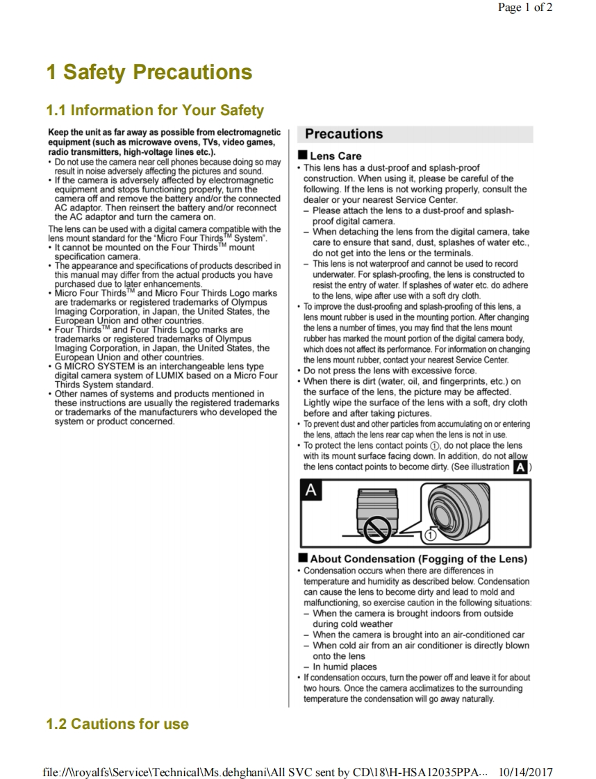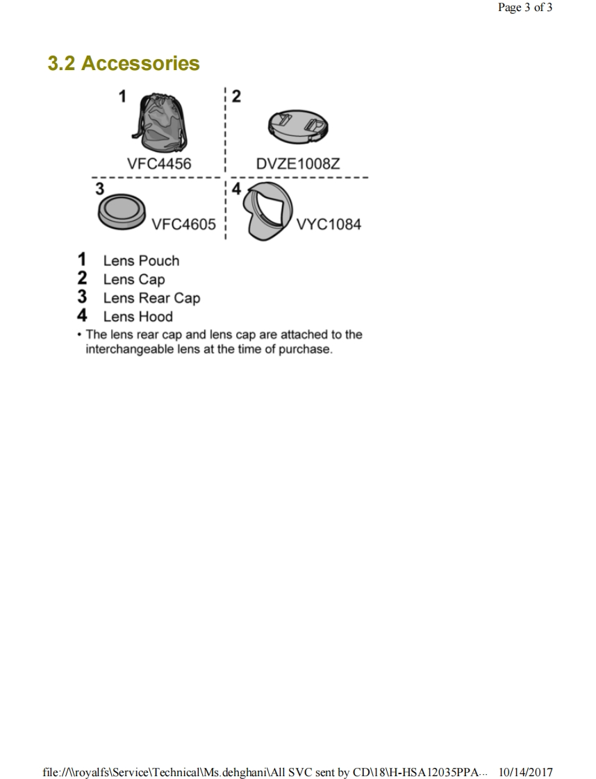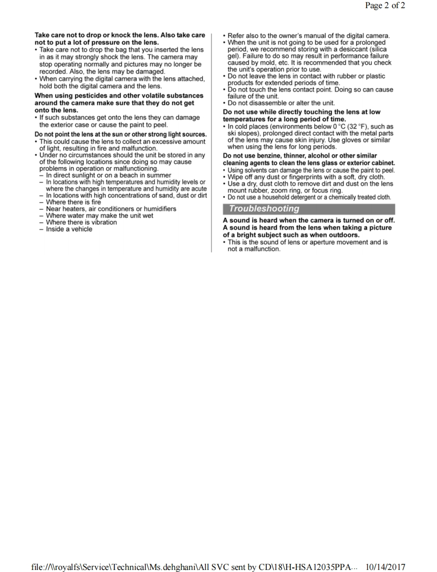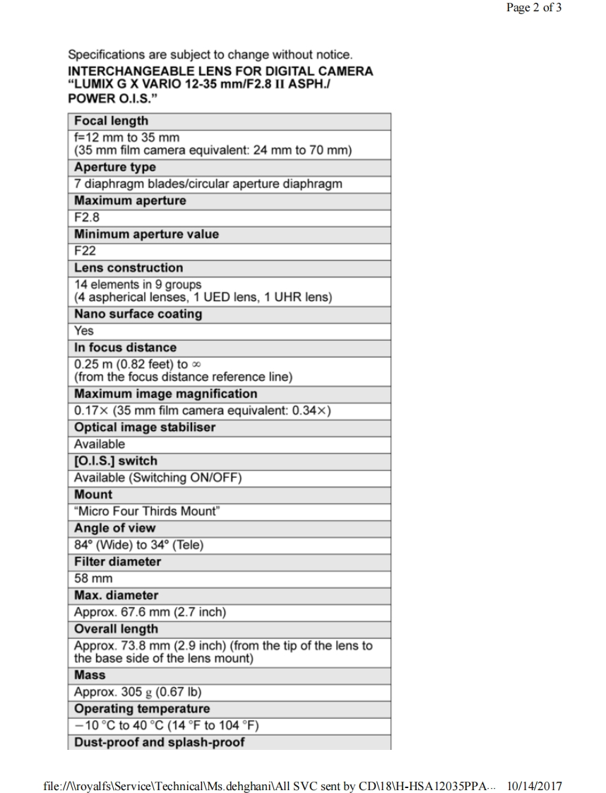 Page 1 of 1PanasonicORDER NO.DSC1703008CEB26Service ManualInterchangeable Lens for Digital CameraModel No.H-HSA12035PPH-HSA12035EH-HSA12035GK&回监HDPOWER0l.8.器巡AWARNINGThis service information is designed for experienced repair technicians only and is not designed for use by the general public.It does not contain warnings or cautions to advise non-technical individuals of potential dangers in attempting to service a product.Products powered by electricity should be serviced or repaired only by experienced professional technicians.Any attempt to serviceor repair the product or products dealt with in this service information by anyone else could result in serious injury or death.Panasonic Corporation 2017 Unauthorized copying and distribution is a violation of law.file:/AroyalfsServiceTechnicalMs.dehghaniAll SVC sent by CD18H-HSA12035PPA...10/14/2017