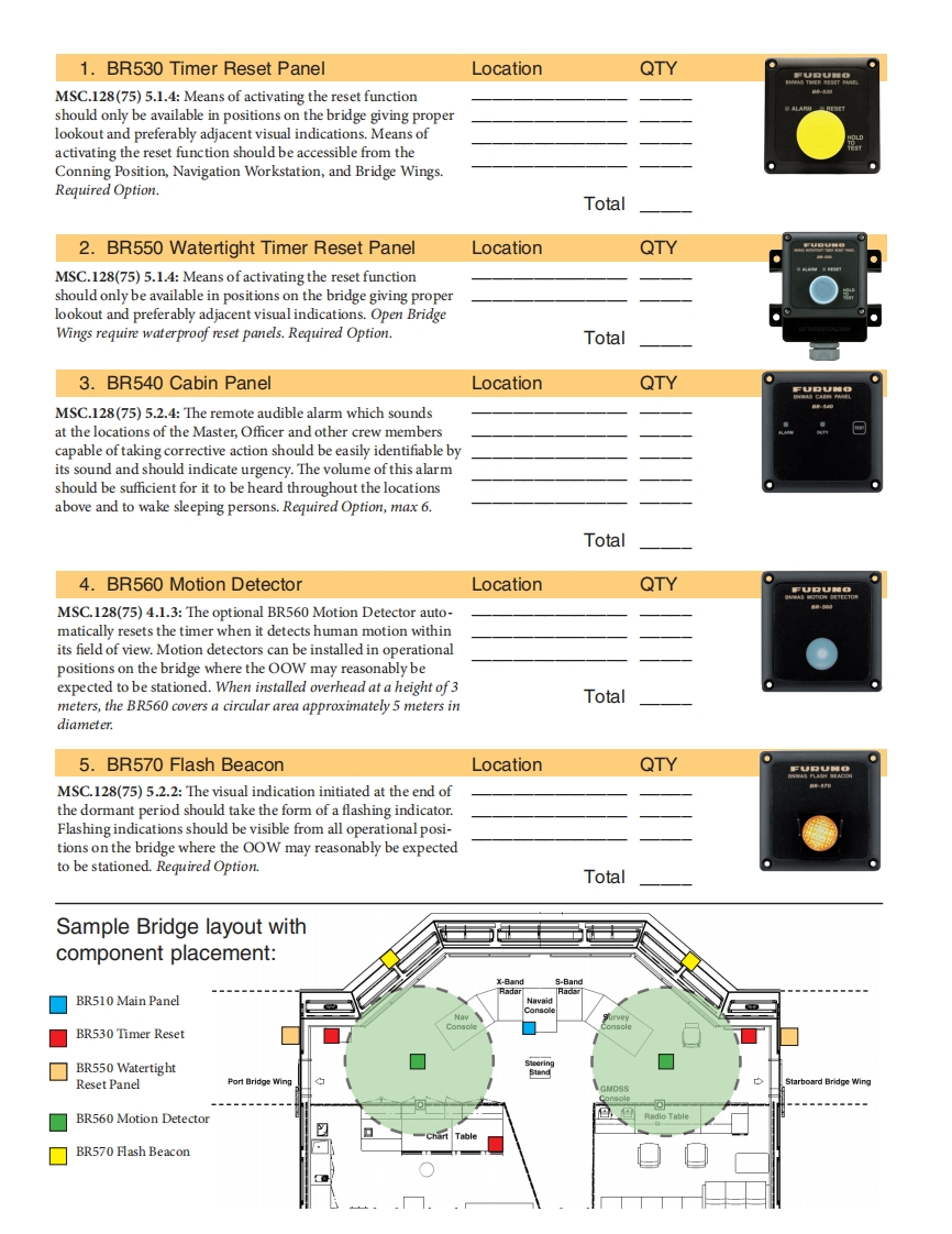 B尼IDGE NAVIGATIONALVessel Information:Vessel Name:VATCH月LA是MSH写TEMType:Length:Check ListRegistry:GT:This checklist is intended to provide customers and dealers fitting Bridge Navigation Watch AlarmSystems (BNWAS)with a handy,concise document to list system components and proposed bridgelayout.The Furuno BR500 Bridge Navigation Watch Alamm System(BNWAS)consists of the followingstandard-supply items:BR510 Main Alarm PanelBR520 Processor Unit10-Meter interconnect cable (P/N 001-115-210)IMO regulation MSC128(75)mandates the following bridge alarm reset facilities:"5.1.4 Reset facilities:Means of activating the reset function should only be available in positions onthe bridge giving proper look out and preferably adjacent to visual indications.Means of activating thereset function should be easily accessible from the conning position,the workstation for navigating andmaneuvering,the workstation for monitoring and the bridge wings."The vessel owner/operator should choose from the range of options on the following page to createa BNWAS configuration appropriate to vessel size,layout,bridge management scheme and classrequirements.Implementation schedule of Bridge Navigational Watch Alarm System(BNWAS)201007201107201207201307201407Newly built passenger shipsNewly built cargo vessels>150GTExisting passenger shipsNoJater than the first survey after July 2012Existing cargo vessels>3000GTNo later than the firs survey after July 2012Existing cargo vesselsover 500 and under 3000 GTNo later than the first survey after July 2013Existing cargo vesselsover 150 and under 500 GTNo later than the first survey after July 2014Transitioning perlodBNWAS carrlage mandatory[Note:Furuno USA has no authority to interpret regulations or predict class requirements.Werecommend consultation with class experts to clarify BNWAS requirements specific to class,vesselparticulars and management scheme.]
