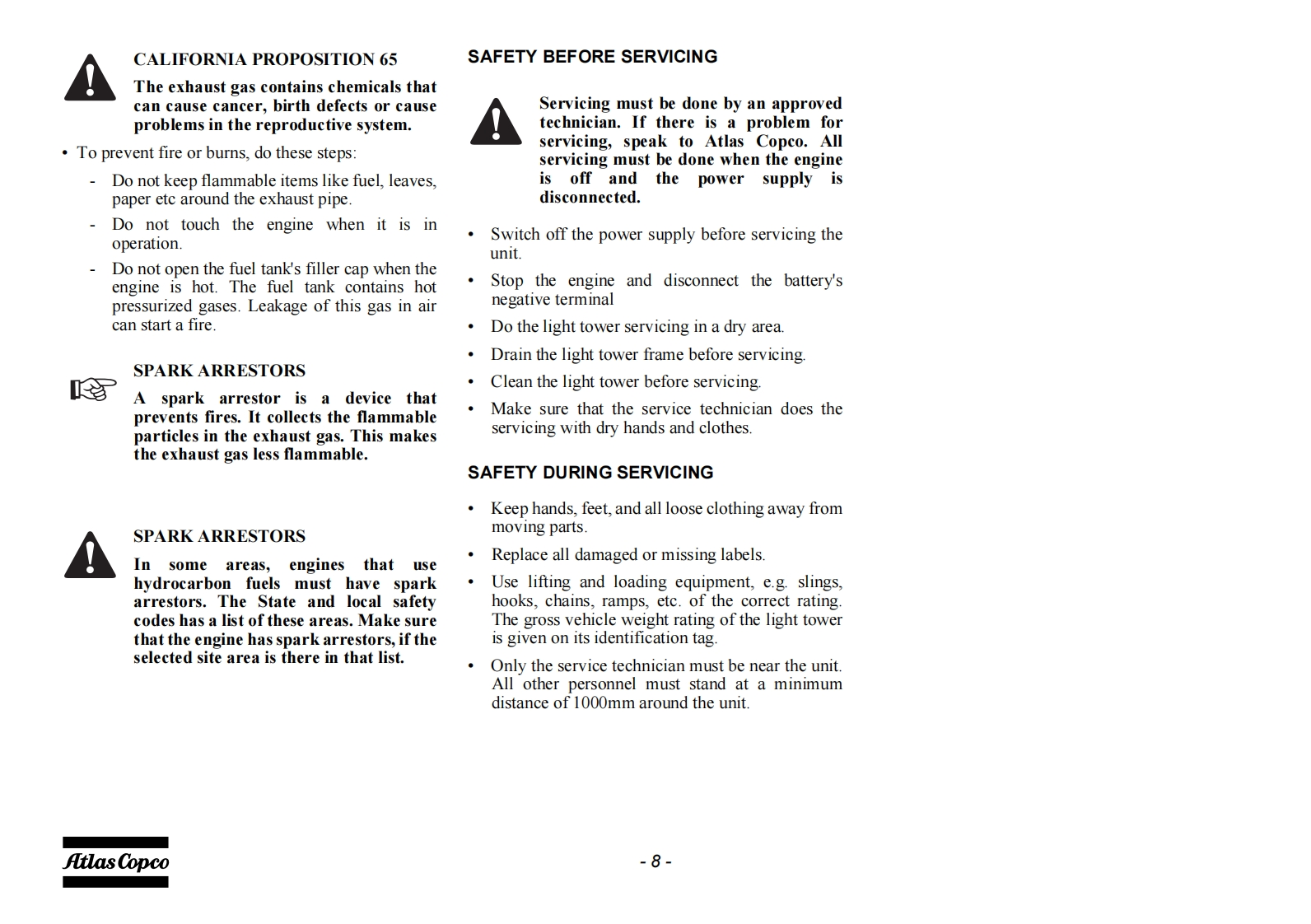 atlas-copco-hilight-v3-v2-p2-instruction-manual安装调试说明书手册找手册网3小时前发布关注私信4.46MB34页024atlas-copco-hilight-v3-v2-p2-instruction-manual安装调试说明书手册此内容为付费资源,请付费后查看¥19¥21黄金会员免费钻石会员免费立即购买您当前未登录!建议登陆后购买,可保存购买订单付费资源 第1页 / 共34页 第2页 / 共34页 第3页 / 共34页 第4页 / 共34页 第5页 / 共34页 第6页 / 共34页 第7页 / 共34页 第8页 / 共34页 第9页 / 共34页 第10页 / 共34页 试读已结束,还剩24页,您可下载完整版后进行离线阅读 THE ENDKaeser/Atlas-Copco 文本预览 Atlas Copco Instruction ManualInstruction Manualfor Portable Light Tower GeneratorEnglishHiLight V3+WUXEngine P20001HiLight V2+WUXEngine P3000HiLight P2+WUXEngine P6500Atlas Copco 查看更多 收起部分 喜欢就支持一下吧收藏