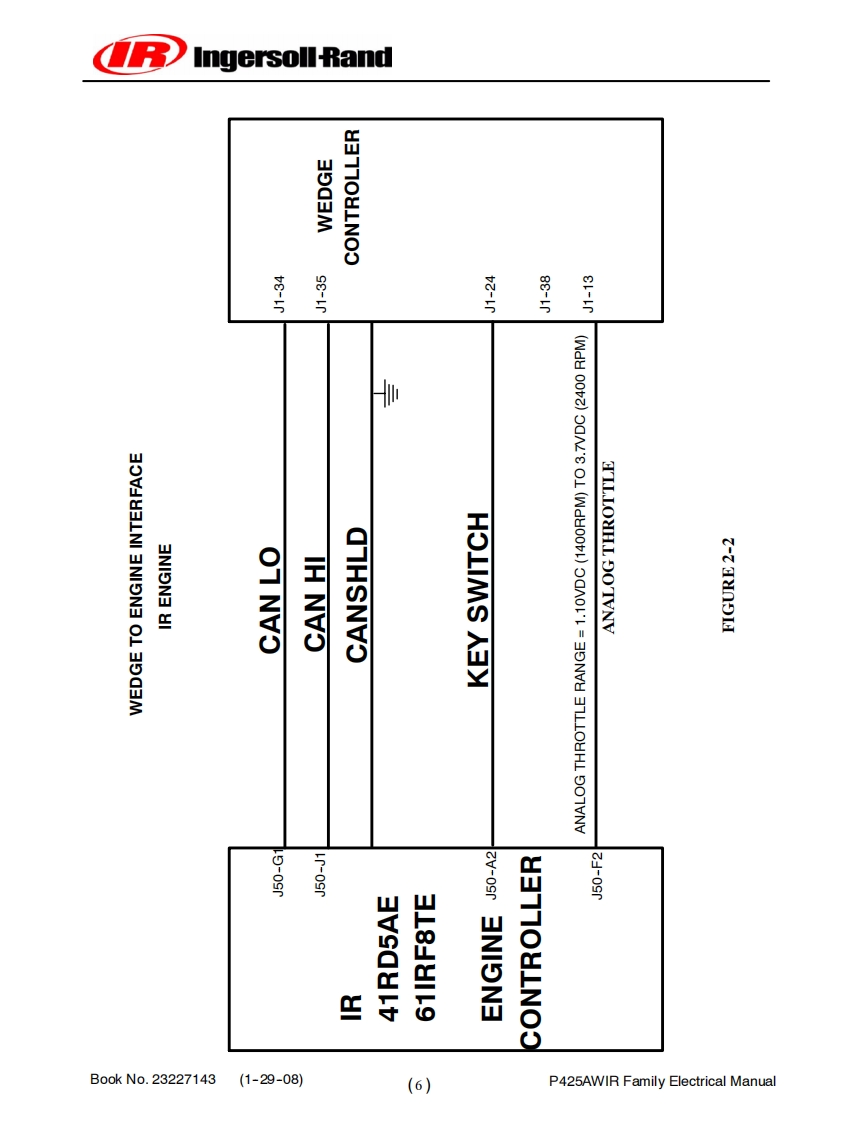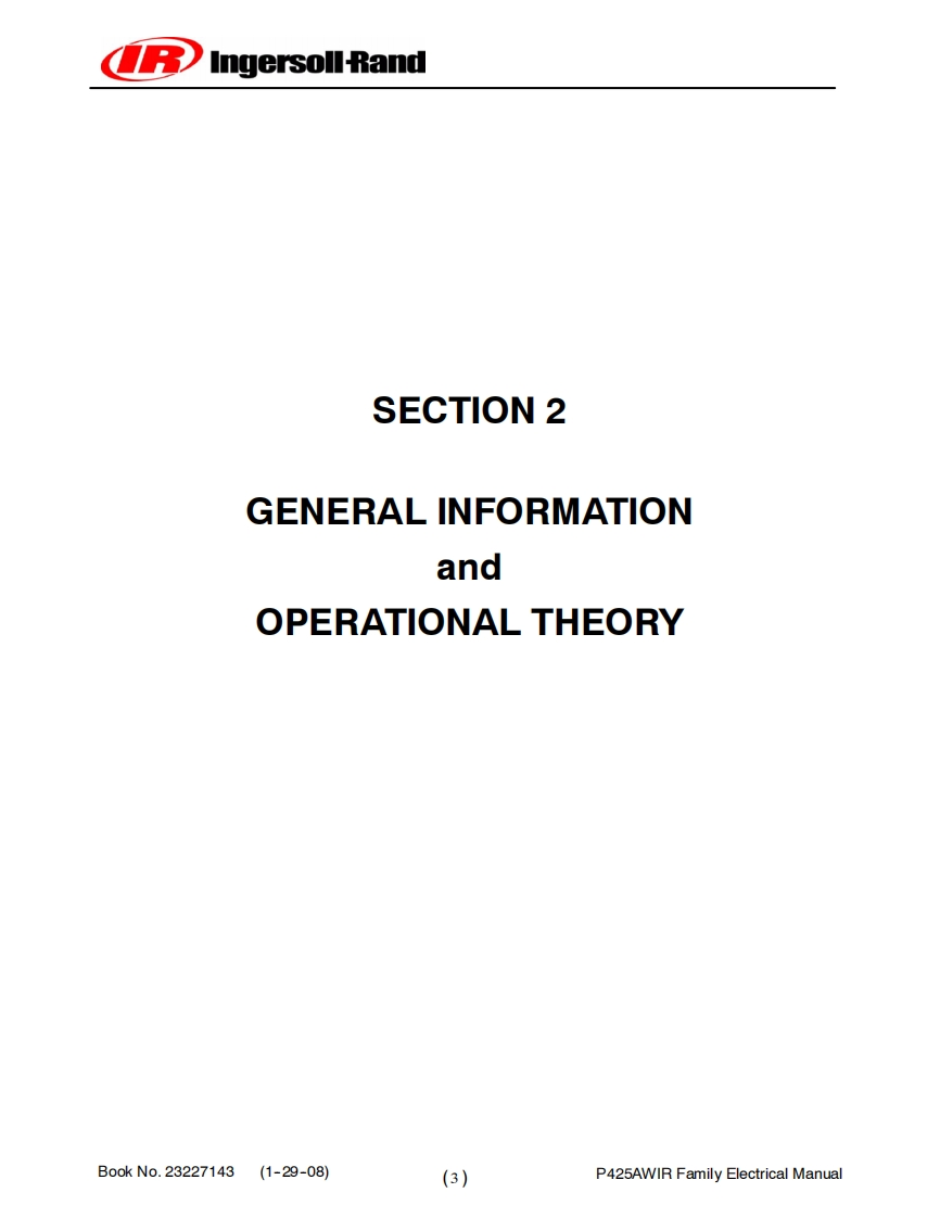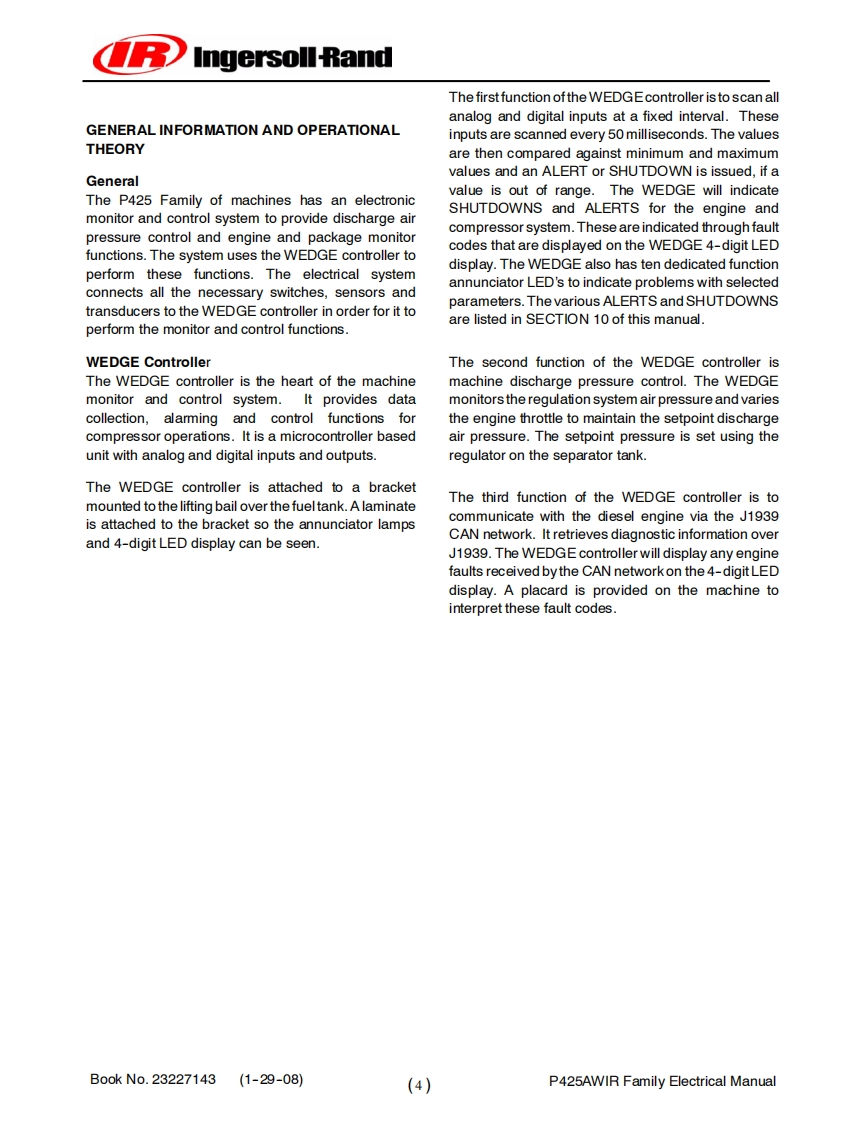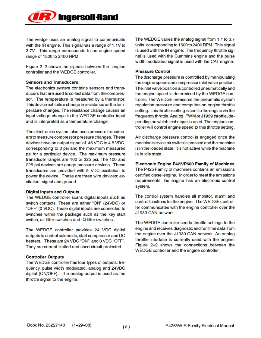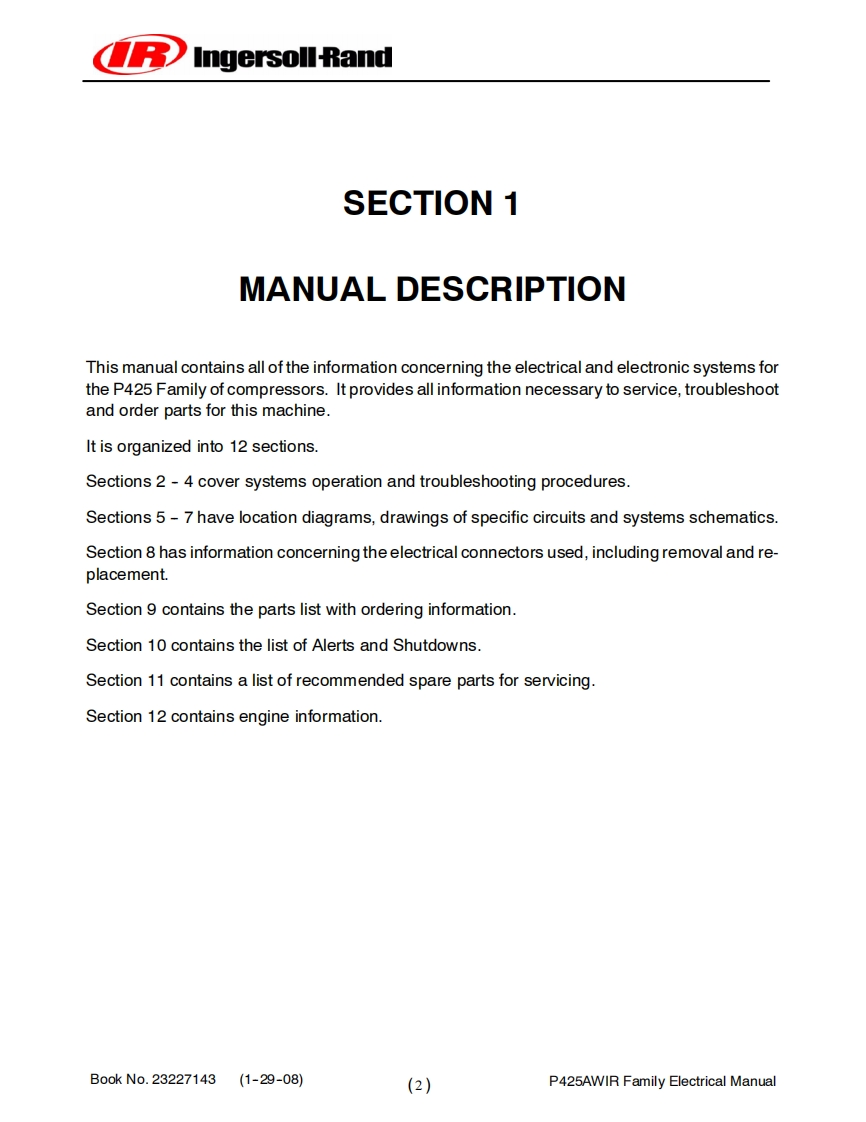 DOOSANDoosan InfracorePortable PowerIngersoll RandELECTRICAL/ELECTRONIC SERVICEMANUAL FOR:P425WIR(7/120)P600WIRXP375WIR(9/110)HP450WIRHP350WMR(4/105)VHP400WIRCODE:CCODE:BThis manual contains important safety information.Do not destroy this manual.This manual must be available to the personnel who operate and maintain this machine.Doosan Infracore Portable PowerP.O.Box 868 -501 Sanford AveMocksville.N.C.27028www.doosanportablepower.comin nattre.and is not meant to suggest a current afiliation betweenIngersoll-Rand Company and Doosan Company or te products ofeiterB0ok:23227143(01/08)RevARevised (10-12)