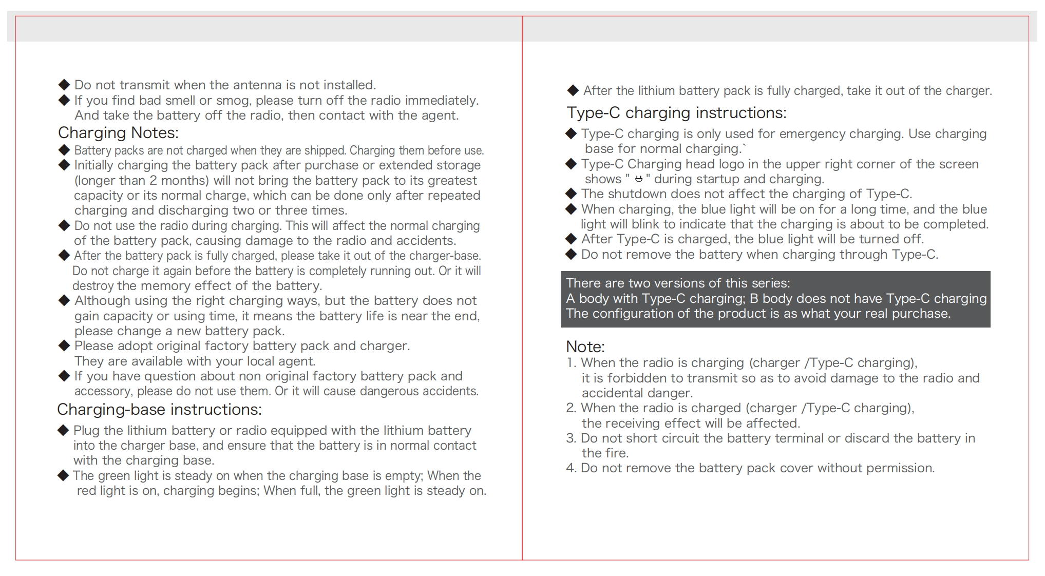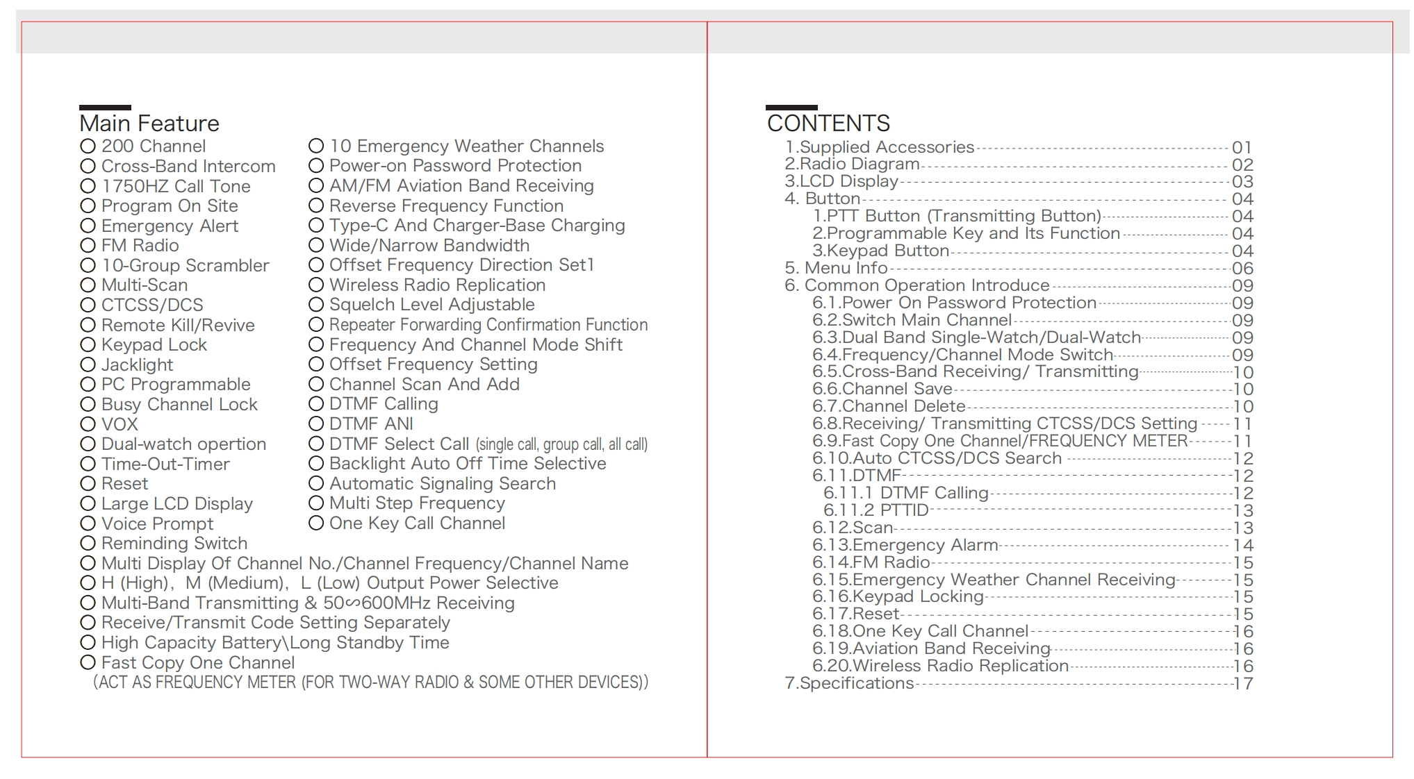 TWO-WAYRADIOC(∈s≤s尽User's ManualEmergency Weather Channel Receiving/Fast Copy One Channel/VOX/Multi-Band Transmitting and 50600MHz Receiving/Remote KillThis package is/Revive/TPYE-C and Charger-base Charging/200 Channels100%recyclableK5-3