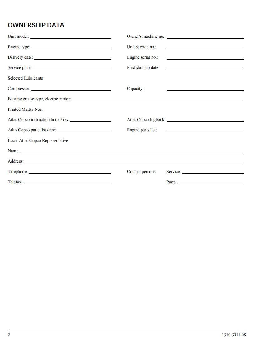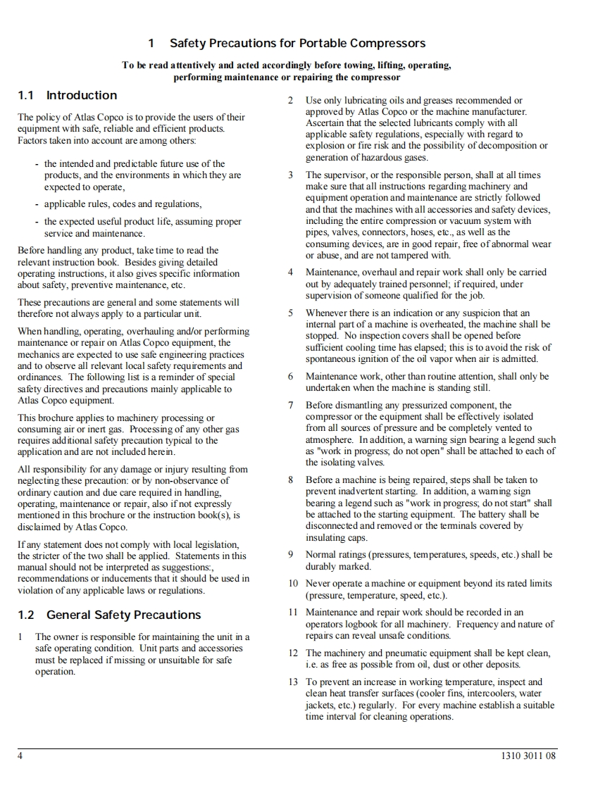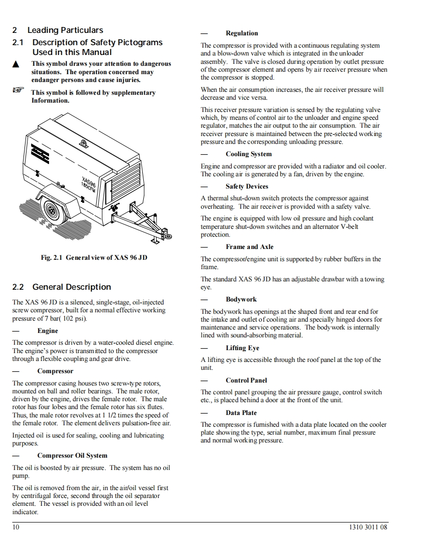 Atlas Copco Portable CompressorsXAS96Instruction Book1310301108Ed.01998-06"Copyright 1998,Atlas Copco Compressors,Inc.Holyoke,MassachusettsAny unauthorized use or copying of the contents or any part of this book is prohibited.This applies in particular to trademarks,model denominations,part numbers anddrawings.”No.1310301108Ed.01998-06Atlas Copco