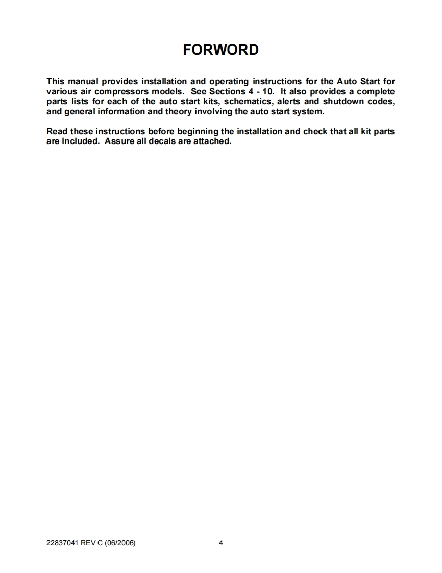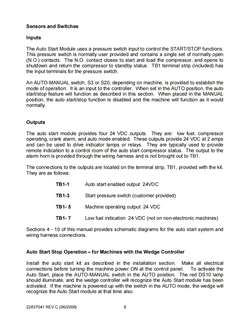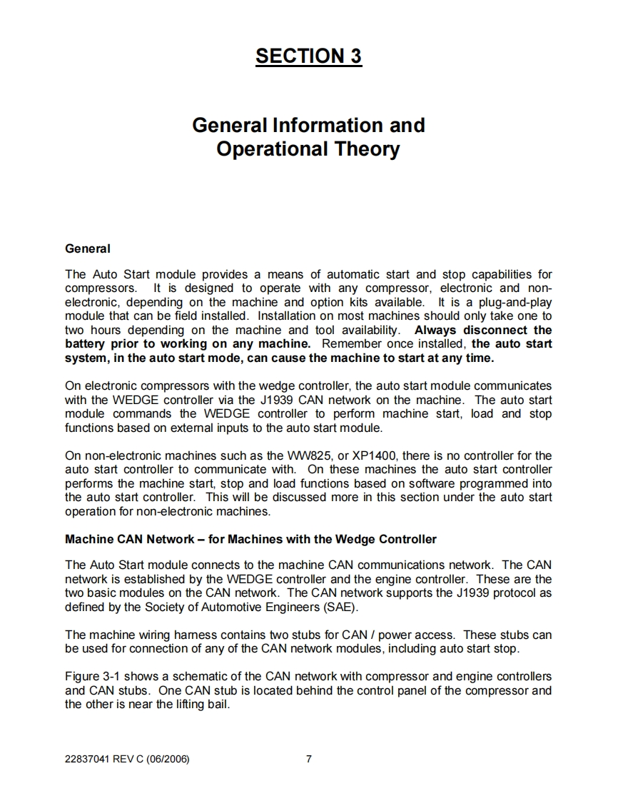 Ingersoll RandConstruction TechnologiesINSTALLATION,OPERATION AND SERVICEMANUALFORAUTO START STOP SYSTEMOPTION FOR COMPRESSORSIngersoll RandConstruction TechnologiesUtility EquipmentDoosan purchased Bobcat Company from Ingersoll-Rand Company inP.0.Box868service mark501 Sanford Aveto Ingersoll-Rand Company in this mantal is historical or nominativeMocksville,N.C.27028n natire,and is not meant o suggest a current affiliation benveenIngersoll-Rand Company and Doosan Compony or the products ofwww.portablepower.irco.cometther.22837041REVC(06/2006)Revised(09-12)1