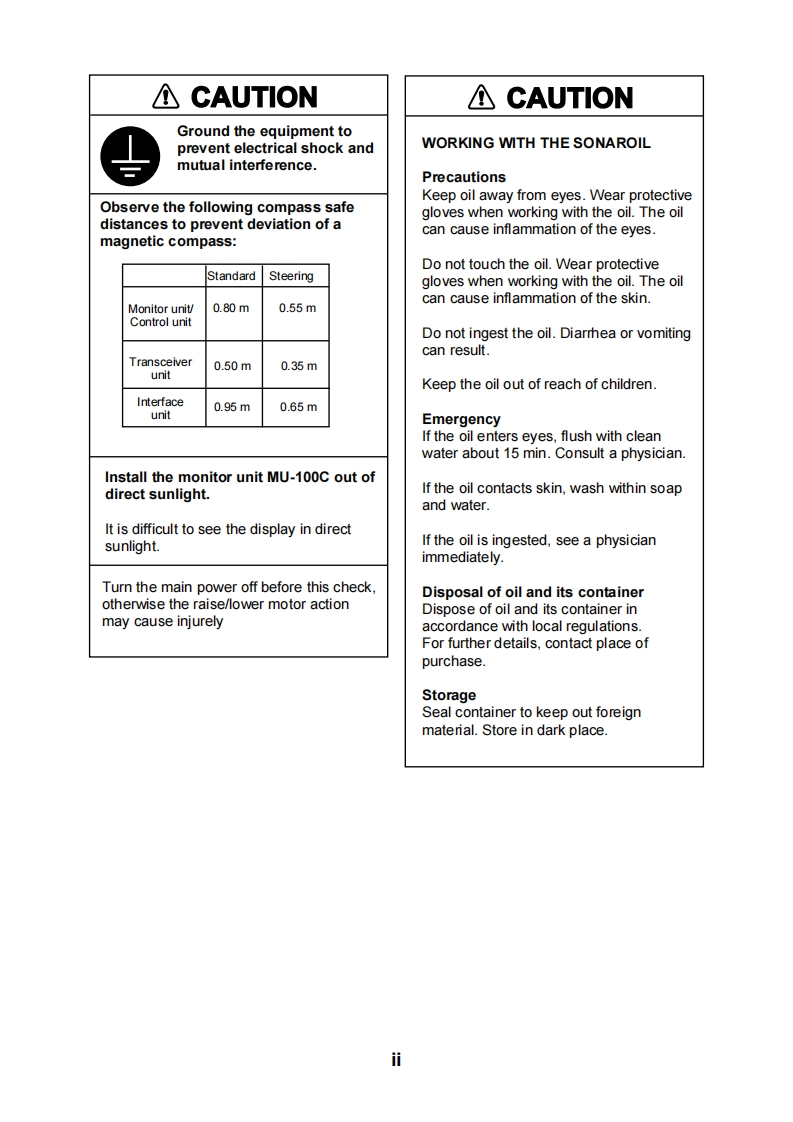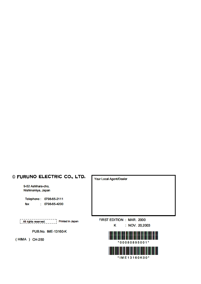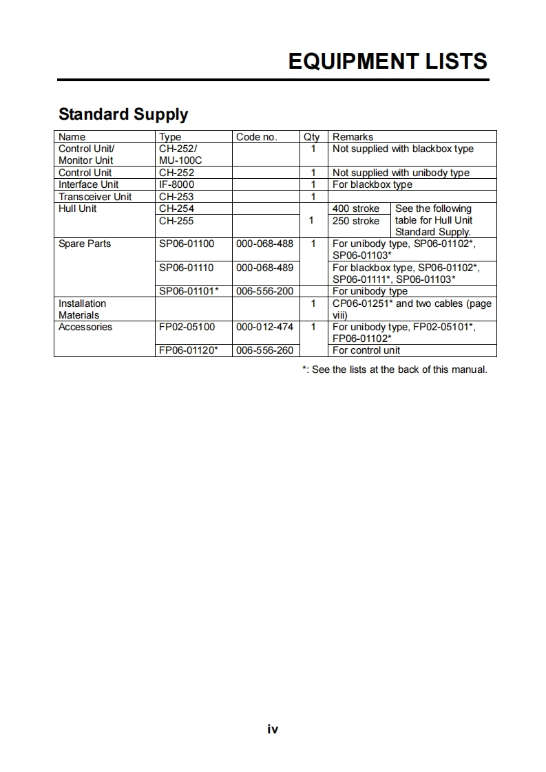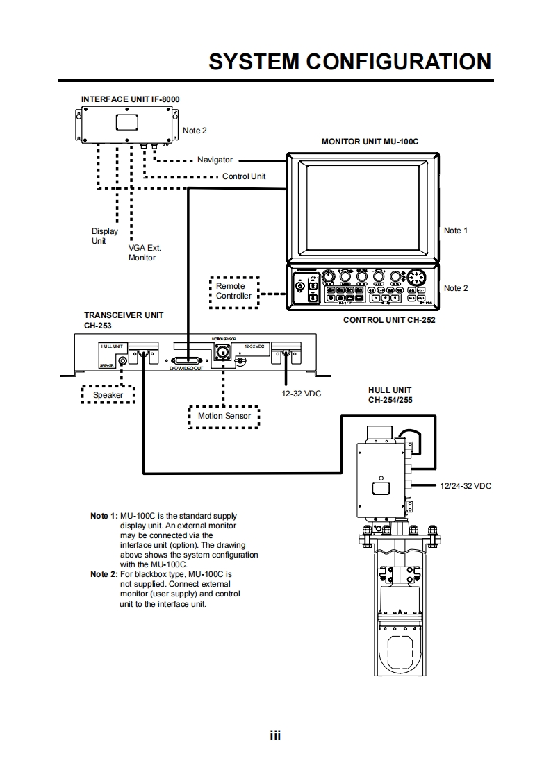 BackInstallation ManualSEARCHLIGHT SONAR CH-250SAFETY INSTRUCTIONS......................3.ADJUSTMENTS...............................31SYSTEM CONFIGURATION.................3.1 General checks.313.2 TX Frequency Checking........32EQUIPMENT LISTS.........3.3 Heading Adjustment/Soundome Setting1.Mounting.........m..........m....m...1.1 Monitor Unit/Control Unit.......3.4 Adjustment of Motion Sensor...............371.2 Transceiver Unit.....63.5 System Back Up..383.6 Setting of Interface Unit.................401.4 Interface Unit...21Input/Output Description.................411.5 Motion Sensor MS-100 (option)............222.Viring............23PACKING LISTS..............A-12.1 Wiring among Units.............232.2 Transceiver Unit....26OUTLINE DRAWINGS......D-12.3 Hull Unit.2INTERCONNECTION DIAGRAMS.....S-1FURUNO ELECTRIC CO.,LTD.NISHINOMIYA,JAPAN