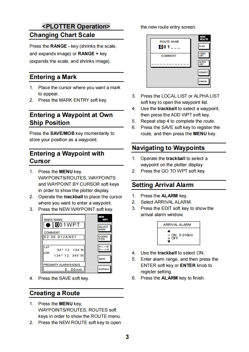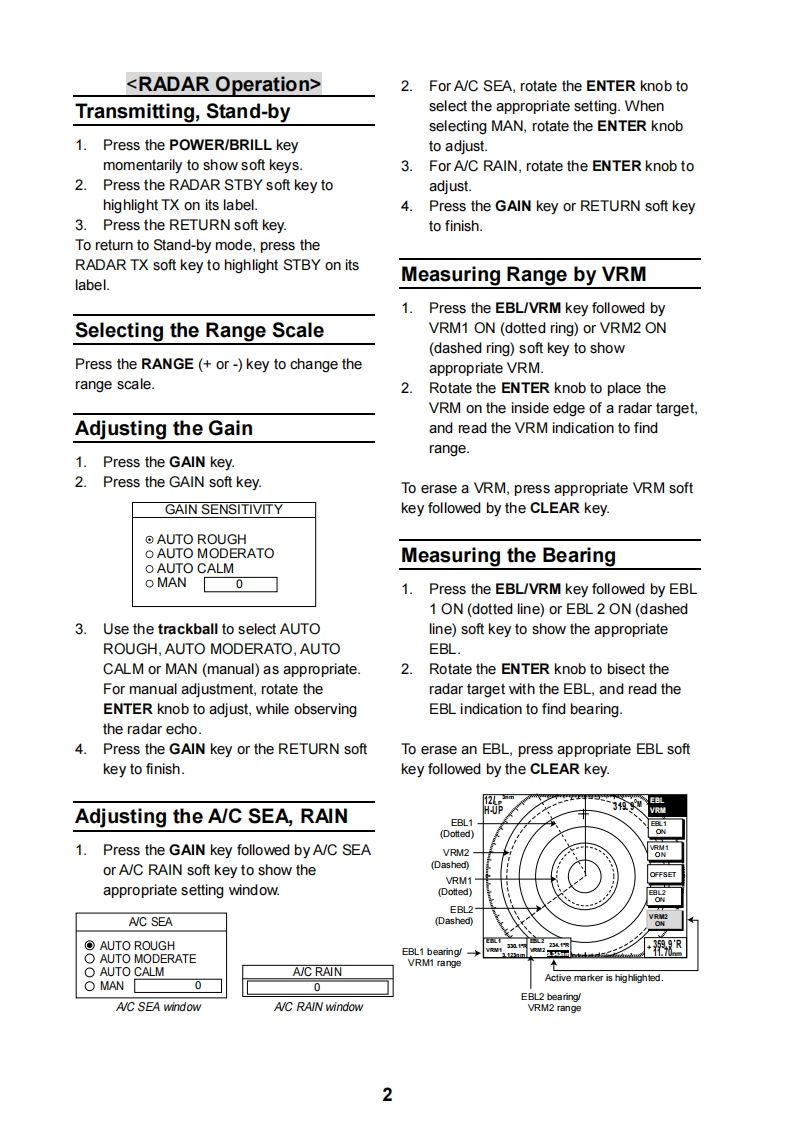 NAVnetMODEL1824C/1834C/1934C/1944C/1954CGD-1920C Operator's GuideThe purpose of this Operator's Guide is to provide basic operating procedures for thisequipment.For more detailed information see the Operator's Manual.8⑦Opens/closes the alarm menu.Clears data;erases selected mark.Opens/closes the main menu.DISP④Selects a range.⑤Enter alphanumeric data.②Radar:Displays the soft keys foradjustment of gain,A/C SEA,A/C RAIN④③Sounder:Adjusts gain.⑦Press three seconds:Turns power off.Momentary press:Turns the power on;shows soft keys for adjustment of brillianceand hue;shows RADAR STBY/TX soft key.⑧Displays the mode selection window.Momentary press:⑤Registers own ship's position as a waypoint.Press three seconds:GMarks man overboard position.Shows or hides the soft keys,function keys,nav data.Displays soft keys for EBL/VRM.⑦3Soft keysTrackballShifts EBL/VRM and cursor:Chart driveselects menu items and options.③ENTER knobPush:Registers setting.Rotate:Adjusts gain,VRM,EBL,etc.;selects menu items and options.May alsobe used to enter alphanumeric data.Turning the Power On/OffSelecting a DisplayTuming on the power1.Press the DISP key to show the displayPress the POWER/BRILL key momentarily.selection window.2Rotate the ENTER knob to select a basicTuming off the powerdisplay screen,and then push it.Press and hold down the POWER/BRILL key3.Rotate the ENTER knob to select auntil the screen goes off(approx.3 sec.)combination display.4.Push the ENTER knob.FURUNO ELECTRIC CO.,LTD.NISHINOMIYA,JAPAN