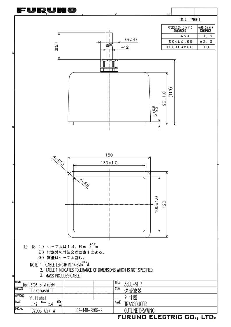 FO”OPERATOR'S MANUAL38BL-9HR TRANSDUCERABLT transducer(Bolt-clamp Langevin Transducer)38BL-9HR has been developed forFCV-291/292/1100L/1200L/1500 and ETR-30N.The BLT transducer has large bandwidth,good sound efficiency,compact structure and isreinforced for protection against slamming.△WARNINGCAUTIONTurn off the power at theDo not install the BLT transducer whereswitchboard beforenoise or air bubbles is present.beginning the installation.Performance will be affected.Fire or electrical shock canresult if the power is left on.The BLT transducer cable must heBe sure no water leaks in at the trans-handled carefully,following theducer mounting location.guidelines below.Water leakage can sink the vessel.Also,Keep fuels and oils away from thecable.confirm that the transducer will not loosenLocate the cable where it will not beby ship's vibration.The installer of theequipment is solely responsible for thedamaged.proper installation of the equipment.The cable sheath is made of chloro-FURUNO will assume no responsibility forphrene or polychloride vinyl,whichany damage associated with improperare easily by damaged plastic solventssuch as toulene.Locate the cableinstallation.well away from plastic solvents.Do not lift the BLT transducer by itscable.Wires of the BLT transducermay be cut.FeaturesWhen the BLT transducer is connected to the FCV-1100L or FCV-1200L,sensitivity issufficient even if the frequency is shifted +10%to suppress interference.The BLT transducer can be installed in tank for the transducer shown in the table below.BLT transducerTransducerOutputNote on replacement ofpreviously usedtransducer38BL-9HR28BL-6HR2 kWAdd spacers.P0B.N0.0MC-20312-A(0401,TENI)38BL-9HR*00014916200*