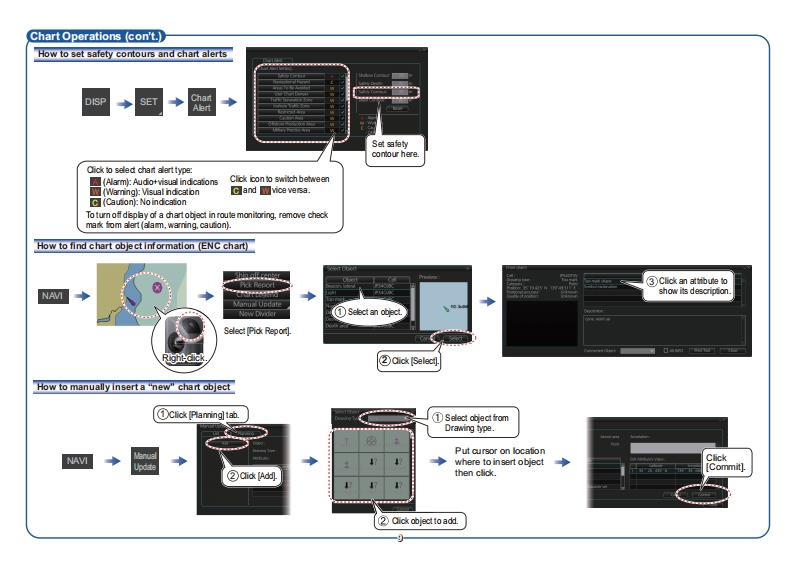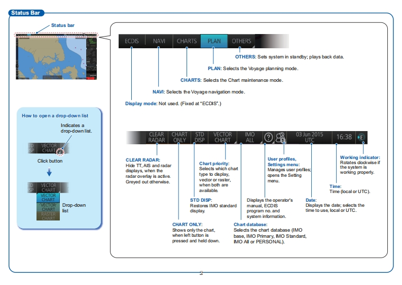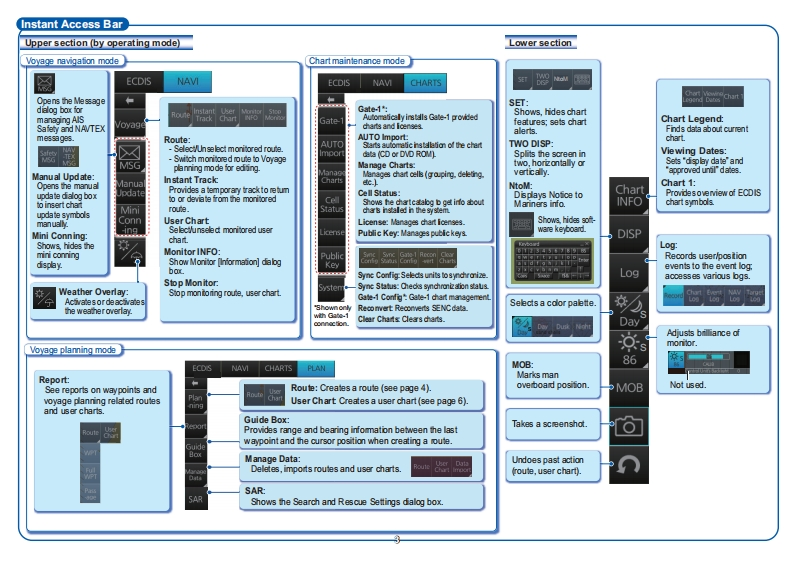 FURUNOElectronic Chart Display and Information System(ECDIS)This gui生oid燃h地basicoperairgOperator's Guideproced山res for thi台6 quipment.For det3edEnglishmormon,see the Operalor's ManuslFMD-3100(For PCU-3010)The brand and produd names menioned in thig地a地ademark移,f3s时3emas位Complies with IEC62923-1/2Modelia边mak等耐heir respec5地hausDisplay LayoutStatus bar (See poge 2-)InstantAccess bar580pg93)Chart scale/presentation mode boxCursor position boxSensor information boxHDG 356.4 GYRO1251n0.0knc06356.4Upper0625.1kn焦绝cfom6039,191'NElectronic chart area02456.591°EOwn ship functions boxOfbctG584TM/OU ResctRouteinformation boxlnte indormbionn200knan Coutte:网Course to Steer:153.0'里4150m7061.7mTools boxTo WPT:DIST to WOe3924●D9g30:44LowerTum RAnTum Ratesecton2到4EBL1box,Permanent warnings boxVRM1 box,EBL2boxVRM2 boxAlert boxECDIS112Off Track