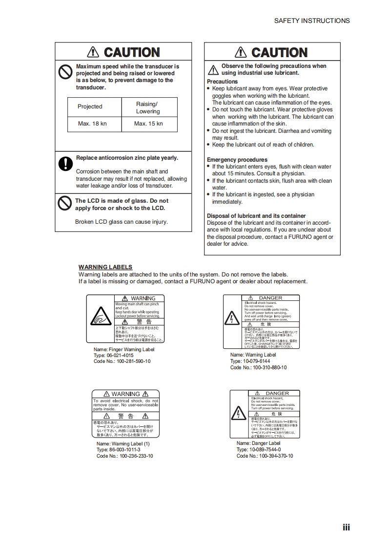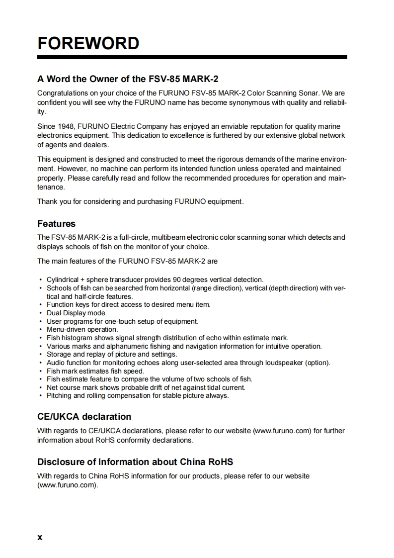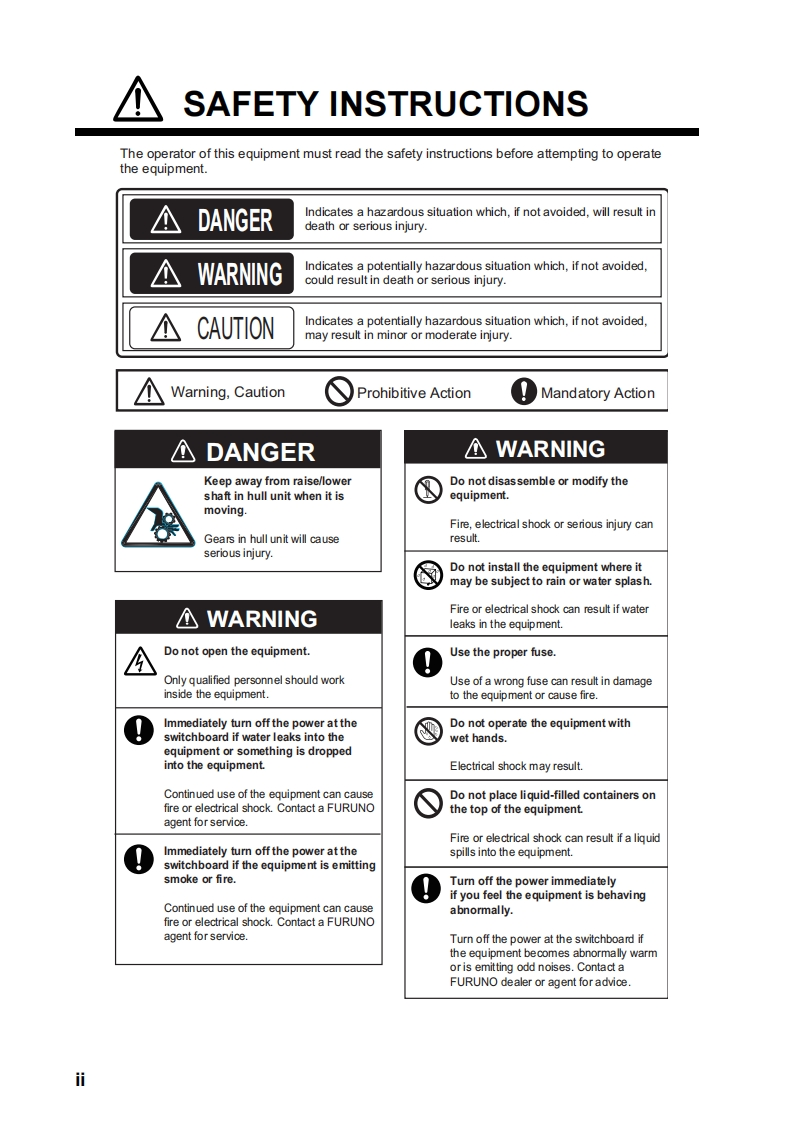 IMPORTANT NOTICESGeneralThis manual has been authored with simplified grammar,to meet the needs of intemational users.The operator of this equipment must read and follow the instructions in this manual.Wrong operation or maintenance can void the warranty or cause injury.Do not copy any part of this manual without written permission from FURUNO.If this manual is lost or worn,contact your dealer about replacement.The contents of this manual and the equipment specifications can change without notice.The example screens (or illustrations)shown in this manual can be different from the screens yousee on your display.The screens you see depend on your system configuration and equipmentsettings.Save this manual for future reference.Any modification of the equipment (including software)by persons not authorized by FURUNO willvoid the warranty.The following concern acts as our importer in Europe,as defined in DECISION No 768/2008/EC.Name:FURUNO EUROPE B.V.-Address:Siriusstraat 86,5015 BT,Tilburg,The NetherlandsThe following concern acts as our importer in UK,as defined in SI 2016/1025 as amended SI 2019/470.Name:FURUNO(UK)LTDAddress:West Building Penner Road Havant Hampshire PO9 1QY,U.K.All brand,product names,trademarks,registered trademarks,and service marks belong to theirrespective holders.How to discard this productDiscard this product according to local regulations for the disposal of industrial waste.For disposal inthe USA,see the homepage of the Electronics Industries Alliance (http://w.eiae.org/)for thecomrect method of disposal.How to discard a used batterySome FURUNO products have a battery(ies).To see if your product has a battery,see the chapteron Maintenance.If a battery is used,tape the and -terminals of the battery before disposal to pre-vent fire,heat generation caused by short circuitIn the European UnionThe crossed-out trash can symbol indicates that all types of batteriesmust not be discarded in standard trash,or at a trash site.Take theused batteries to a battery collection site according to your nationallegislation and the Batteries Directive 2006/66/EU.In the USAThe Mobius loop symbol(three chasing arrows)indicates thatNi-Cd and lead-acid rechargeable batteries must be recycled.Take the used batteries to a battery collection site according tolocal laws.Ni-CdPbIn the other countriesThere are no international standards for the battery recycle symbol.The number of symbols can in-crease when the other countries make their own recycle symbols in the future.i