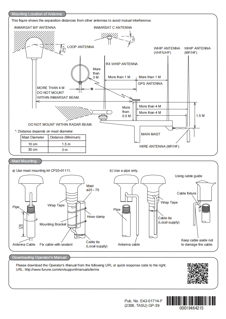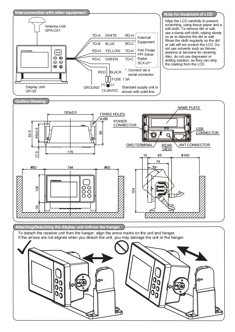 FURUNOGPS NAVIGATORThis quide provides the basic operating andinstallafion procedures for thisequipnt.Fordetailed information,see the Operator's Manual.EnglishModelGP-39Operator's GuideThe brand and product names mentioned in thisquide are trademarks,registered trademarks or(W/GPA-C01)service marks of their respecfive holders.Note:Refer to the Operator's Manual of SCX-21 whenusing the GP-39 with SCX-21 operation mode.How to select a languageOnly once after installation.InstallationLanguageEnglishFURUNO◆◆4GR38的Units>Time OffsetEnglishFrancaisDeToOperation ModeNote:When the SCX-21 is connected,nvietMelayu知set the "Operation Mode"menuIndonesia中文回to "SCX-21"to use the GP-39[NENU]Cancel [ENT]Entas a control unit of the SCX-21因How to adjust brilliance of LCD and keyBrillianceLCDHinNaxENT■V HinHax▲5How to select a displayHow to go to/Edit/Delete a waypointPlotterHighwaySteering2903714.6.300135线.82DISP1指微78458品↓GotoNavigationWPT-AlphaWPT-Distance34°44.589WRoute-Alpha13521.074Ee-Distance14.6w·300User Display 1 and 2↓[MENU]Cancel [ENT]Enter A/V:Sel.User 2User 1Satellite monitorw3加330300240ENT40.040.0When connecting SCX-21User Display 1 and 2↓User 2User 13-Axis SpeedHDG(Heading)Menu >Waypoints >Naypoint List145.0.50162.n3030NameMark RNG(WM)BRG(】0.00300[New]7.0°1.0mt7.020.d0.50359.dW20.060WP0000●Green100WP0001●Green150How to enter a waypoint:(Other than plotter display)(Plotter display only)[MENU]Cancel [ENT]:Enter A/V:SelWPxxxx4GP-39MO○>ENTGotoCNTENT◆罗◆Move theMovecursor (+Current shipEditposition is setDeleteas a waypoint.Henu >Maypoints >Waypoint ListNaneNark RNG(NM)BAG()How to enter a MOBP0000 Green0.15■100■P0001●Green0.1060t0Saved To MOBEditDeleteGoto MOBMARKENTMOE[MENU)Cancel [ENT]:Enter A/V:Sel.Yes■NoLong press[NENU]:Cancel [ENT]:Enter A/V:Sel.ENTSee Operator's Manual on how to create a route from a registered waypoint.