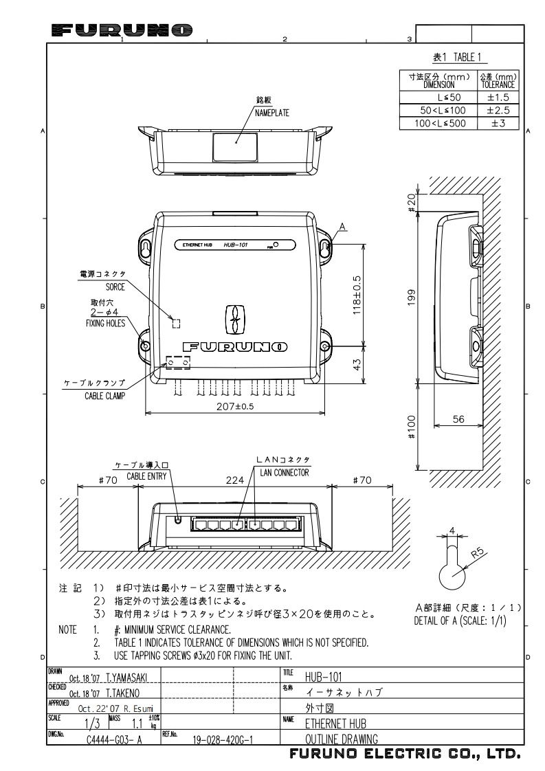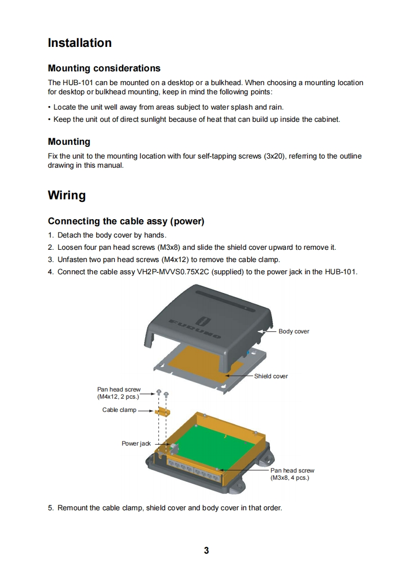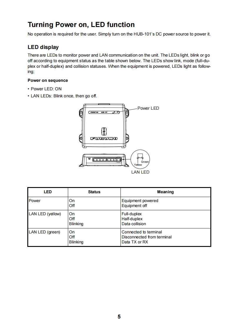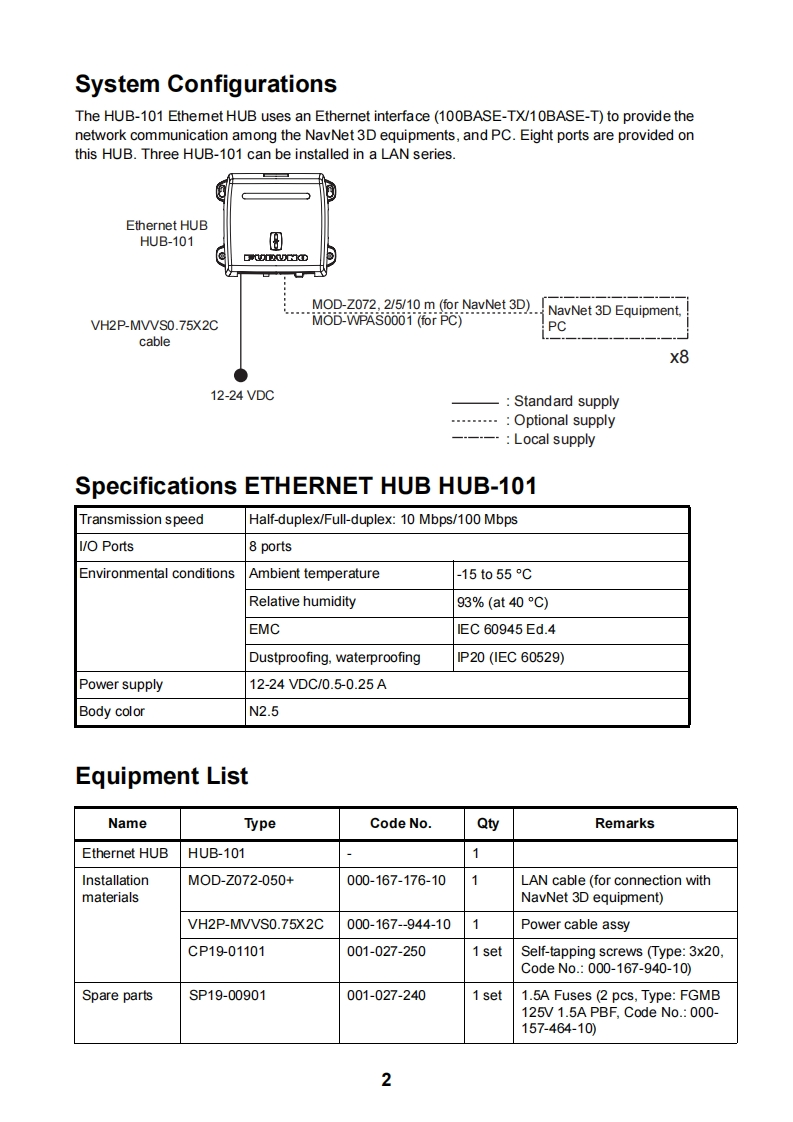 FURUNOINSTALLATION GUIDEETHERNET HUBHUB-101△WARNING△CAUTIONDo not open the shieldObserve the following compass safecover unless totally familiardistances to prevent interference to awith electrical circuits.magnetic compass:Only qualified personnelshould work inside thestandardsteeringequipment.compasscompassHUB-1010.80m0.50mDo not install the unit where it may getwet from rain or water splash.Water in the unit can result in fire,electricalshock or damage the equipment.Use only the specific power cable.Fire or damage to the equipment can resultif a different cable is used.Do not disassemble or modify theequipment.Fire,electrical shock or sirious injury canresult.NAVnet7FURUNO ELECTRIC CO.,LTD.www.furuno.co.jp