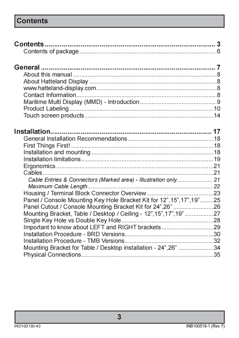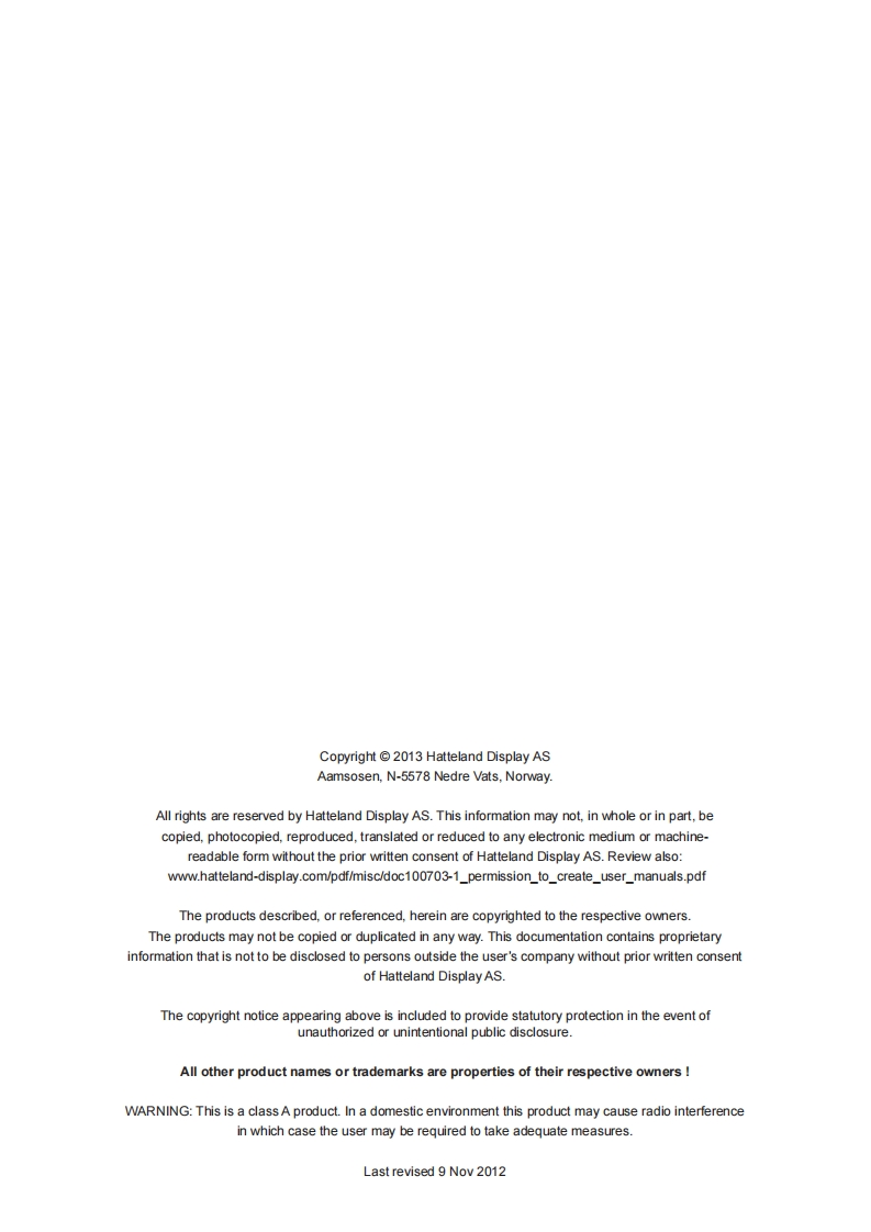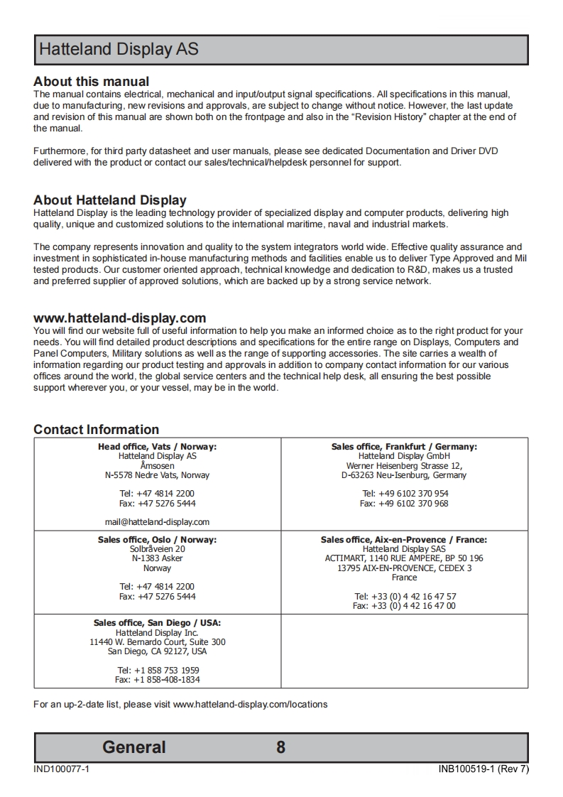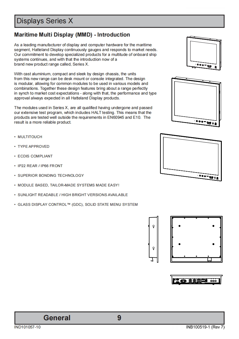 HATTELANDDISPLAYUSERMANUAL·过Series X-Maritime Multi Display (MMD)ModelsHD 12T21 MMD-xxx-Fxxx -12.1 inch Maritime Multi DisplayHD 15T21 MMD-xxx-Fxxx-15.0 inch Maritime Multi DisplayHD 17T21 MMD-xxx-Fxxx-17.0 inch Maritime Multi DisplayHD 19T21 MMD-xxx-Fxxx-19.0 inch Maritime Multi DisplayHD 24T21 MMD-xxx-Fxxx-24.0 inch Maritime Multi DisplayHD 26T21 MMD-xxx-Fxxx -25.54 inch Maritime Multi DisplayUser Manual MMD Series XUpdated:03 Jul 2013 Doc ld:INB100519-1 (Rev 7)Created:363Approved:6542Please visit www.hatteland-display.com for the latest electronic version of this manual.Hatte land Display AS,Amsosen,N-5578 Nedre Vats,NorwayTel:47]4814 2200-maildhatteland-display.com -www.hatteland-display.com