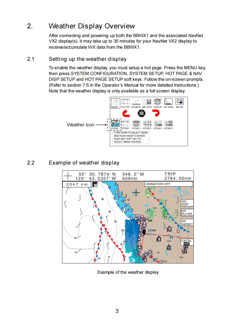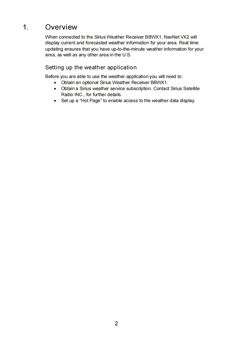 NAVnetSIRIUS SATELLITE WEATHERREFERENCE MANUALThe purpose of this manual is to provide operating procedures for NavNet VX2'sSirius Satellite Weather capability.An optional Sirius Weather Receiver BBWX1 andSirius subscription are required.This manual is provided in addition to the NavNetVX2 Operator's Manual,which fully covers operating procedures for the NavNetVX2 system.Sample screens are shown in landscape format.Sirius weathercoverage is currently available only in U.S.and Canada.Information provided by the Sirius Marine Weather service is advisory nature only.You,the customer,agree to release FURUNO ELECTRIC CO.,LTD.,Sirius SatelliteRadio Inc.,Navcast Inc.and WSI Corporation from any and all claims arising fromthe use of this service,and you acknowledge that you have read the terms of yoursubscription agreement and agree to all the tems therein.If you do not have thesubscription agreement,you will find a copy at:www.sirius.com/marineweatheragreement or call 1-800-869-5480 to have a copysent to you.Table of Contents1.Overview..22.Weather Display Overview...............32.1 Setting up the weather display32.2 Example of weather display........33.Weather Icons.….43.1 Showing/hiding weather data layers..53.2 Weather Icons descriptions...........54.Weather Animation............125.Weather Reports.............136.Weather Menu Settings.14FURUNO ELECTRIC CO.,LTD.www.furuno.co.jp