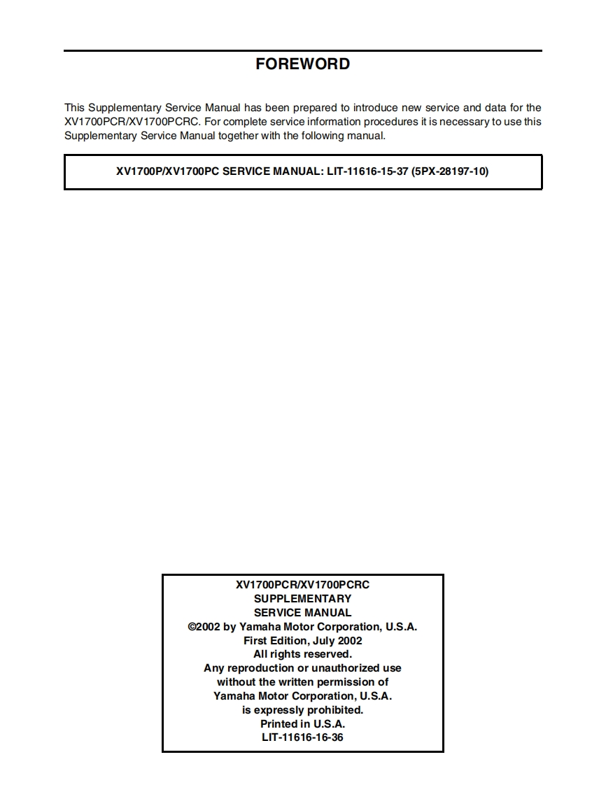 YAMAHA摩托车XV1700PCRC维修手册找手册网25天前发布关注私信25.29MB605页049YAMAHA摩托车XV1700PCRC维修手册此内容为付费资源,请付费后查看¥19¥21黄金会员免费钻石会员免费登录购买付费资源 第1页 / 共605页 第2页 / 共605页 第3页 / 共605页 第4页 / 共605页 第5页 / 共605页 第6页 / 共605页 第7页 / 共605页 第8页 / 共605页 第9页 / 共605页 第10页 / 共605页 试读已结束,还剩595页,您可下载完整版后进行离线阅读 THE END雅马哈机车 文本预览 YAMAHAXV1700PCRXV1700PCRCSUPPLEMENTARYSERVICE MANUALL1T-11616-16-365PX-28197-11 查看更多 收起部分 喜欢就支持一下吧收藏