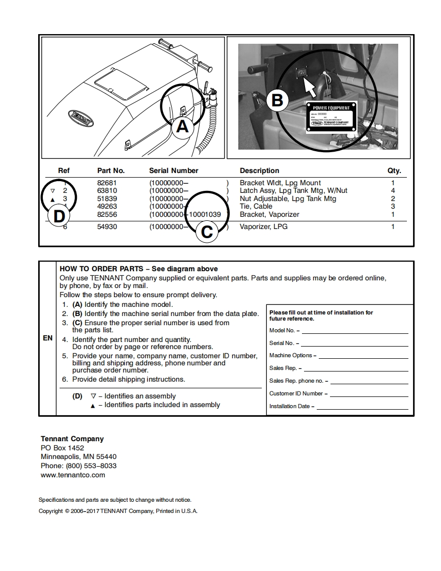 TENNANT5700(Electric)Walk-Behind ScrubberParts Manual(S/N10000000-S女H2Foam Scrubbing TechnologyThe Safe Scrubbing AlternativeNanoCleanTennantTrue PartsESExtended Scrub SystemRISR a Tennant TechnologyTo view,print or downloadthe latest manual.visit:▣出www.tennantco.com/manuals331532North America InternationalRe.11(07-2017)www.tennantco.com