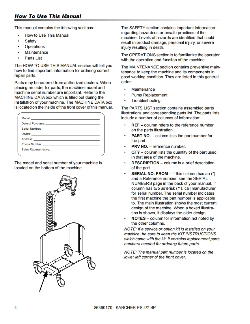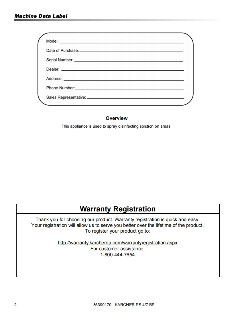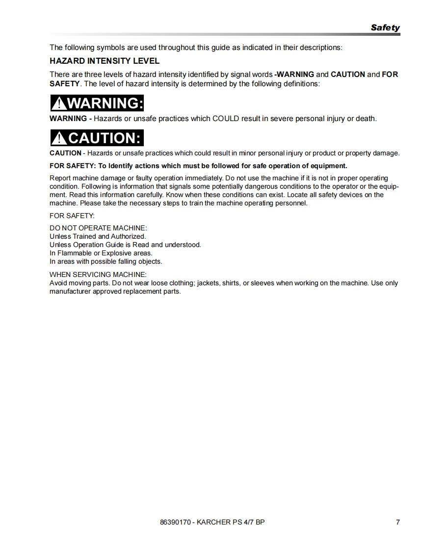 KARCHER®PS 4/7 BPOperating instructions(ENG)MODELS:TD12V1201.007-082.0WARNING:This product and accessories may contain a chemical known to theState of California to cause cancer and birth defects or otherreproductive harm.For more information about this regulation:ww.P65Warnings.ca.gov86390170-M12/08/18Read these instructions before using the machine.