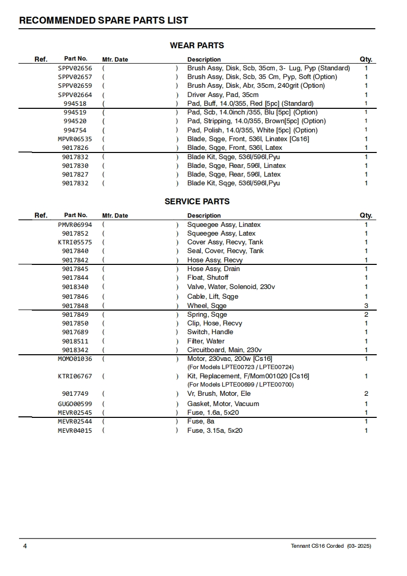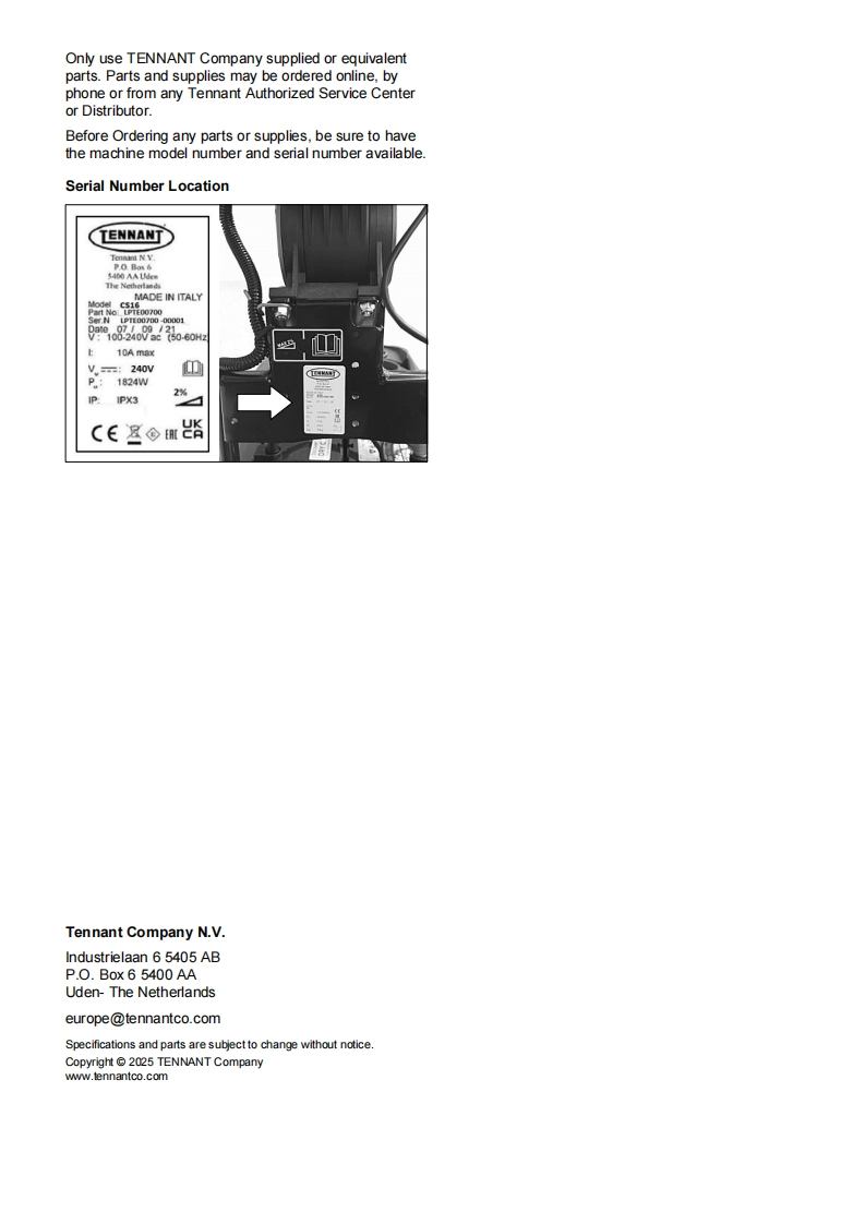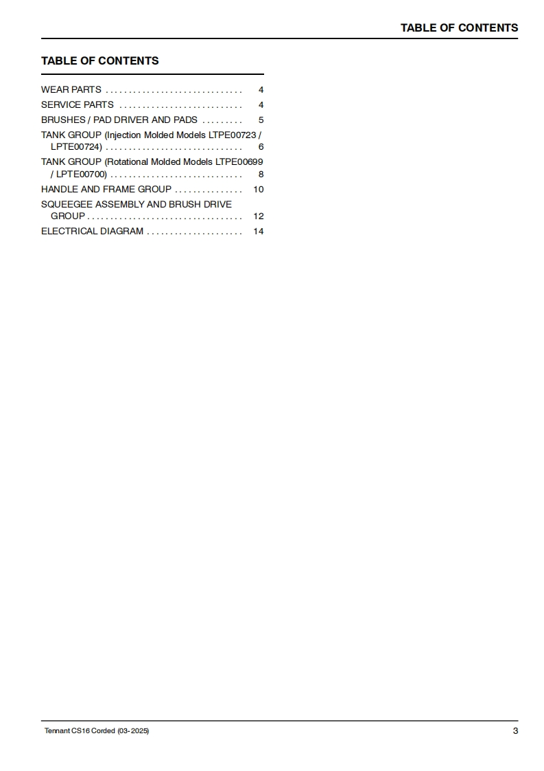 TENNANTCS16Corded Floor ScrubberParts ManualModel Part No.:LPTE00699-SCRUBBER [CS16 35CM BR.CORDED.EULPTE00700-SCRUBBER [CS16 35CM BR.CORDED.UKLPTE00723-SCRUBBER [CS16 35CM BR,CORDED,INJ MOLDED EU]LPTE00724-SCRUBBER [CS16 35CM BR,CORDED,INJ MOLDED UK]EuropeTo view,print or downloadTennant manuals,visit9021982www.tennantco.com/manualsRev.01(03-2025)
