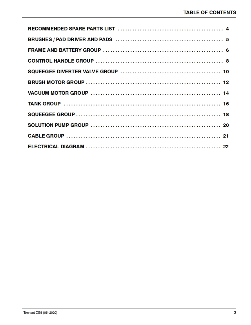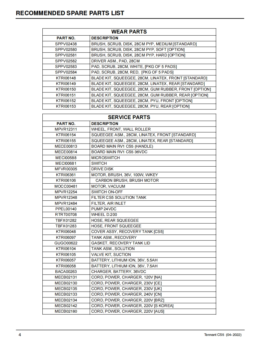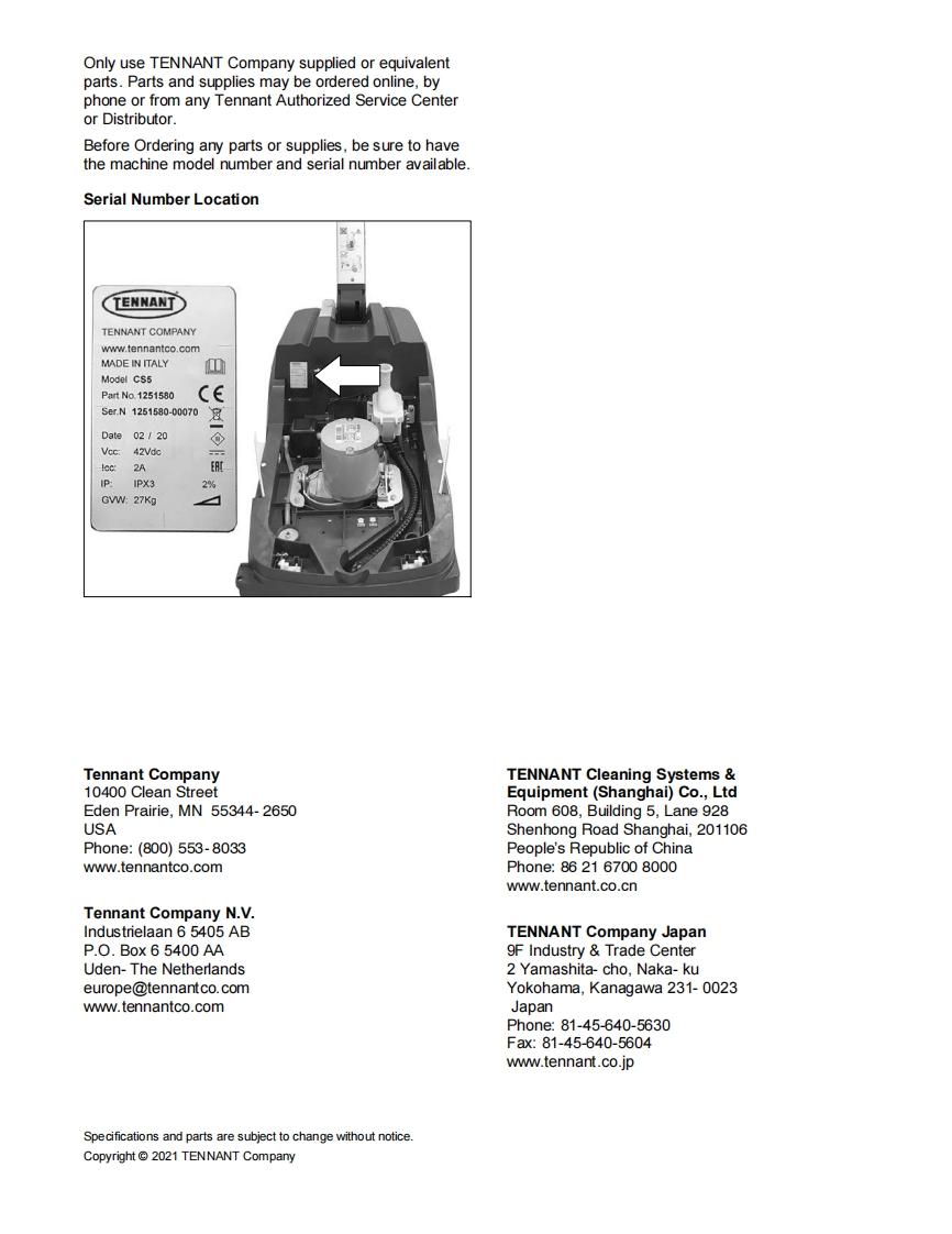 TENNANTCS5Compact Series Micro-ScrubberParts ManualModel Part No.1251580 CS5 BATTERY SCRUBBER,5.5AH [NA]1251584 CS5 BATTERY SCRUBBER,5.5AH [EMEA]LPTB03175 CS5 BATTERY SCRUBBER.7.5AH IEMEAI1251582 CS5 BATTERY SCRUBBER.5.5AH ICN/ANZLPTB03301 CS5 BATTERY SCRUBBER,7.5AH [ANZ]1251585 CS5 BATTERY SCRUBBER,5.5AH [EXPORT APAC]GlobalTo view,print or downloadTennant manuals,visit:9021061www.tennantco.com/manualsRev.03(04-2022)
