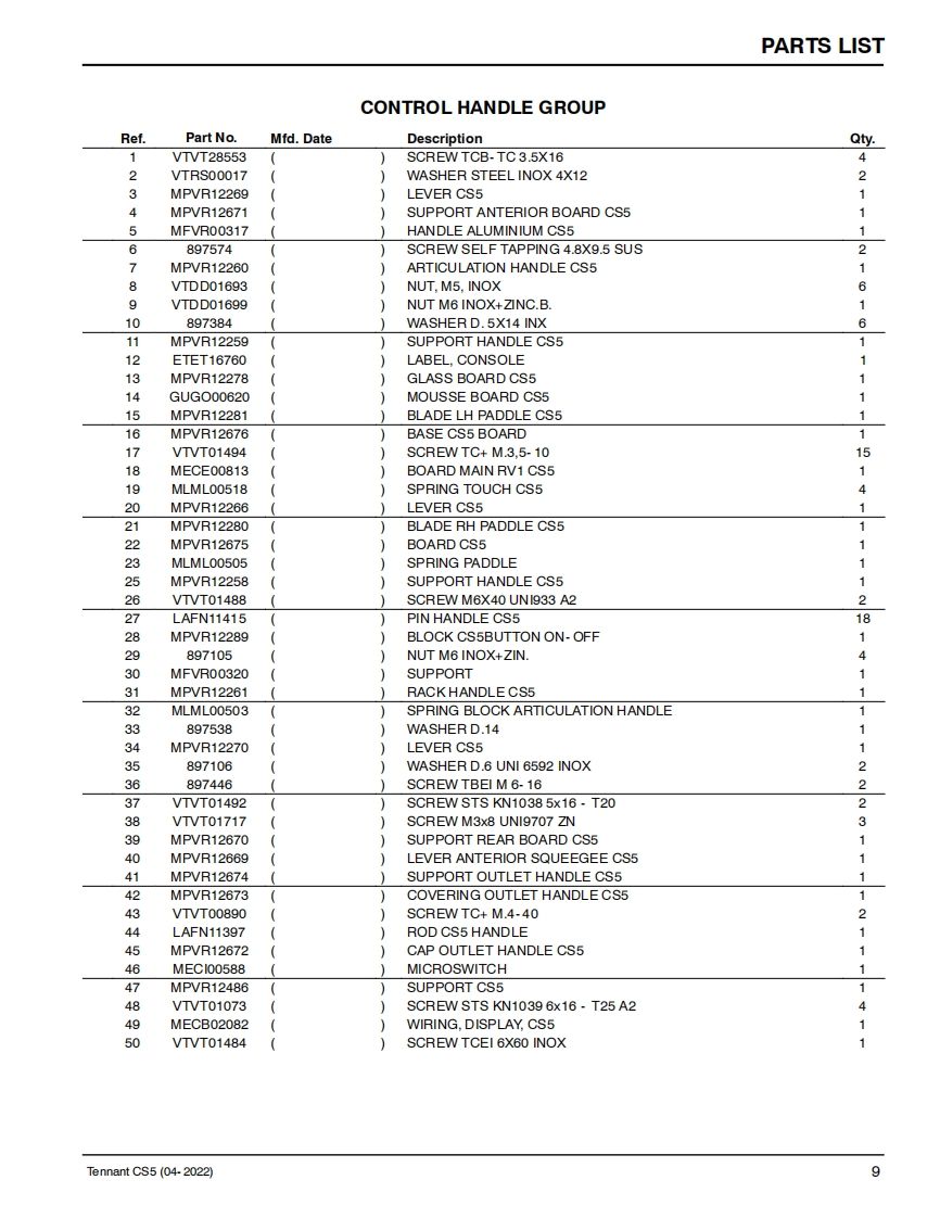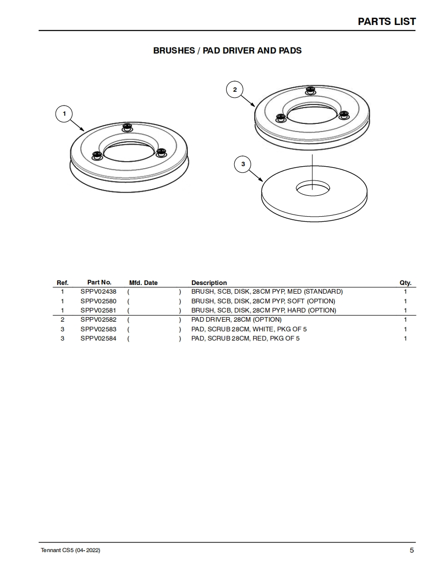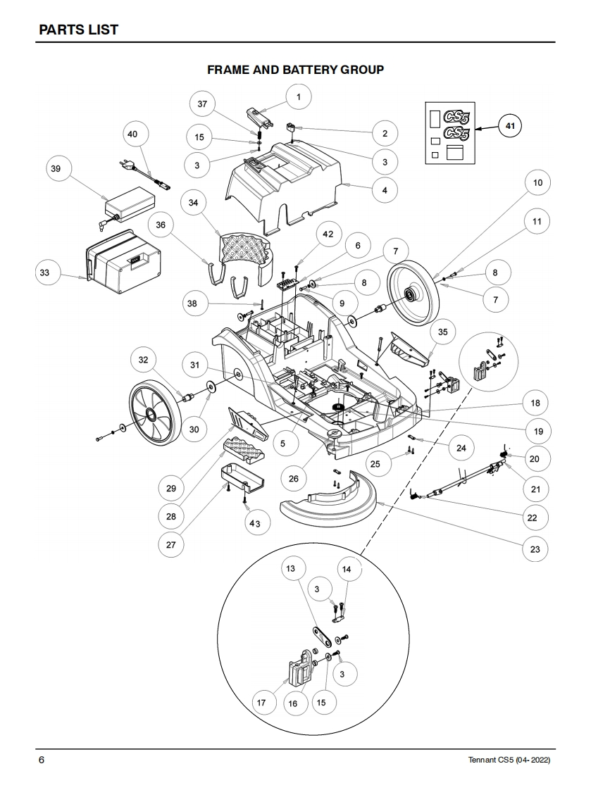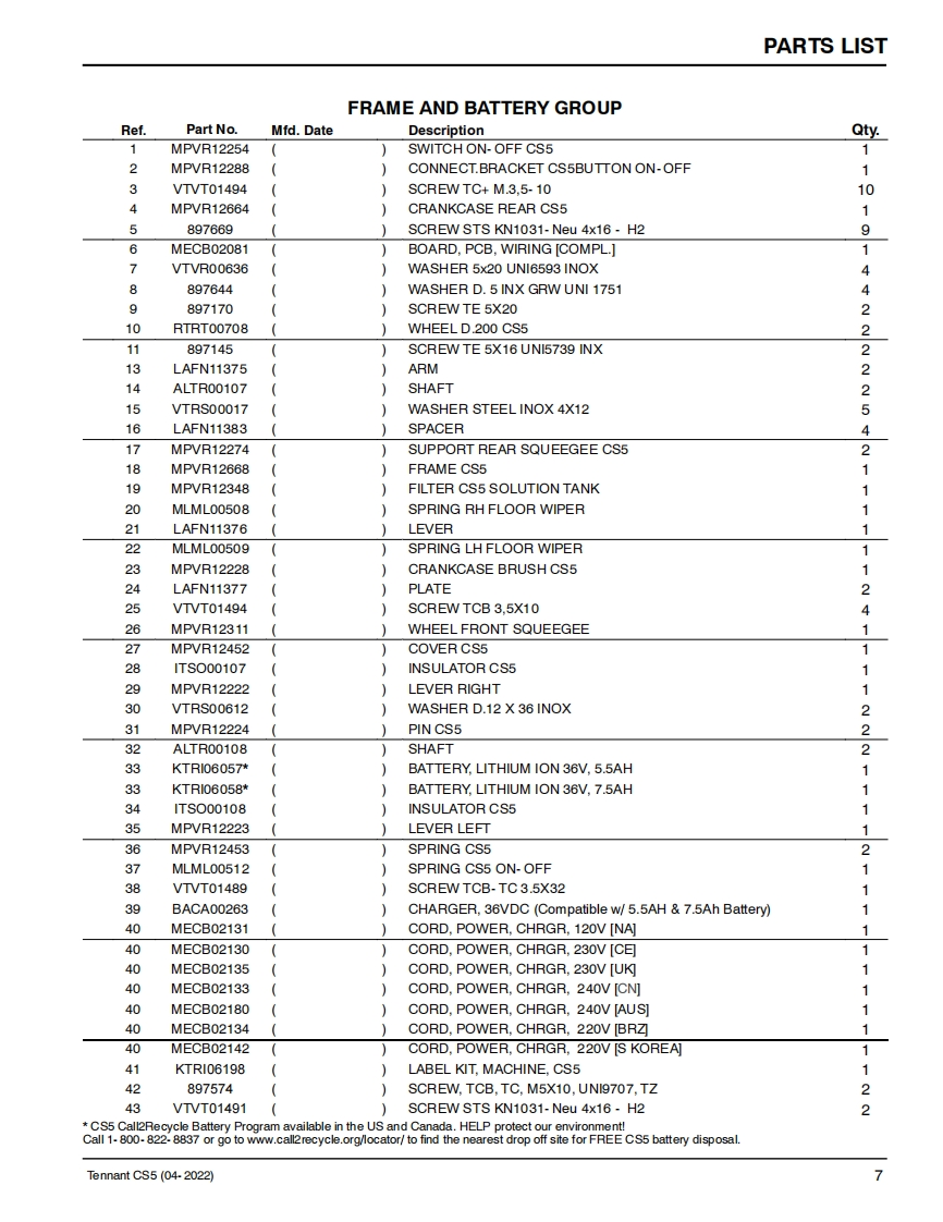 TENNANTCS5Compact Series Micro-ScrubberParts ManualModel Part No.1251580 CS5 BATTERY SCRUBBER,5.5AH [NA]1251584 CS5 BATTERY SCRUBBER,5.5AH [EMEA]LPTB03175 CS5 BATTERY SCRUBBER.7.5AH IEMEAI1251582 CS5 BATTERY SCRUBBER.5.5AH ICN/ANZLPTB03301 CS5 BATTERY SCRUBBER,7.5AH [ANZ]1251585 CS5 BATTERY SCRUBBER,5.5AH [EXPORT APAC]GlobalTo view,print or downloadTennant manuals,visit:9021061www.tennantco.com/manualsRev.03(04-2022)