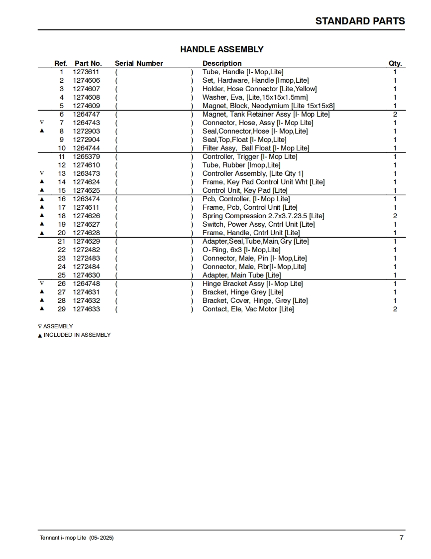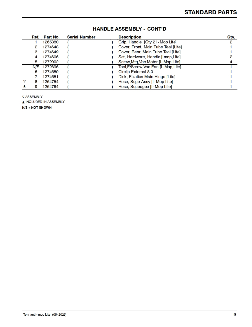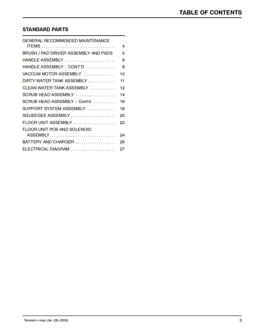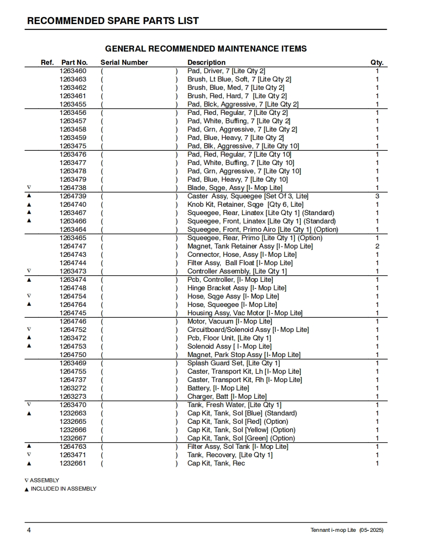 TENNANTi-mop LiteWALK-BEHIND FLOOR SCRUBBERMachine Serial Number Range(S/N800001-)(S/N200001-)Parts Manual0Model Part No.:1263271-i-mop Lite w/charger battery [N.America]9022310-i-mop Lite w/charger 2 batteries [N.America]1267978-i-mop Lite w/charger battery [Europe]Global9022382▣你▣For the latest Parts manuals and otherReV.03(05-2025)language Operator manuals,visit:www.tennantco.com/manuals