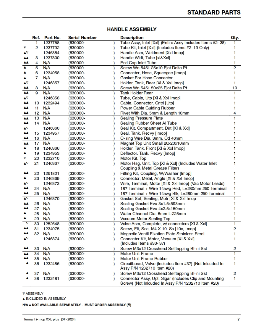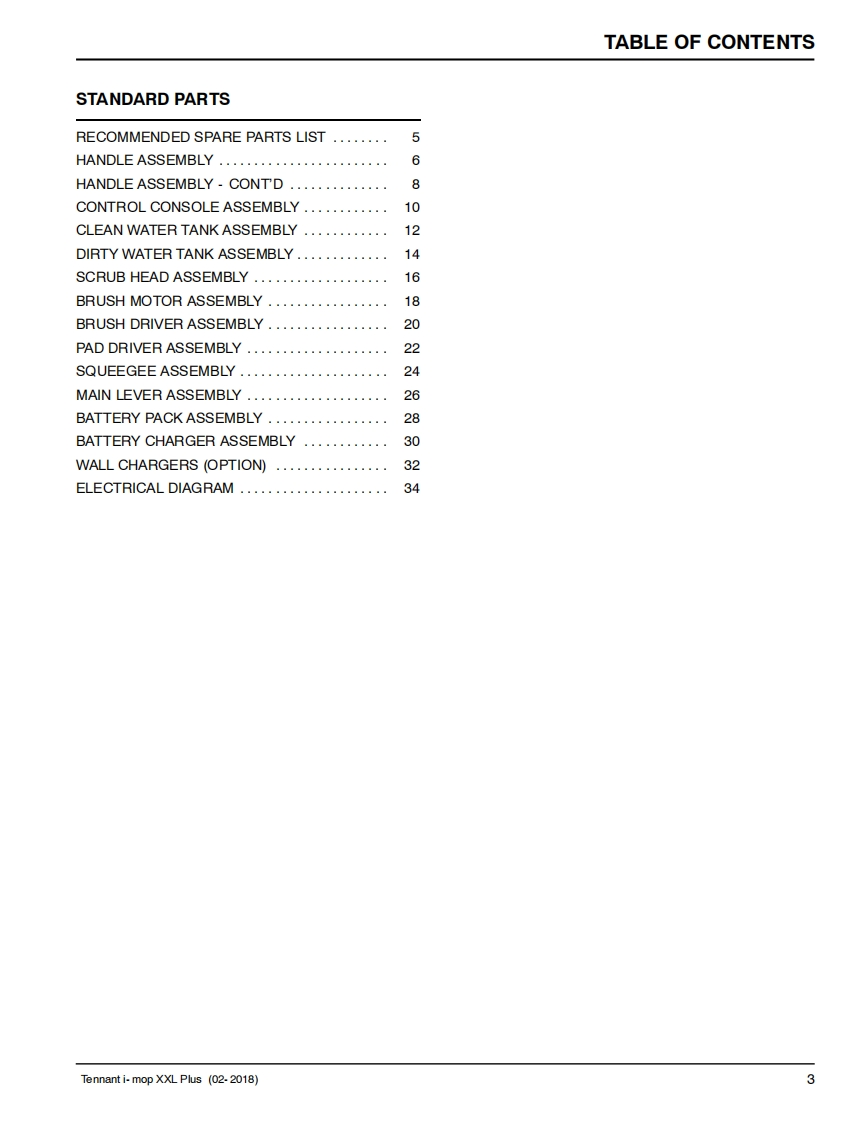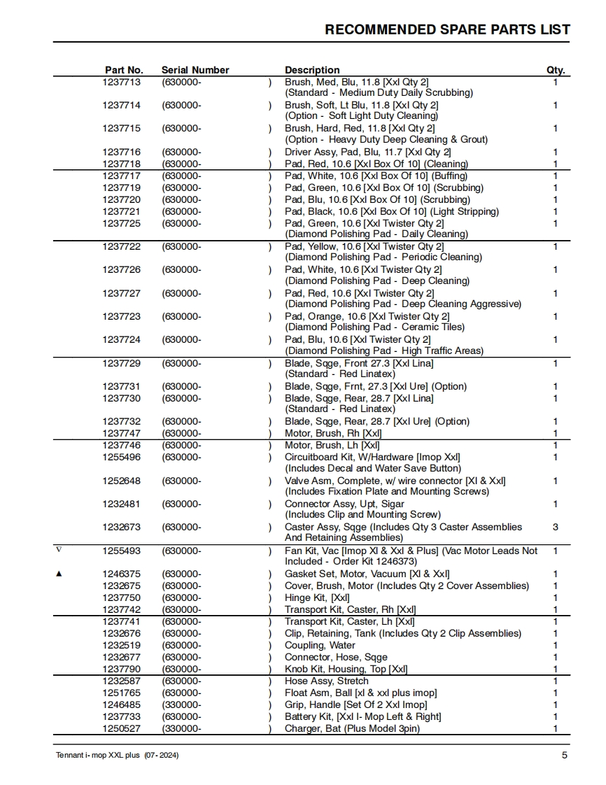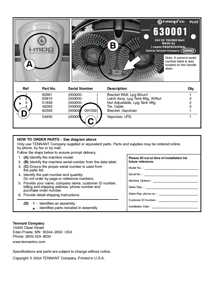 TENNANTi-mopXXL plusSCRUBBERParts Manual(S/N630000-Model Part No.1251235-i-mop XXL plus w/charger battery9021099-i-mop XXL plus w/charger extra battery1250527-i-charge 2 battery chargerNorth America /International9020955▣▣For the latest Parts manuals and otherReV.03(07-2024)language Operator manuals,visit:www.tennantco.com/manuals
