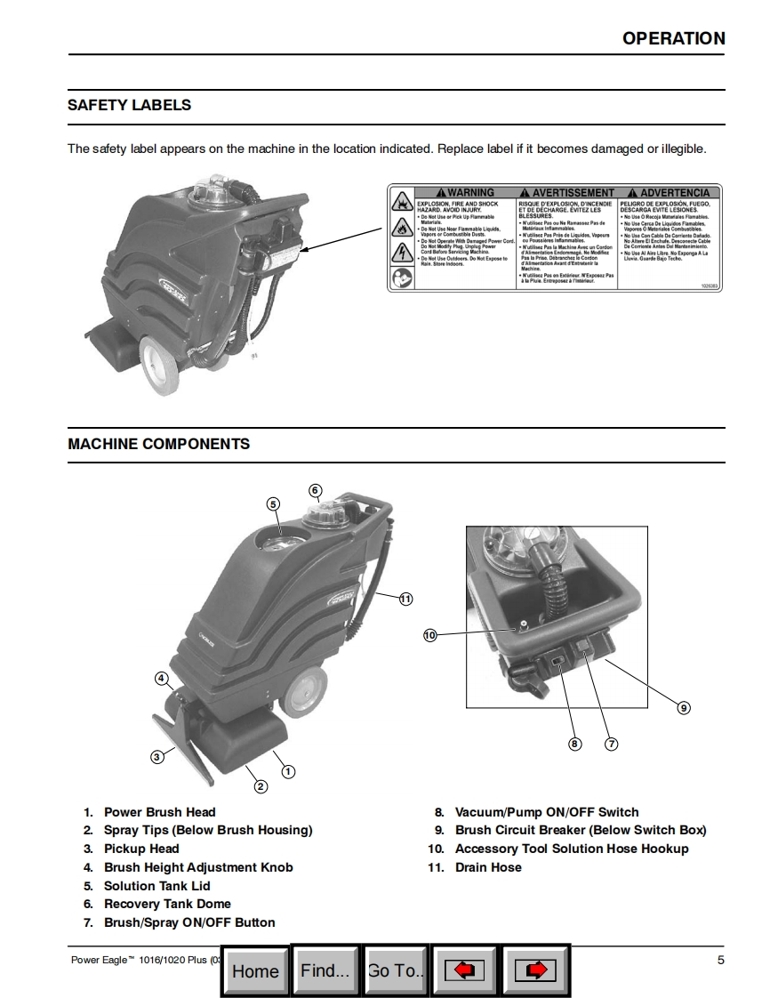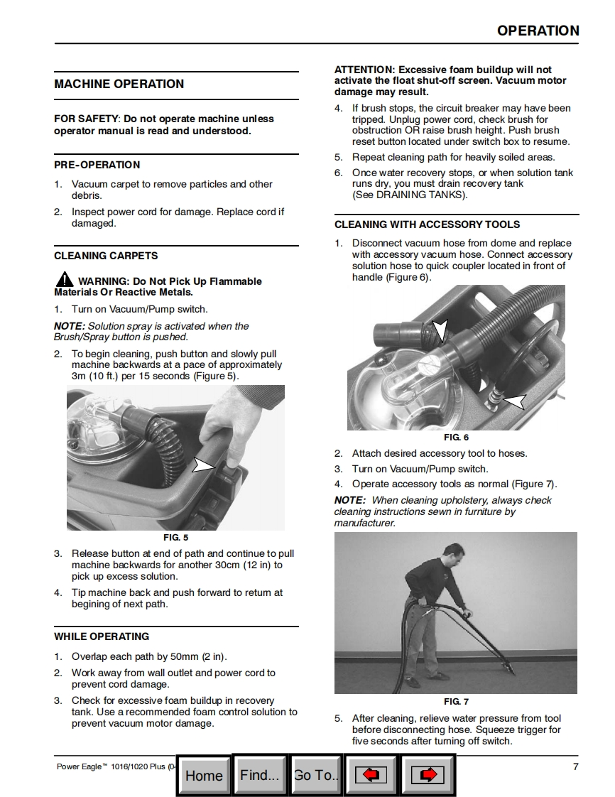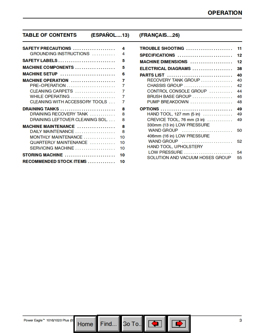 ENGLISH-ESPANOL-FRANCAISONOBLESPower EagleN1016/1020PusSelf-Contained Carpet ExtractorAspirador para moquetas con deposito incorporadoNettoyeur de moquettes autonomeModel No.:Operator and Parts Manual1002564-1016Manual del Operador y Piezas1002556-1020Operateur Manuel et Liste Des PiecesONOBLES613276ReV.02(03-2006)HomeFind...Go To.