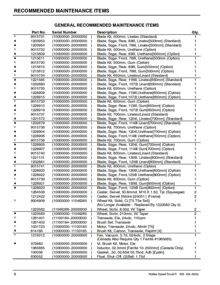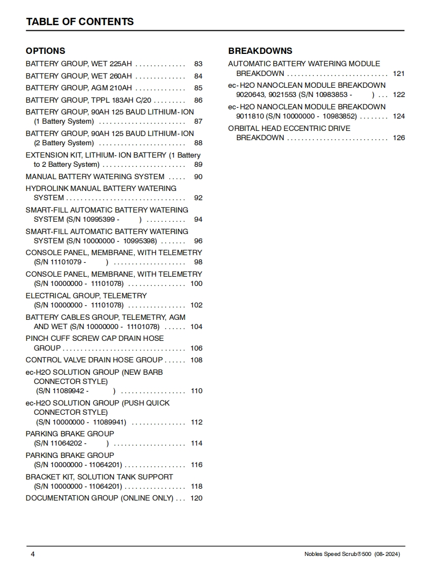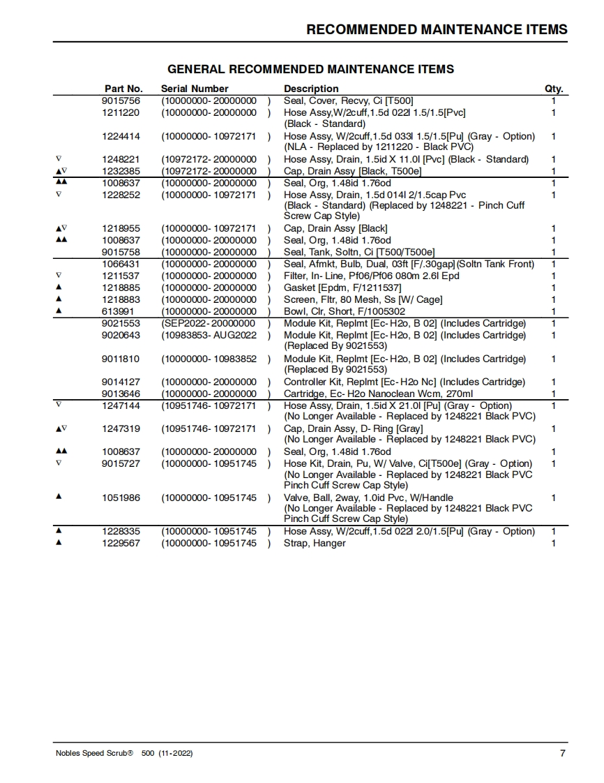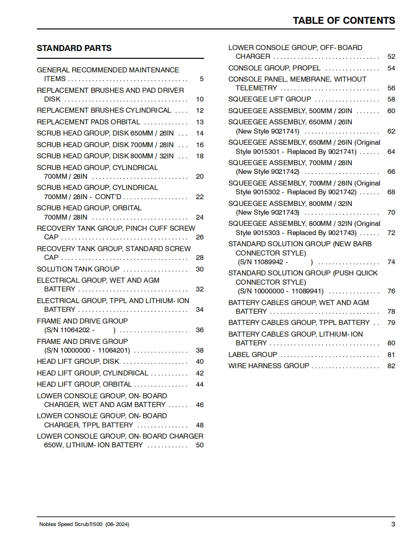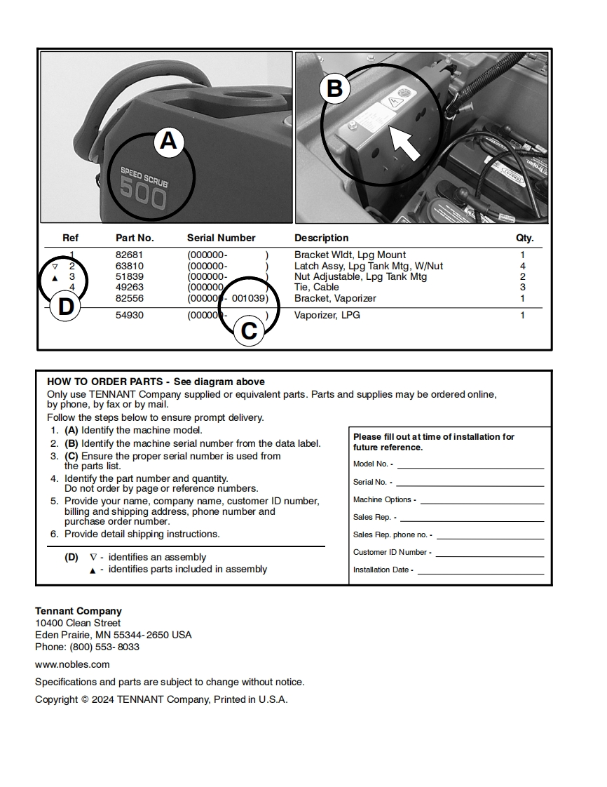NNOBLESTennantTrue@PartsIRISa Tennant TechnologySPEED SCRUB®500Insta-FitTM AdapterSmart-FillTM Automatic Battery WateringWALK-BEHIND FLOOR SCRUBBER(S/N10000000-20000000)PARTS MANUALNanoCleanLITHIUM-ION0】9015512For the latest Parts manuals and otherlanguage Operator manuals,visit:Rev.10(08-2024)www.nobles.com/manuals