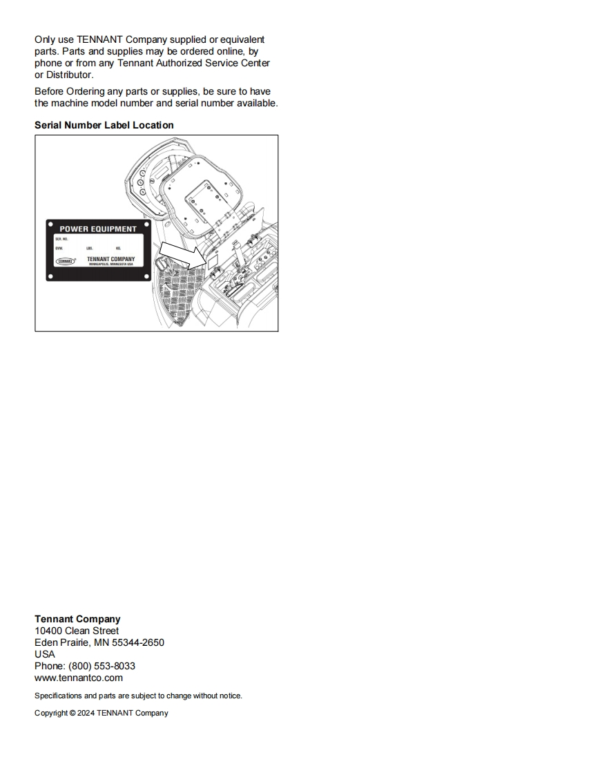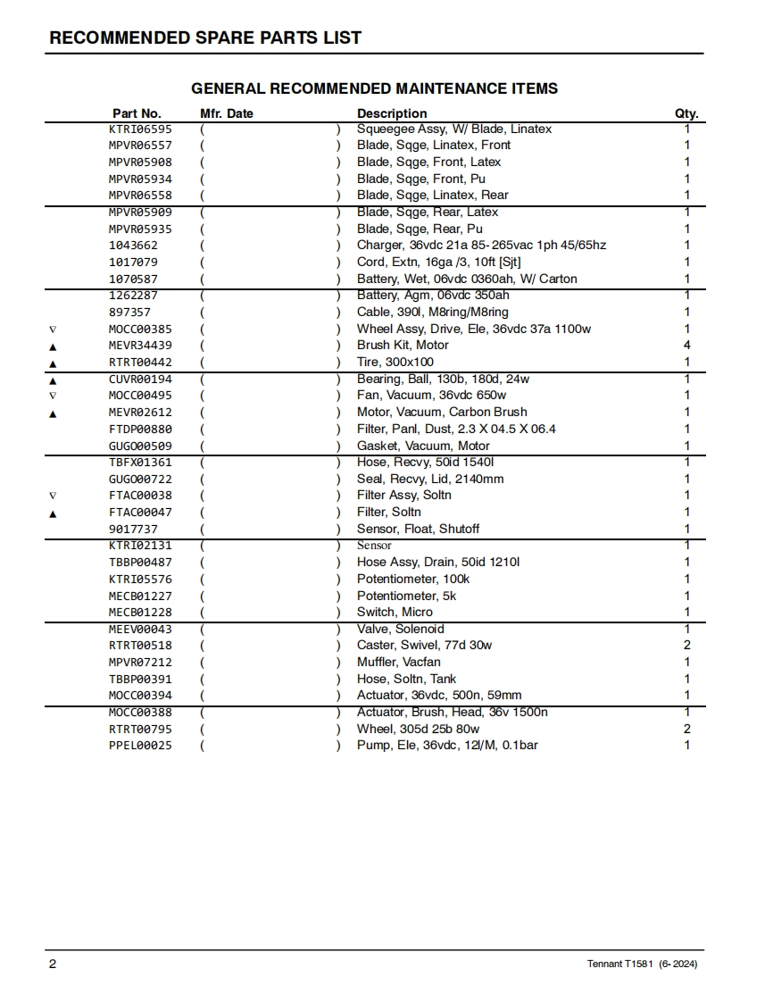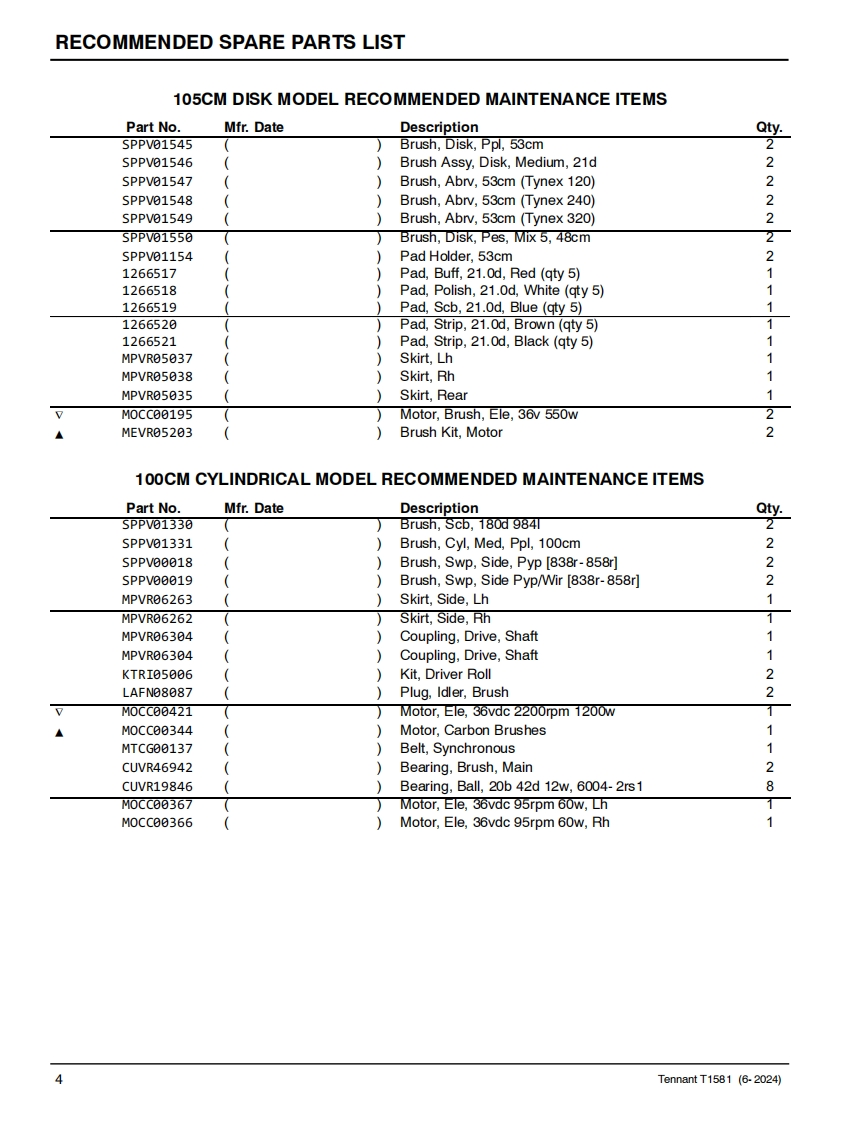 TENNANTT1581Rider Floor ScrubberParts ManualModel Part No.:LPTB03507-SCRUBBER [T1581,105CM DISK,W/O BATT,NA]LPTB03508-SCRUBBER IT1581.100CM CYL.W/O BATT.NA]TennantTrue@PartsNorth AmericaTo view.print or downloadthe parts manual,visit:9022706www.tennantco.com/manualsRev.01(06-2024)