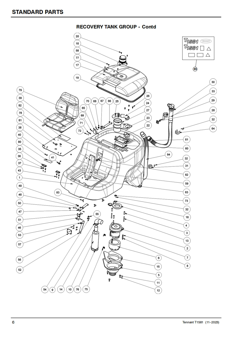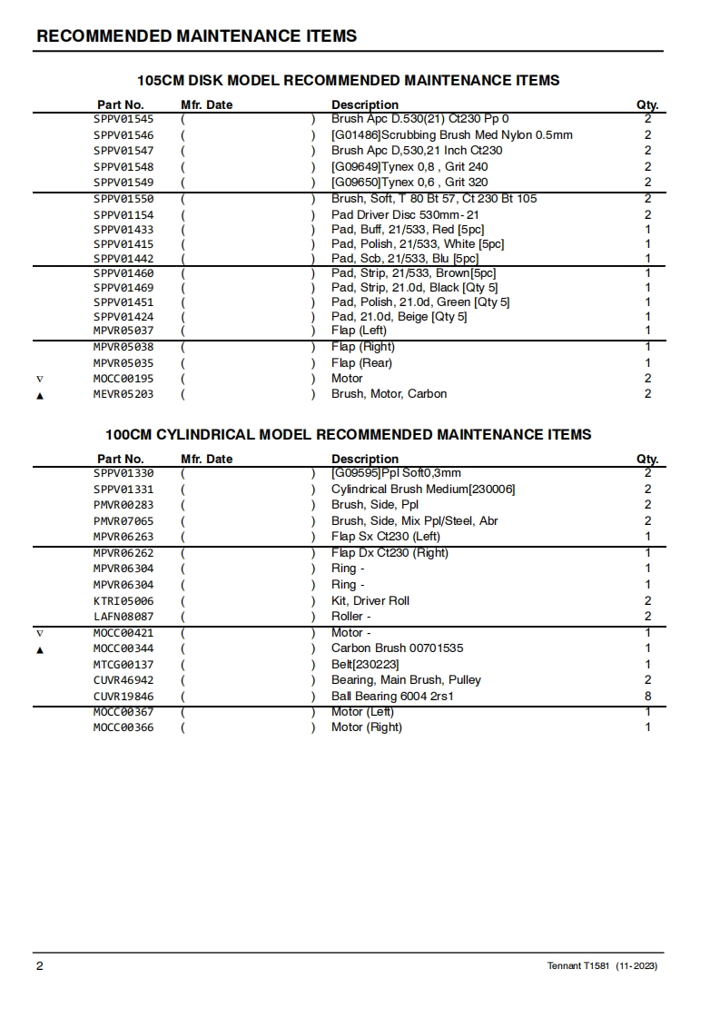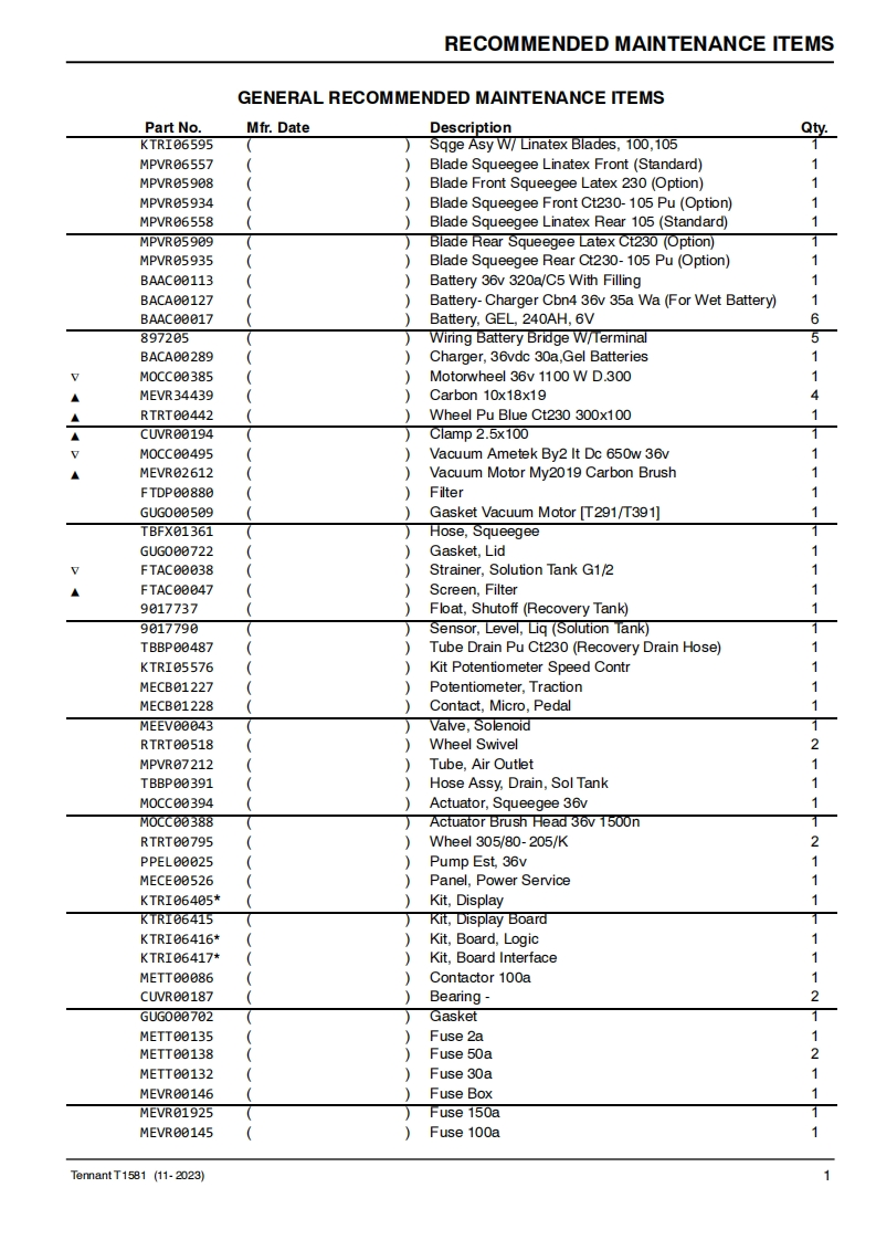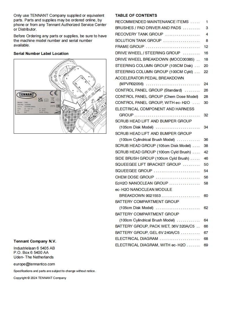 TENNANTT1581Rider Floor ScrubberParts ManualModel Part No.:LPTB03501-SCRUBBER [T581 105CM DISK,W/O BATT.EMEALPTB03502-SCRUBBER [T581.100CM CYL.W/O BATT.EMEA]LPTB03503-SCRUBBER IT581 105CM DISK.240AH GEL.EMEAILPTB03504-SCRUBBER [T581,100CM CYL,240AH GEL,EMEA]LPTB03505-SCRUBBER IT581 105CM DISK.EC-H20 NANOCLEAN/CHEM DOSE.320AH WET.EMEA]LPTB03506-SCRUBBER [T581 100CM CYL.EC-H2O NANOCLEAN/CHEM DOSE.320AH WET.EMEA]LPTB03534-SCRUBBER [T581 105CM DISK.CHEM DOSE.320AH WET.EMEA]LPTB03535-SCRUBBER T581 100CM CYL.CHEM DOSE.320AH WET.EMEA]LPTB03539-SCRUBBER [T581 105CM DISK,EC-H2O NANOCLEAN/CHEM DOSE,240AH GEL,EMEA]Tennant True®PartsEuropeTo view.print or downloadthe parts manual,visit:9022705www.tennantco.com/manualsRev.01(03-2024)