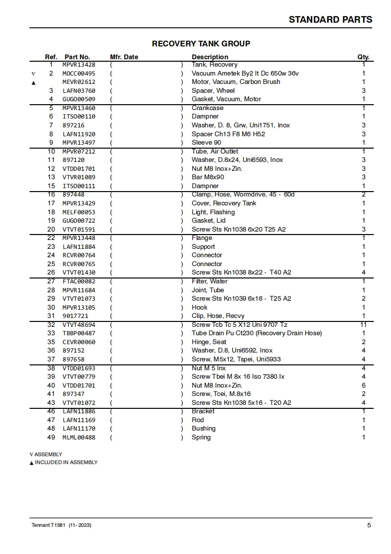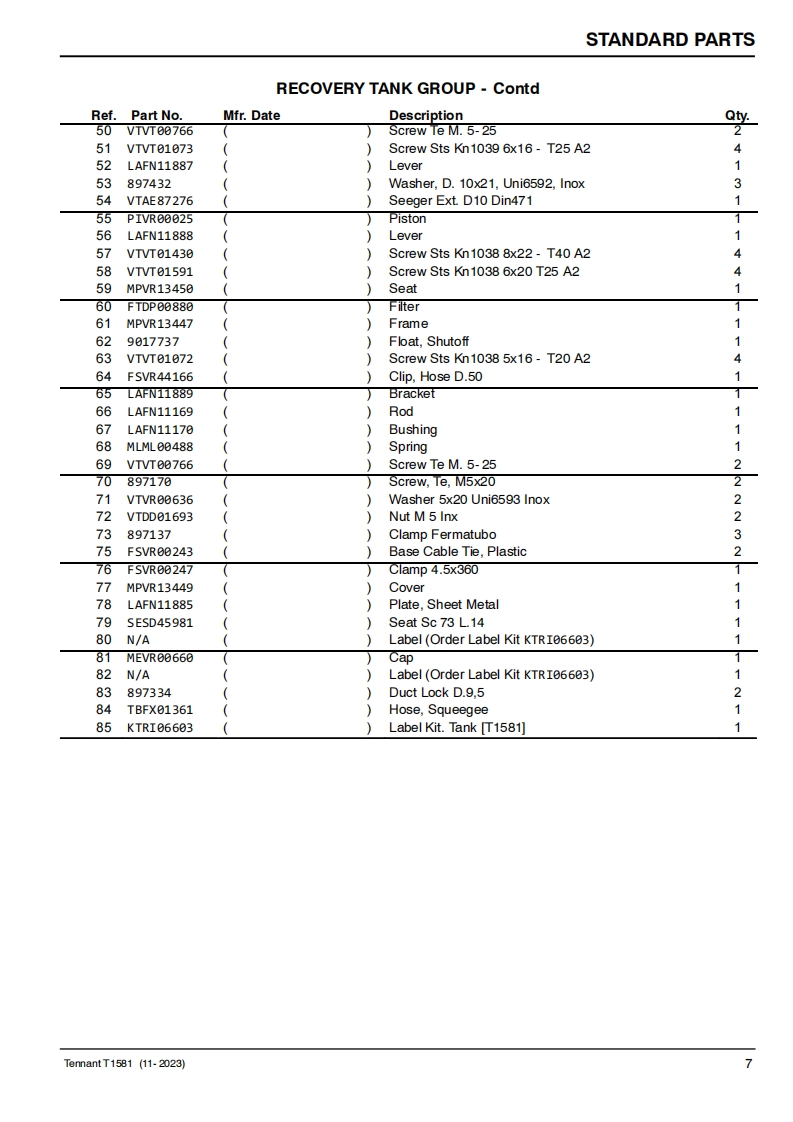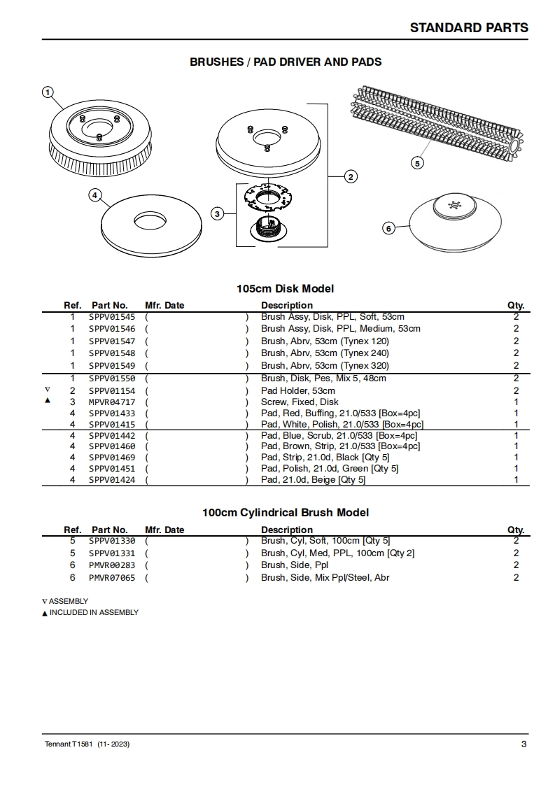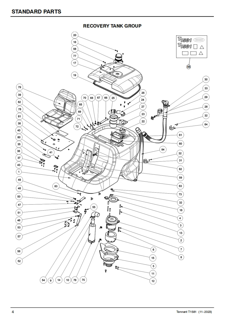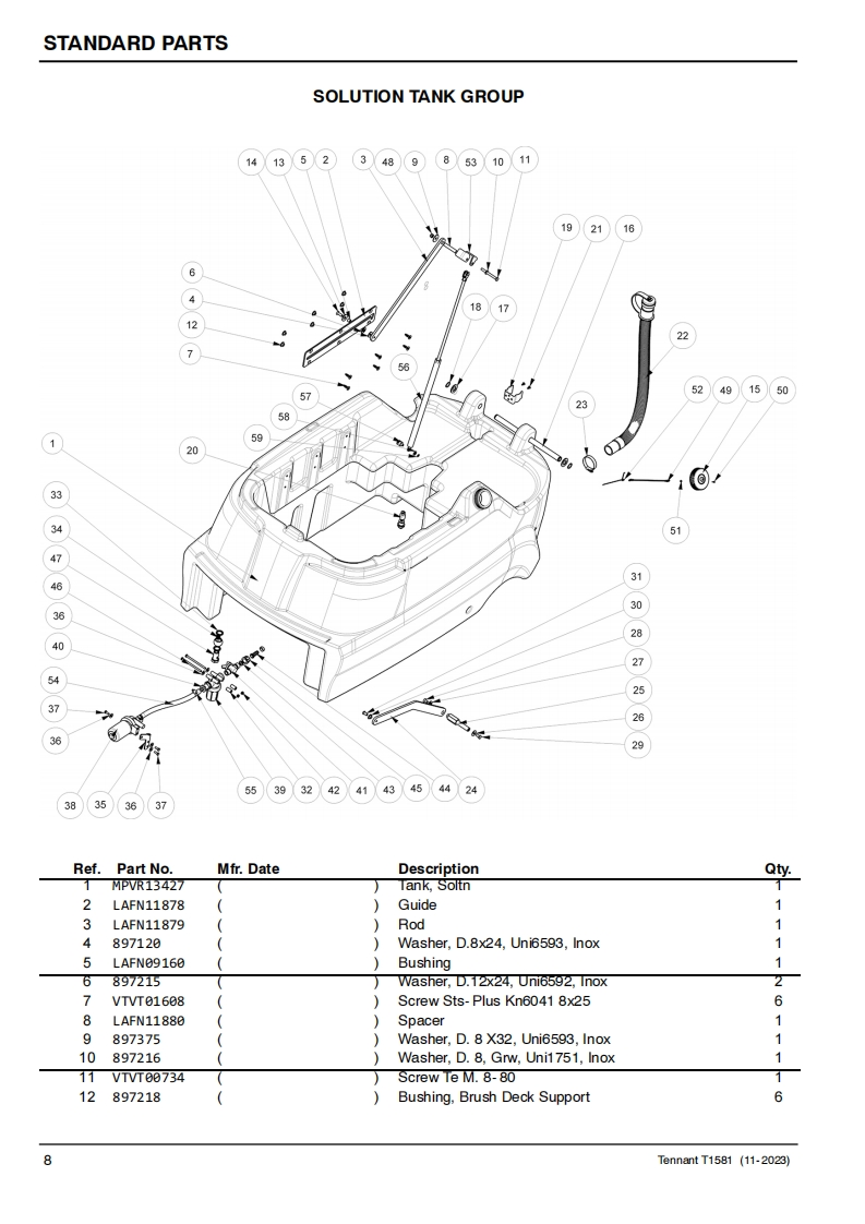 TENNANTT1581Rider Floor ScrubberParts ManualModel Part No.:LPTB03501-SCRUBBER [T581 105CM DISK,W/O BATT.EMEALPTB03502-SCRUBBER [T581.100CM CYL.W/O BATT.EMEA]LPTB03503-SCRUBBER IT581 105CM DISK.240AH GEL.EMEAILPTB03504-SCRUBBER [T581,100CM CYL,240AH GEL,EMEA]LPTB03505-SCRUBBER IT581 105CM DISK.EC-H20 NANOCLEAN/CHEM DOSE.320AH WET.EMEA]LPTB03506-SCRUBBER [T581 100CM CYL.EC-H2O NANOCLEAN/CHEM DOSE.320AH WET.EMEA]LPTB03534-SCRUBBER [T581 105CM DISK.CHEM DOSE.320AH WET.EMEA]LPTB03535-SCRUBBER T581 100CM CYL.CHEM DOSE.320AH WET.EMEA]LPTB03539-SCRUBBER [T581 105CM DISK,EC-H2O NANOCLEAN/CHEM DOSE,240AH GEL,EMEA]Tennant True®PartsEuropeTo view.print or downloadthe parts manual,visit:9022705www.tennantco.com/manualsRev.01(03-2024)